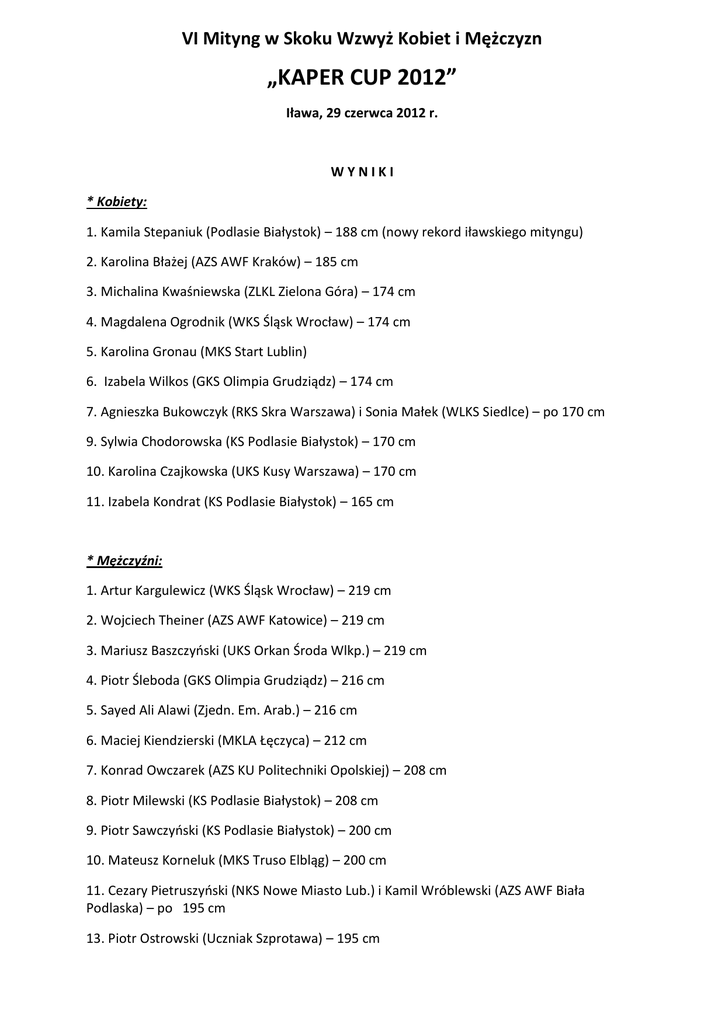 VI Mityng w Skoku Wzwyż Kobiet i Mężczyzn „KAPER CUP 2012” Iława, 29 czerwca 2012 r. WYNIKI * Kobiety: 1. Kamila Stepaniuk (Podlasie Białystok) – 188 cm (nowy rekord iławskiego mityngu) 2. Karolina Błażej (AZS AWF Kraków) – 185 cm 3. Michalina Kwaśniewska (ZLKL Zielona Góra) – 174 cm 4. Magdalena Ogrodnik (WKS Śląsk Wrocław) – 174 cm 5. Karolina Gronau (MKS Start Lublin) 6. Izabela Wilkos (GKS Olimpia Grudziądz) – 174 cm 7. Agnieszka Bukowczyk (RKS Skra Warszawa) i Sonia Małek (WLKS Siedlce) – po 170 cm 9. Sylwia Chodorowska (KS Podlasie Białystok) – 170 cm 10. Karolina Czajkowska (UKS Kusy Warszawa) – 170 cm 11. Izabela Kondrat (KS Podlasie Białystok) – 165 cm * Mężczyźni: 1. Artur Kargulewicz (WKS Śląsk Wrocław) – 219 cm 2. Wojciech Theiner (AZS AWF Katowice) – 219 cm 3. Mariusz Baszczyński (UKS Orkan Środa Wlkp.) – 219 cm 4. Piotr Śleboda (GKS Olimpia Grudziądz) – 216 cm 5. Sayed Ali Alawi (Zjedn. Em. Arab.) – 216 cm 6. Maciej Kiendzierski (MKLA Łęczyca) – 212 cm 7. Konrad Owczarek (AZS KU Politechniki Opolskiej) – 208 cm 8. Piotr Milewski (KS Podlasie Białystok) – 208 cm 9. Piotr Sawczyński (KS Podlasie Białystok) – 200 cm 10. Mateusz Korneluk (MKS Truso Elbląg) – 200 cm 11. Cezary Pietruszyński (NKS Nowe Miasto Lub.) i Kamil Wróblewski (AZS AWF Biała Podlaska) – po 195 cm 13. Piotr Ostrowski (Uczniak Szprotawa) – 195 cm
