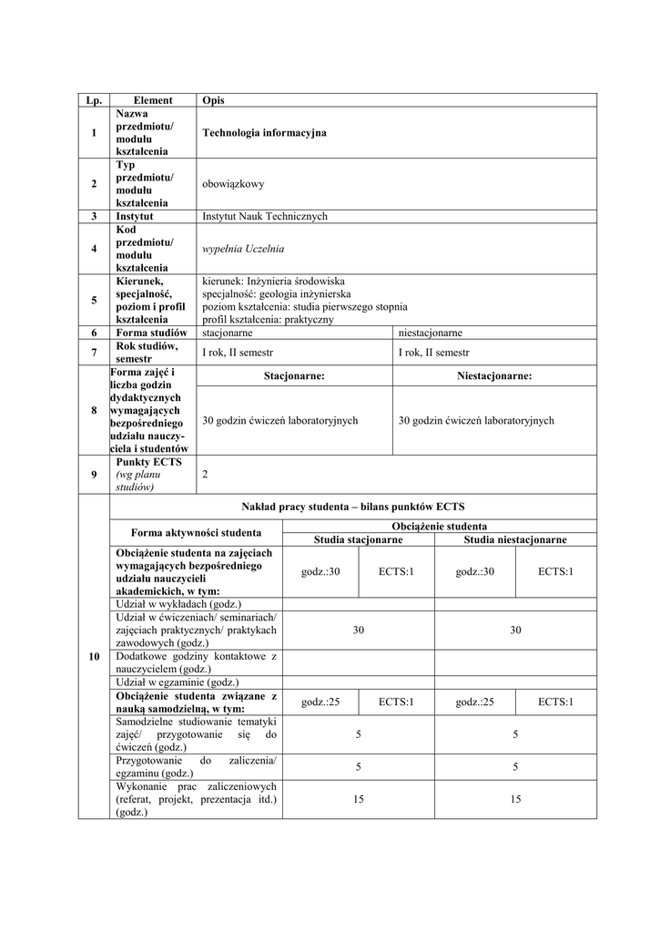 Lp. 1 2 3 4 5 6 7 8 9 Element Nazwa przedmiotu/ modułu kształcenia Typ przedmiotu/ modułu kształcenia Instytut Kod przedmiotu/ modułu kształcenia Kierunek, specjalność, poziom i profil kształcenia Forma studiów Rok studiów, semestr Forma zajęć i liczba godzin dydaktycznych wymagających bezpośredniego udziału nauczyciela i studentów Punkty ECTS (wg planu studiów) Opis Technologia informacyjna obowiązkowy Instytut Nauk Technicznych wypełnia Uczelnia kierunek: Inżynieria środowiska specjalność: geologia inżynierska poziom kształcenia: studia pierwszego stopnia profil kształcenia: praktyczny stacjonarne niestacjonarne I rok, II semestr I rok, II semestr Stacjonarne: Niestacjonarne: 30 godzin ćwiczeń laboratoryjnych 30 godzin ćwiczeń laboratoryjnych 2 Nakład pracy studenta – bilans punktów ECTS Forma aktywności studenta 10 Obciążenie studenta na zajęciach wymagających bezpośredniego udziału nauczycieli akademickich, w tym: Udział w wykładach (godz.) Udział w ćwiczeniach/ seminariach/ zajęciach praktycznych/ praktykach zawodowych (godz.) Dodatkowe godziny kontaktowe z nauczycielem (godz.) Udział w egzaminie (godz.) Obciążenie studenta związane z nauką samodzielną, w tym: Samodzielne studiowanie tematyki zajęć/ przygotowanie się do ćwiczeń (godz.) Przygotowanie do zaliczenia/ egzaminu (godz.) Wykonanie prac zaliczeniowych (referat, projekt, prezentacja itd.) (godz.) Obciążenie studenta Studia stacjonarne Studia niestacjonarne godz.:30 ECTS:1 godz.:30 30 godz.:25 ECTS:1 30 ECTS:1 godz.:25 ECTS:1 5 5 5 5 15 15 11 12 13 14 Obciążenie studenta w ramach zajęć związanych z praktycznym godz.: ECTS: godz.: ECTS: przygotowaniem zawodowym Suma (obciążenie studenta na zajęciach wymagających bezpośredniego godz.:55 ECTS:2 godz.:55 ECTS:2 udziału nauczycieli akademickich oraz związane z nauką samodzielną) Nauczyciel akademicki odpowiedzialny dr Agnieszka Janas za przedmiot/ moduł (egzaminujący) Nauczyciele akademiccy dr Agnieszka Janas prowadzący przedmiot/ moduł Wymagania Podstawowa znajomość oprogramowania komputerowego oraz treści technologii (kompetencje) informacyjnej objętych programem nauczania w szkole średniej. wstępne Podstawowym celem przedmiotu jest wykształcenie u studentów umiejętności Założenia i cele sprawnej obsługi komputera i programów użytkowych (system operacyjny, programy z pakietu biurowego Microsoft Office: edytor tekstu, arkusz kalkulacyjny, baza przedmiotu danych). Opis efektów kształcenia w zakresie: 15 Efekty kształcenia 16 Treści kształcenia 17 Stosowane metody dydaktyczne Odniesienie do kierunkowych efektów kształcenia Odniesienie do efektów kształcenia dla obszaru WIEDZY Student orientuje się w nowych W1 technologiach stosowanych w celu K_W21 T1P_W03 usprawnienia pracy inżyniera środowiska. Zna podstawowe pojęcia związane z technologią informacyjną, urządzenia K_W01 W2 T1P_W01 informatyczne i typy oprogramowania, w tym pakiet biurowy. UMIEJĘTNOŚCI W samodzielnej nauce student potrafi U1 K_U14 T1P_U01 wykorzystywać elektroniczne źródła wiedzy. Student potrafi tworzyć i edytować dokumenty, realizować podstawowe U2 K_U17 T1P_U07 operacje w arkuszu kalkulacyjnym, projektować bazy danych KOMPETENCJI SPOŁECZNYCH Student ma świadomość odpowiedzialności za pracę własną oraz gotowość K1 podporządkowania się zasadom pracy w K_K08 T1P_K03 zespole i ponoszenia odpowiedzialności za wspólnie realizowane zadania Wprowadzenie do zagadnień technologii informacyjnej. Edytowanie tekstów. Arkusz kalkulacyjny. Relacyjne bazy danych – projektowanie i tworzenie. Prezentacje multimedialne. Wyszukiwanie informacji w Internecie. Nowe technologie w Inżynierii Środowiska. Elementy wykładu z prezentacja multimedialną. Wykonywanie ćwiczeń (zadań). Ćwiczenia obejmują także dyskusję, przygotowywanie projektów, prezentacji, referatów, pracę indywidualną i zespołową. Metody weryfikacji efektów 18 kształcenia (w odniesieniu do poszczególnych efektów) 19 Kryteria oceny osiągniętych efektów kształcenia Efekt kształcenia W1 Sposób weryfikacji efektów kształcenia np. egzamin ustny, egzamin pisemny, zaliczenie ustne, kolokwium, projekt, referat, prezentacja, sprawozdanie, dyskusje, obserwacja w czasie zajęć itd. kolokwium, prezentacja W2 Kolokwium U1 Referat U2 kolokwium, projekt wykonany w zespole dwuosobowym K1 projekt wykonany w zespole dwuosobowym Kryteria oceny osiągniętych efektów kształcenia: 0-18,5 pkt – ndst – student nie osiągnął wymaganych efektów kształcenia 18,75-20,75 pkt – dst - student osiągnął efekty kształcenia w stopniu dostatecznym 21-23,75 pkt - +dst - student osiągnął efekty kształcenia w stopniu dostatecznym plus 24-26,75 pkt – db - student osiągnął efekty kształcenia w stopniu dobrym 27-29,75 pkt - +db - student osiągnął efekty kształcenia w stopniu dobrym plus >30 pkt – bdb – student osiągnął efekty kształcenia w stopniu bardzo dobrym Forma zakończenia przedmiotu: zaliczenie z oceną. W ramach ćwiczeń student zdaje trzy kolokwia: (1) sprawdzające jego znajomość podstawowych pojęć związanych z technologią informacyjną oraz rozeznanie w nowych technologiach stosowanych w celu usprawnienia pracy inżyniera środowiska (2) sprawdzające jego umiejętność posługiwania się edytorem tekstu MS WORD i (3) arkuszem kalkulacyjnym MS EXCEL – za każde z kolokwiów (1-3) student ma możliwość zdobyć maksymalnie 10 punktów. Ponadto student ma przygotować: (a) prezentację na temat: „Najnowsze nowinki technologiczne stosowane w inżynierii środowiska”, (b) referat, w którym przedstawi analizę porównawczą wybranych stron internetowych poświęconych tematyce związanej z inżynierią środowiska oraz (c) projekt bazy danych. Za każde opracowanie (a-c) student ma możliwość zdobyć maksymalnie 2 pkt. Łącznie student może zdobyć 36 punktów. Dodatkowo studenci mogą