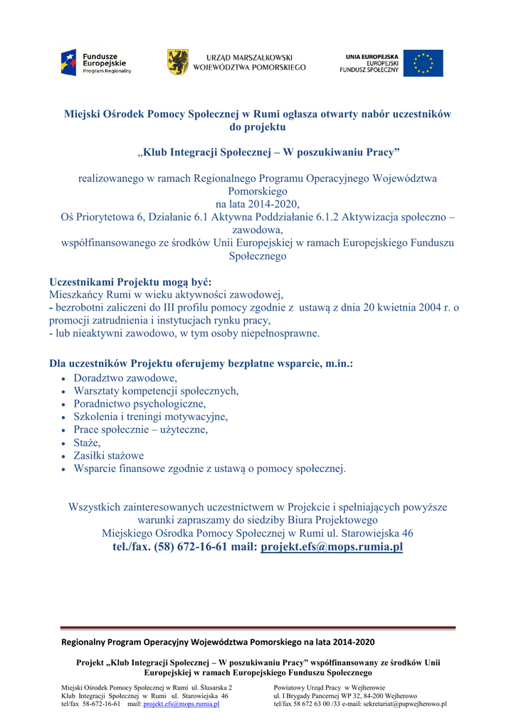 Miejski Ośrodek Pomocy Społecznej w Rumi ogłasza otwarty nabór uczestników do projektu „Klub Integracji Społecznej – W poszukiwaniu Pracy” realizowanego w ramach Regionalnego Programu Operacyjnego Województwa Pomorskiego na lata 2014-2020, Oś Priorytetowa 6, Działanie 6.1 Aktywna Poddziałanie 6.1.2 Aktywizacja społeczno – zawodowa, współfinansowanego ze środków Unii Europejskiej w ramach Europejskiego Funduszu Społecznego Uczestnikami Projektu mogą być: Mieszkańcy Rumi w wieku aktywności zawodowej, - bezrobotni zaliczeni do III profilu pomocy zgodnie z ustawą z dnia 20 kwietnia 2004 r. o promocji zatrudnienia i instytucjach rynku pracy, - lub nieaktywni zawodowo, w tym osoby niepełnosprawne. Dla uczestników Projektu oferujemy bezpłatne wsparcie, m.in.: Doradztwo zawodowe, Warsztaty kompetencji społecznych, Poradnictwo psychologiczne, Szkolenia i treningi motywacyjne, Prace społecznie – użyteczne, Staże, Zasiłki stażowe Wsparcie finansowe zgodnie z ustawą o pomocy społecznej. Wszystkich zainteresowanych uczestnictwem w Projekcie i spełniających powyższe warunki zapraszamy do siedziby Biura Projektowego Miejskiego Ośrodka Pomocy Społecznej w Rumi ul. Starowiejska 46 tel./fax. (58) 672-16-61 mail: [email protected] Regionalny Program Operacyjny Województwa Pomorskiego na lata 2014-2020 Projekt „Klub Integracji Społecznej – W poszukiwaniu Pracy” współfinansowany ze środków Unii Europejskiej w ramach Europejskiego Funduszu Społecznego Miejski Ośrodek Pomocy Społecznej w Rumi ul. Ślusarska 2 Klub Integracji Społecznej w Rumi ul. Starowiejska 46 tel/fax 58-672-16-61 mail: [email protected] Powiatowy Urząd Pracy w Wejherowie ul. I Brygady Pancernej WP 32, 84-200 Wejherowo tel/fax 58 672 63 00 /33 e-mail: [email protected]