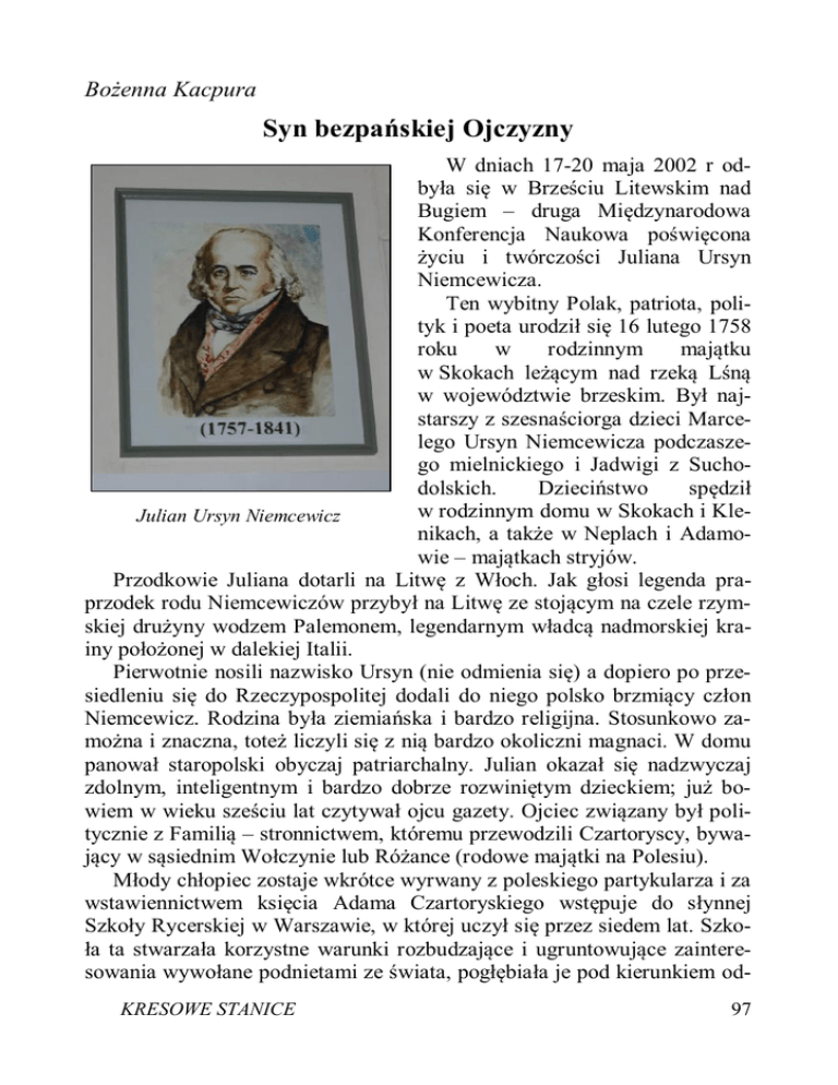 Bożenna Kacpura Syn bezpańskiej Ojczyzny W dniach 17-20 maja 2002 r odbyła się w Brześciu Litewskim nad Bugiem – druga Międzynarodowa Konferencja Naukowa poświęcona życiu i twórczości Juliana Ursyn Niemcewicza. Ten wybitny Polak, patriota, polityk i poeta urodził się 16 lutego 1758 roku w rodzinnym majątku w Skokach leżącym nad rzeką Lśną w województwie brzeskim. Był najstarszy z szesnaściorga dzieci Marcelego Ursyn Niemcewicza podczaszego mielnickiego i Jadwigi z Suchodolskich. Dzieciństwo spędził w rodzinnym domu w Skokach i KleJulian Ursyn Niemcewicz nikach, a także w Neplach i Adamowie – majątkach stryjów. Przodkowie Juliana dotarli na Litwę z Włoch. Jak głosi legenda praprzodek rodu Niemcewiczów przybył na Litwę ze stojącym na czele rzymskiej drużyny wodzem Palemonem, legendarnym władcą nadmorskiej krainy położonej w dalekiej Italii. Pierwotnie nosili nazwisko Ursyn (nie odmienia się) a dopiero po przesiedleniu się do Rzeczypospolitej dodali do niego polsko brzmiący człon Niemcewicz. Rodzina była ziemiańska i bardzo religijna. Stosunkowo zamożna i znaczna, toteż liczyli się z nią bardzo okoliczni magnaci. W domu panował staropolski obyczaj patriarchalny. Julian okazał się nadzwyczaj zdolnym, inteligentnym i bardzo dobrze rozwiniętym dzieckiem; już bowiem w wieku sześciu lat czytywał ojcu gazety. Ojciec związany był politycznie z Familią – stronnictwem, któremu przewodzili Czartoryscy, bywający w sąsiednim Wołczynie lub Różance (rodowe majątki na Polesiu). Młody chłopiec zostaje wkrótce wyrwany z poleskiego partykularza i za wstawiennictwem księcia Adama Czartoryskiego wstępuje do słynnej Szkoły Rycerskiej w Warszawie, w której uczył się przez siedem lat. Szkoła ta stwarzała korzystne warunki rozbudzające i ugruntowujące zainteresowania wywołane podnietami ze świata, pogłębiała je pod kierunkiem odKRESOWE STANICE 97 powiednich nauczycieli, wdrażała też pewne rygory. To tu spotyka po raz pierwszy oficera, który pytając go o nazwisko stwierdził ... „no to jesteśmy krajanami” ... – ja nazywam się Tadeusz Kościuszko. Spotkanie tych dwóch osób miało wielki wpływ w późniejszym czasie nie tylko na ich życie osobiste ale także na losy narodu i kraju. Obaj stali się wybitnymi postaciami, bohaterami, wielkimi Synami bezpańskiej Ojczyzny i pięknej Ziemi Poleskiej. Wielkimi indywidualnościami Kresów Wschodnich. Doświadczenia i wspomnienia rodzinne, które spisał w „Pamiętnikach czasów moich” uprzytomniły mu wcześnie, iż Ojczyzna jest krajem bezpańskim, narażonym na przemarsze i rekwizycje wojsk rosyjskich, czy wojnę domową w formie konfederacji. Dom rodzinny, krewniacy i sąsiedztwo często stawać musieli na co dzień oko w oko z obcym gwałtem, a także pozbawieni puklerza, jaki stanowią organy własnego państwa i jego siła. Były to ciężkie czasy i próby dla suwerenności szlacheckiego dominium i suwerenności, jaką szlachta wywojowała dla siebie. Kultywowanie w jej obrębie rzeczywistych cnót ziemiańsko-rycerskich i domowych a nawet wolności samej szlachty – okazywały się iluzoryczne i często doznawała ucisku od obcych. W konferencji wzięło udział około 200 osób z Białorusi, Polski, Litwy, Ukrainy, Francji, Kanady i USA. Wśród zaproszonych gości swoją obecność zaznaczyli potomkowie wielkiego Polaka, którzy stanowią dziś siódme i ósme pokolenie. Mieszkają nie tylko w Polsce ale we Francji, Kanadzie i USA. Konferencję zorganizowały Stowarzyszenie Społeczne Polska Macierz Szkolna „POLESIE” i Konsulat Generalny Polskiej Rzeczypospolitej w Brześciu Litewskim. Zasadniczym jej celem było przybliżenie uczestnikom pięknej biografii, a także twórczości tego Wielkiego Polaka. W programie dobrze działającej organizacji polskiej i daleko idącej pomocy Polskiego Konsulatu, jest opracowany długotrwały cykl konferencji popularno-naukowych poświęconych słynnym rodakom urodzonym na Ziemi Poleskiej. Ziemi, która posiada duże zróżnicowanie gleb. Przeważnie są one bielicowe silniej występujące na wysocczyźnie, słabiej na pojezierzach, północno-zachodniej części obszaru terytorium i nad Dźwiną. Na nizinie poleskiej dominują tereny piaszczyste, często zabagnione z pokładami torfu, a także sporymi lasami. Bagniste Polesie obejmuje obwody brzeski 32.300 km2 i homelski 40.400 km2. Toteż homo sapiens zaczął egzystować najpierw niemal bezradny wobec potężnej przyrody, aby stopniowo i powoli uniezależniać się od niej, oraz ją sobie podpo98 KRESOWE STANICE Kościół Podwyższenia Krzyża w Brześciu Fot . Janusz Szuba rządkowywać. Równiny przeważają na południu i wschodzie. Nizina Poleska obejmuje niemal całą część dorzecza Prypeci i jest silnie zabagniona. Bagna i ogromne bory, były przez kilka wieków zdradliwe dla wroga, który nie był zbyt dobrze obeznany z owym terenem, a ten dawał znakomite warunki do obrony swoich przed obcymi i nieproszonymi. Organizatorzy uważają za swój wielki obowiązek ocalić od zapomnienia postacie wielkich autorytetów i wzorów moralnych jakimi byli wywodzący się stąd Wielcy Polscy Ziomkowie – dla przykładu chociażby Maria Rodziewiczówna, Tadeusz Kościuszko, Tadeusz Rejtan, czy Krystyna Krachelska i wielu, wielu innych. Sięganie bardzo głęboko do polskich korzeni, czerpanie ze skarbnicy przeszłości jest bodajże najlepszą, najwartościowszą i żywą lekcją polskiej bogatej i pięknej, aczkolwiek bardzo tragicznej historii dla współczesnego pokolenia Kresowiaków. Kresowiaków rozsianych po całym świecie, zwłaszcza zaś po drugiej wojnie światowej, jak i tych mieszkających tu na miejscu, którzy przetrwali i są mocnymi filarami tej mlekiem i miodem płynącej ongiś krainy. Bo nie jest sztuką być Polakiem, żyć, uczyć się i pracować w Ojczyźnie, ale sztuką jest być Polakiem, żyć, uczyć się i praKRESOWE STANICE 99 cow