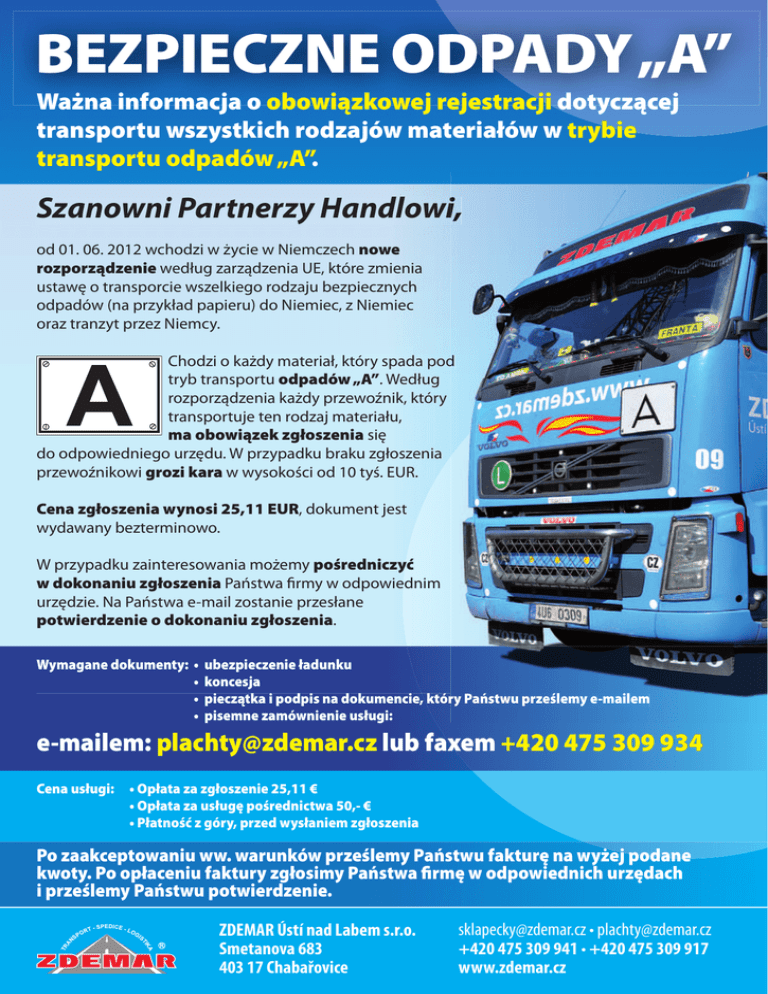 BEZPIECZNE ODPADY „A” Ważna informacja o obowiązkowej rejestracji dotyczącej transportu wszystkich rodzajów materiałów w trybie transportu odpadów „A”. Szanowni Partnerzy Handlowi, od 01. 06. 2012 wchodzi w życie w Niemczech nowe rozporządzenie według zarządzenia UE, które zmienia ustawę o transporcie wszelkiego rodzaju bezpiecznych odpadów (na przykład papieru) do Niemiec, z Niemiec oraz tranzyt przez Niemcy. d Chodzi o każdy materiał, który spada pod tryb transportu odpadów „A”. Według rozporządzenia każdy przewoźnik, który transportuje ten rodzaj materiału, ma obowiązek zgłoszenia się do odpowiedniego urzędu. W przypadku braku zgłoszenia przewoźnikowi grozi kara w wysokości od 10 tyś. EUR. Cena zgłoszenia wynosi 25,11 EUR, dokument jest wydawany bezterminowo. W przypadku zainteresowania możemy pośredniczyć w dokonaniu zgłoszenia Państwa firmy w odpowiednim urzędzie. Na Państwa e-mail zostanie przesłane potwierdzenie o dokonaniu zgłoszenia. Wymagane dokumenty: • • • • ubezpieczenie ładunku koncesja pieczątka i podpis na dokumencie, który ry Państwu prześlemy e-mailem pisemne zamównienie usługi: e-mailem: [email protected] lub faxem +420 475 309 934 Cena usługi: • Opłata za zgłoszenie 25,11 € • Opłata za usługę pośrednictwa 50,- € • Płatność z góry, przed wysłaniem zgłoszenia Po zaakceptowaniu ww. warunków prześlemy Państwu fakturę na wyżej podane kwoty. Po opłaceniu faktury zgłosimy Państwa firmę w odpowiednich urzędach i prześlemy Państwu potwierdzenie. ZDEMAR Ústí nad Labem s.r.o. Smetanova 683 403 17 Chabařovice [email protected] • [email protected] +420 475 309 941 • +420 475 309 917 www.zdemar.cz