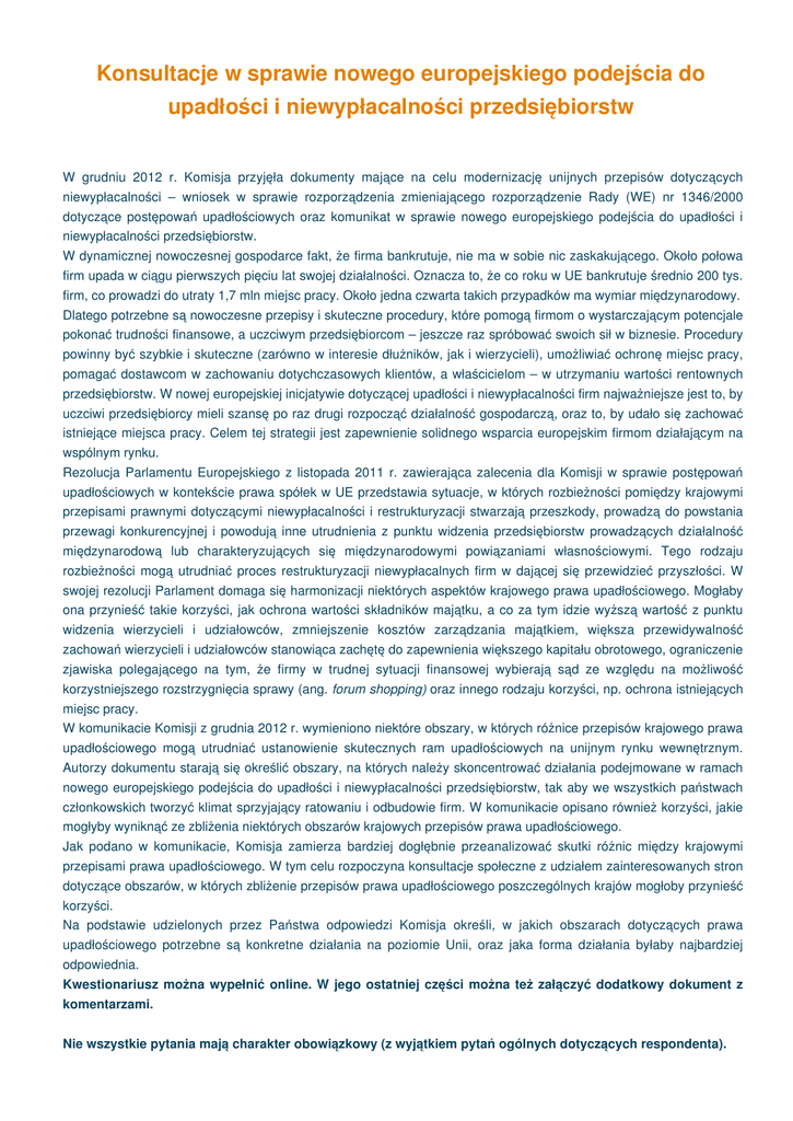 Konsultacje w sprawie nowego europejskiego podejścia do upadłości i niewypłacalności przedsiębiorstw W grudniu 2012 r. Komisja przyjęła dokumenty mające na celu modernizację unijnych przepisów dotyczących niewypłacalności – wniosek w sprawie rozporządzenia zmieniającego rozporządzenie Rady (WE) nr 1346/2000 dotyczące postępowań upadłościowych oraz komunikat w sprawie nowego europejskiego podejścia do upadłości i niewypłacalności przedsiębiorstw. W dynamicznej nowoczesnej gospodarce fakt, że firma bankrutuje, nie ma w sobie nic zaskakującego. Około połowa firm upada w ciągu pierwszych pięciu lat swojej działalności. Oznacza to, że co roku w UE bankrutuje średnio 200 tys. firm, co prowadzi do utraty 1,7 mln miejsc pracy. Około jedna czwarta takich przypadków ma wymiar międzynarodowy. Dlatego potrzebne są nowoczesne przepisy i skuteczne procedury, które pomogą firmom o wystarczającym potencjale pokonać trudności finansowe, a uczciwym przedsiębiorcom – jeszcze raz spróbować swoich sił w biznesie. Procedury powinny być szybkie i skuteczne (zarówno w interesie dłużników, jak i wierzycieli), umożliwiać ochronę miejsc pracy, pomagać dostawcom w zachowaniu dotychczasowych klientów, a właścicielom – w utrzymaniu wartości rentownych przedsiębiorstw. W nowej europejskiej inicjatywie dotyczącej upadłości i niewypłacalności firm najważniejsze jest to, by uczciwi przedsiębiorcy mieli szansę po raz drugi rozpocząć działalność gospodarczą, oraz to, by udało się zachować istniejące miejsca pracy. Celem tej strategii jest zapewnienie solidnego wsparcia europejskim firmom działającym na wspólnym rynku. Rezolucja Parlamentu Europejskiego z listopada 2011 r. zawierająca zalecenia dla Komisji w sprawie postępowań upadłościowych w kontekście prawa spółek w UE przedstawia sytuacje, w których rozbieżności pomiędzy krajowymi przepisami prawnymi dotyczącymi niewypłacalności i restrukturyzacji stwarzają przeszkody, prowadzą do powstania przewagi konkurencyjnej i powodują inne utrudnienia z punktu widzenia przedsiębiorstw prowadzących działalność międzynarodową lub charakteryzujących się międzynarodowymi powiązaniami własnościowymi. Tego rodzaju rozbieżności mogą utrudniać proces restrukturyzacji niewypłacalnych firm w dającej się przewidzieć przyszłości. W swojej rezolucji Parlament domaga się harmonizacji niektórych aspektów krajowego prawa upadłościowego. Mogłaby ona przynieść takie korzyści, jak ochrona wartości składników majątku, a co za tym idzie wyższą wartość z punktu widzenia wierzycieli i udziałowców, zmniejszenie kosztów zarządzania majątkiem, większa przewidywalność zachowań wierzycieli i udziałowców stanowiąca zachętę do zapewnienia większego kapitału obrotowego, ograniczenie zjawiska polegającego na tym, że firmy w trudnej sytuacji finansowej wybierają sąd ze względu na możliwość korzystniejszego rozstrzygnięcia sprawy (ang. forum shopping) oraz innego rodzaju korzyści, np. ochrona istniejących miejsc pracy. W komunikacie Komisji z grudnia 2012 r. wymieniono niektóre obszary, w których różnice przepisów krajowego prawa upadłościowego mogą utrudniać ustanowienie skutecznych ram upadłościowych na unijnym rynku wewnętrznym. Autorzy dokumentu starają się określić obszary, na których należy skoncentrować działania podejmowane w ramach nowego europejskiego podejścia do upadłości i niewypłacalności przedsiębiorstw, tak aby we wszystkich państwach członkowskich tworzyć klimat sprzyjający ratowaniu i odbudowie firm. W komunikacie opisano również korzyści, jakie mogłyby wyniknąć ze zbliżenia niektórych obszarów krajowych przepisów prawa upadłościowego. Jak podano w komunikacie, Komisja zamierza bardziej dogłębnie przeanalizować skutki różnic między krajowymi przepisami prawa upadłościowego. W tym celu rozpoczyna konsultacje społeczne z udziałem zainteresowanych stron dotyczące obszarów, w których zbliżenie przepisów prawa upadłościowego poszczególnych krajów mogłoby przynieść korzyści. Na podstawie udzielonych przez Państwa odpowiedzi Komisja określi, w jakich obszarach dotyczących prawa upadłościowego potrzebne są konkretne działania na poziomie Unii, oraz jaka forma działania byłaby najbardziej odpowiednia. Kwestionariusz można wypełnić online. W jego ostatniej części można też załączyć dodatkowy dokument z komentarzami. Nie wszystkie pytania mają charakter obowiązkowy (z wyjątkiem pytań ogólnych dotyczących respondenta). * Pola oznaczone gwiazdką ( ) są obowiązkowe. I. Informacje ogólne Ponieważ ważne jest uzyskanie opinii wszystkich zainteresowanych stron i podmiotów, do udziału w konsultacjach zapraszamy wszystkich zainteresowanych. Abyśmy mogli jak najlepiej przeanalizować nadesłane odpowiedzi, prosimy o podanie kilku podstawowych informacji na swój temat. * Proszę wskazać, w jakim charakterze biorą Państwo udział w tych konsultacjach: jako osoba prywatna lub osoba pracująca na własny rachunek w imieniu przedsiębiorstwa w imieniu banku, instytucji kredytowej lub funduszu inwestycyjnego jako sędzia jako syndyk masy upadłości jako osoba wykonująca inny zawód prawniczy jako doradca biznesowy lub organizacja wsparcia dla biznesu w imieniu organu administracji publicznej jako pracownik naukowy inne * Proszę określić wielkość przedsiębiorstwa: duże (zatrudniające ponad 250 pracowników) średnie (zatrudniające mniej niż 250 pracowników) małe (zatrudniające mniej niż 50 pracowników) mikro (zatrudniające mniej niż 10 pracowników) * Proszę wyjaśnić. * Czy mieli już Państwo do czynienia z postępowaniem upadłościowym? Jeśli tak, w jakim charakterze? Tak Nie * Jeżeli tak: jako wierzyciel jako pracownik firmy w związku z upadłością pracodawcy jako właściciel lub dyrektor upadłego przedsiębiorstwa 