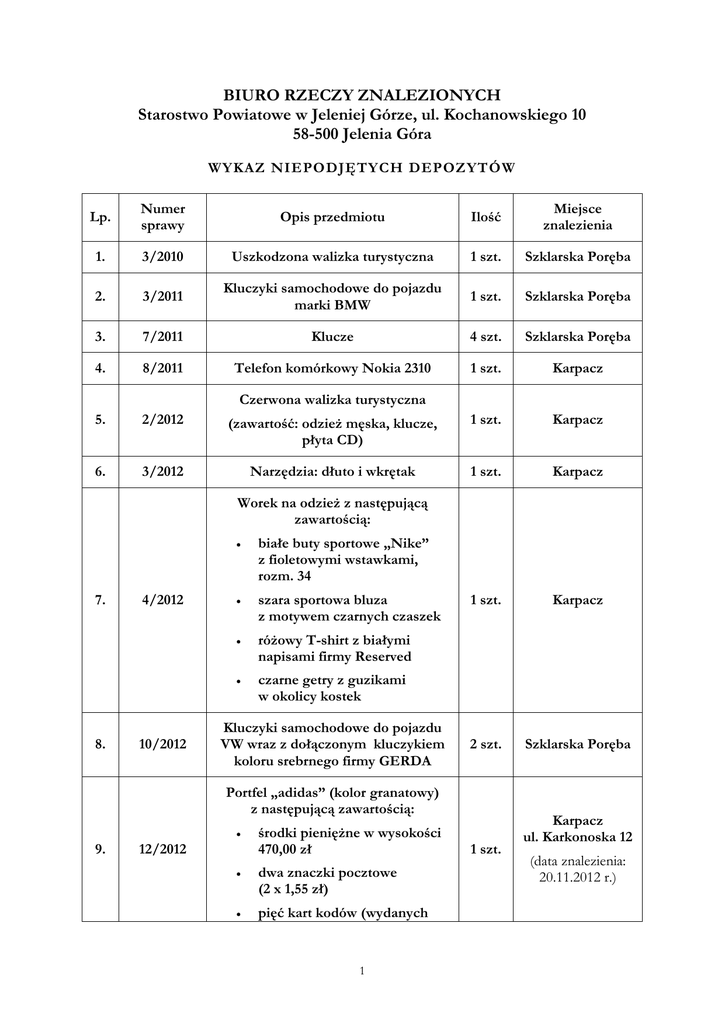 BIURO RZECZY ZNALEZIONYCH Starostwo Powiatowe w Jeleniej Górze, ul. Kochanowskiego 10 58-500 Jelenia Góra WYKAZ NIEPODJĘTYCH DEPOZYTÓW Lp. Numer sprawy Opis przedmiotu Ilość Miejsce znalezienia 1. 3/2010 Uszkodzona walizka turystyczna 1 szt. Szklarska Poręba 2. 3/2011 Kluczyki samochodowe do pojazdu marki BMW 1 szt. Szklarska Poręba 3. 7/2011 Klucze 4 szt. Szklarska Poręba 4. 8/2011 Telefon komórkowy Nokia 2310 1 szt. Karpacz Czerwona walizka turystyczna 5. 2/2012 (zawartość: odzieŜ męska, klucze, płyta CD) 1 szt. Karpacz 6. 3/2012 Narzędzia: dłuto i wkrętak 1 szt. Karpacz 1 szt. Karpacz 2 szt. Szklarska Poręba Worek na odzieŜ z następującą zawartością: 7. 8. 4/2012 10/2012 • białe buty sportowe „Nike” z fioletowymi wstawkami, rozm. 34 • szara sportowa bluza z motywem czarnych czaszek • róŜowy T-shirt z białymi napisami firmy Reserved • czarne getry z guzikami w okolicy kostek Kluczyki samochodowe do pojazdu VW wraz z dołączonym kluczykiem koloru srebrnego firmy GERDA Portfel „adidas” (kolor granatowy) z następującą zawartością: • 9. 12/2012 środki pienięŜne w wysokości 470,00 zł • dwa znaczki pocztowe (2 x 1,55 zł) • pięć kart kodów (wydanych 1 1 szt. Karpacz ul. Karkonoska 12 (data znalezienia: 20.11.2012 r.) przez Nordea Bank Polski S.A. z/s w Gdyni) • 10. 6/2013 karta bankomatowa VISA (wydana przez Bank Millenium S.A.) – przedmiotowa karta została przekazana do Banku Millennium S.A. w dniu 23.11.2012 r. Telefon komórkowy Nokia Lumia 610 o nr IMEI 353663057239434 (bez karty SIM) 1 szt. Kowary schodki pomiędzy ulicami: Jagiellończyka a Sienkiewicza (data znalezienia: 12.11.2013 r. około godz. 19:00) Karpacz okolice Hotelu 11. 12. 13. 8/2013 1/2014 2/2014 Kluczyk samochodowy do pojazdu Peugeot 1 szt. Mieszko (data znalezienia: 17.11.2013 r. po godz. 22:00) Środki pienięŜne w wysokości 50,00 zł Karpacz ul. Konstytucji 3 Maja (22.01.2014 r. około godz. 13:30) Kamera VHS C marki JVC model GR-FX14EG nr serii: 107U1834 z zasilaczem 1 szt. Karpacz murek ogradzający posesję przy ul. Piastowskiej 8 (data znalezienia: 12.07.2012 r.) 1 szt. skrzynka pocztowa przy budynku Poczty Polskiej w Szklarskiej Porębie przy ul. Jedności Narodowej 8 Szklarska Poręba 14. 5/2014 Telefon komórkowy Samsung GT-S5620 o nr IMEI 352053049100343 z kartą pamięci Kingston 512MB (bez karty SIM) (05.12.2014 r.) 2