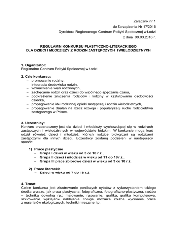 Załącznik nr 1 do Zarządzenia Nr 17/2016 Dyrektora Regionalnego Centrum Polityki Społecznej w Łodzi z dnia 08.03.2016 r. REGULAMIN KONKURSU PLASTYCZNO-LITERACKIEGO DLA DZIECI I MŁODZIEŻY Z RODZIN ZASTĘPCZYCH I WIELODZIETNYCH 1. Organizator: Regionalne Centrum Polityki Społecznej w Łodzi 2. Cele konkursu: promowanie rodziny, integracja środowiska rodzin, wzmacnianie więzi rodzinnych, zachęcanie rodzin oraz dzieci do wspólnego spędzania czasu, podkreślenie znaczenia rodziców i rodziny w kształtowaniu osobowości dziecka, propagowanie idei rodzinnej opieki zastępczej i rodzin wielodzietnych, propagowanie działań na rzecz rozwoju i popularyzacji ruchu rodzicielstwa zastępczego w Polsce. 3. Uczestnicy: Konkurs przeznaczony jest dla dzieci i młodzieży wychowującej się w rodzinach zastępczych i wielodzietnych w województwie łódzkim. W konkursie mogą brać udział również dzieci i młodzież, których rodzice biologiczni są rodzicami zastępczymi dla innych dzieci. Uczestnicy zostaną podzieleni w następujący sposób: 1) Prace plastyczne Grupa I dzieci w wieku od 3 do 10 r.ż., Grupa II dzieci i młodzież w wieku od 11 do 18 r.ż., Grupa III prace zbiorowe dzieci w wieku od 3 do 18 r.ż. 2) Prace literackie Dzieci w wieku od 7 do 18 r.ż. 4. Temat: Celem konkursu jest zilustrowanie poniższych cytatów z wykorzystaniem takiego środka wyrazu, jak praca plastyczna, fotograficzna, fotograficzno-plastyczna, rzeźba – techniką dowolną np.: malowanie, rysowanie, grafika, grafika komputerowa, szkicowanie, wyklejanie, naklejanie, collage, mozaika, rzeźba, wycinanie, prace z materiałów ekologicznych, techniki mieszane itp. W przypadku prac literackich, prace mogą mieć formę dowolną, np. wiersz, esej (opowiadanie), reportaż, wywiad, komiks. Praca literacka może być połączona z pracą plastyczną. 1) Prace plastyczne Grupa I Dzieci w wieku od 3 do 10 lat zilustrują pracę na poniższy temat: „Kartka z wycieczki” Grupa II Dzieci i młodzież w wieku od 11 do 18 lat zilustrują pracę na poniższy temat: „Najpiękniejszy zakątek województwa łódzkiego” Grupa III Dzieci i młodzież w wieku od 3 do 18 lat zilustrują pracę na poniższy temat: „Kartka z wycieczki” lub „Najpiękniejszy zakątek województwa łódzkiego” 2) Prace literackie Dzieci i młodzież w wieku od 7 do 18 lat opiszą w dowolnej formie, pracę na poniższy temat: „Moja niezapomniana przygoda” 5. Warunki konkursu: w ramach konkursu mogą być przygotowane prace plastyczne/fotograficzne/ fotograficzno-plastyczne/literackie wykonane w dowolnej technice, każdy uczestnik może przysłać maksymalnie 1 pracę wykonaną samodzielnie, uczestnicy mogą wykonać pracę zbiorową w zespole liczącym nie więcej niż 5 osób, w konkursie przyznawane są: a) nagrody główne za zdobycie I, II i III miejsca, b) wyróżnienia. wszystkie prace powinny być opisane na odwrocie pracy: a) wskazanie czy: praca plastyczna czy literacka i która grupa I/II/III; b) tytuł pracy/komentarz słowny uczestnika – autora (autorów) pracy c) imię i nazwisko autora (autorów) oraz wiek; d) adres zamieszkania; e) numer telefonu uczestnika bądź rodzica/opiekuna; osoby niepełnoletnie dołączają pisemną zgodę rodziców lub opiekunów na udział w Konkursie oraz na przetwarzanie danych osobowych przez Organizatora Konkursu w celach wynikających z regulaminu Konkursu, zgodnie z Ustawą z dnia 29.08.1997 r. o ochronie danych osobowych (j.t. Dz.U. z 2015 r. poz. 2135 z późn. zmianami) – załącznik nr 1 do regulaminu. 6. Termin składania prac: Prace wykonane zgodnie z regulaminem należy składać osobiście lub nadsyłać pocztą (w odpowiednio zabezpieczonej przesyłce na koszt nadsyłającego) w terminie do 15 kwietnia 2016 r. (decyduje data stempla pocztowego) z dopiskiem na kopercie: Konkurs plastyczno-literacki dla dzieci i młodzieży z rodzin zastępczych i wielodzietnych na adres: REGIONALNE CENTRUM POLITYKI SPOŁECZNEJ ul. SNYCERSKA 8 91-302 ŁÓDŹ 7. Ocena prac: Komisja powołana przez organizatorów dokona oceny prac w wymienionych kategoriach przyznając dyplomy i kwalifikując prace na wystawę pokonkursową, która odbędzie się podczas Wojewódzkich Obchodów Dnia Rodziny. Decyzja Jury jest ostateczna i nie podlega weryfikacji. Kryteria brane pod uwagę podczas oceniania: zgodność formalna nadesłanych prac z warunkami konkursu, estetyka i technika prac plastycznych, walory i spójność prac literackich. 8. Ogłoszenie wyników Konkursu Wyniki zostaną ogłoszone podczas Wojewódzkiego Pikniku Rodzin Zastępczych, o którego terminie i miejscu rodzice/opiekunowie uczestników konkursu zostaną powiadomieni wcześniej telefonicznie lub listownie. Ponadto wyniki konkursu zostaną podane na stronie internetowej Regionalnego Centrum Polityki Społecznej w Łodzi www.rcpslodz.pl w dniu Wojewódzkich Obchodów Dnia Rodziny. 9. Nagrody Organizator przewiduje nagrody rzeczowe. 10. Organizatorzy zastrzegają sobie prawo publikowania i reprodukowania prac konkursowych bez wypłacania honorariów autorskich. Przysłane prace przechodzą na własność Organizatora i nie podlegają zwrotowi. Szczegółowe informacje dostępne będą na stronie internetowej Regionalnego Centrum Polityki Społecznej w Łodzi – www.rcpslodz.pl w zakładce aktualności. Informacje o konkursie można uzyskać pod numerem telefonu: 42 203-48-67 Pani Joanna Paluch. 11. Inne postanowienia: Sytuacje nieobjęte niniejszym regulaminem rozstrzyga Organizator konkursu.