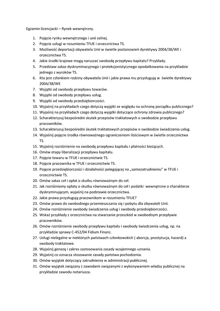 Egzamin licencjacki – Rynek wewnętrzny. 1. Pojęcie rynku wewnętrznego i unii celnej. 2. Pojęcie usługi w rozumieniu TFUE i orzecznictwa TS. 3. Możliwość deportacji obywatela Unii w świetle postanowień dyrektywy 2004/38/WE i orzecznictwa TS. 4. Jakie środki krajowe mogą naruszać swobodę przepływu kapitału? Przykłady. 5. Przedstaw zakaz dyskryminacyjnego i protekcjonistycznego opodatkowania na przykładzie jednego z wyroków TS. 6. Kto jest członkiem rodziny obywatela Unii i jakie prawa mu przysługują w świetle dyrektywy 2004/38/WE 7. Wyjątki od swobody przepływu towarów. 8. Wyjątki od swobody przepływu usług. 9. Wyjątki od swobody przedsiębiorczości. 10. Wyjaśnij na przykładach czego dotyczą wyjątki ze względu na ochronę porządku publicznego? 11. Wyjaśnij na przykładach czego dotyczą wyjątki dotyczące ochrony zdrowia publicznego? 12. Scharakteryzuj bezpośredni skutek przepisów traktatowych o swobodzie przepływu pracowników. 13. Scharakteryzuj bezpośredni skutek traktatowych przepisów o swobodzie świadczenia usług. 14. Wyjaśnij pojęcie środka równoważnego ograniczeniom ilościowym w świetle orzecznictwa TS. 15. Wyjaśnij rozróżnienie na swobodę przepływu kapitału i płatności bieżących. 16. Omów etapy liberalizacji przepływu kapitału. 17. Pojęcie towaru w TFUE i orzecznictwie TS. 18. Pojęcie pracownika w TFUE i orzecznictwie TS. 19. Pojęcie przedsiębiorczości i działalności polegającej na „samozatrudnieniu” w TFUE i orzecznictwie TS. 20. Omów zakaz ceł i opłat o skutku równoważnym do ceł. 21. Jak rozróżniamy opłaty o skutku równoważnym do ceł i podatki wewnętrzne o charakterze dyskryminującym, wyjaśnij na podstawie orzecznictwa. 22. Jakie prawa przysługują pracownikom w rozumieniu TFUE? 23. Omów prawo do swobodnego przemieszczania się i pobytu dla obywateli Unii. 24. Omów rozróżnienie swobody świadczenia usług i swobody przedsiębiorczości. 25. Wskaż przykłady z orzecznictwa na stwarzanie przeszkód w swobodnym przepływie pracowników. 26. Omów rozróżnienie swobody przepływu kapitału i swobody świadczenia usług, np. na przykładzie sprawy C-452/04 Fidium Finanz. 27. Usługi nielegalne w niektórych państwach członkowskich ( aborcja, prostytucja, hazard) a swobody traktatowe. 28. Wyjaśnij genezę i zakres zastosowania zasady wzajemnego uznania. 29. Wyjaśnij co oznacza stosowanie zasady państwa pochodzenia. 30. Omów wyjątek dotyczący zatrudnienia w administracji publicznej. 31. Omów wyjątek związany z zawodami związanymi z wykonywaniem władzy publicznej na przykładzie zawodu notariusza. 32. Omów traktatowy i orzeczniczy katalog dopuszczalnych ograniczeń w swobodzie przepływu towarów. 33. Omów traktatowy i orzeczniczy katalog dopuszczalnych ograniczeń w swobodzie przepływu usług i przedsiębiorczości. 34. Wyjaśnij znaczenie orzeczenia w sprawie C-267 i C-268/91 Keck. 35. Wyjaśnij znaczenie i konsekwencje orzeczenia w sprawie C-120/78 Dassonville. 36. Wyjaśnij znaczenie orzeczenia w sprawie C-120/78 Cassis de Dijon. 37. Wyjaśnij znaczenie orzeczenia w sprawie C-208/00 Überseering. 38. Wyjaśnij znaczenie orzeczenia w sprawie C-55/94 Gebhard. 39. W świetle jakiej swobody należy oceniać zasady nabywania nieruchomości w państwach członkowskich, podaj przykłady. 40. Co obejmuje swoboda przedsiębiorczości – przykłady. 41. Jakie prawa przysługują dzieciom pracowników migrujących w świetle prawa wtórnego Unii Europejskiej. 42. Problem tzw. turystyki zasiłkowej w świetle orzecznictwa TS. 43. Usługi medyczne – geneza i główne założenia dyrektywy o prawach pacjentów w transgranicznej opiece zdrowotnej 2011/24/UE. 44. Ochrona konsumenta na rynku wewnętrznym podstawowe założenia. 45. Edukacja w innym państwie członkowskim - zakres zastosowania swobód traktatowych. 46. Ograniczenia dotyczące reklamy jako środek o skutku równoważnym do ograniczeń ilościowych. 47. Traktatowe podstawy zasady niedyskryminacji. 48. Wyjaśnij podstawy wspólnej polityki celnej. 49. Wyjaśnij czym jest strefa Schengen. 50. Jaki związek ze swobodami na rynku wewnętrznym mają przepisy o obywatelstwie unijnym?