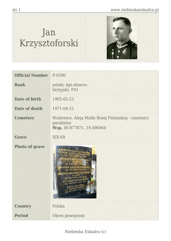 str.1 www.niebieskaeskadra.pl Jan Krzysztoforski Official Number P-0390 Rank polski: kpt.obserw. brytyjski: F/O Date of birth 1905-05-23 Date of death 1971-04-15 Cemetery Wadowice, Aleja Matki Bożej Fatimskiej - cmentarz parafialny Wsp. 49.877871, 19.496064 Grave XIX-69 Photo of grave Country Polska Period Okres powojenny Niebieska Eskadra (c) str.2 www.niebieskaeskadra.pl Source Informacja: Studnicki, Gustaw, "Cmentarz parafialny w Wadowicach" Zdjęcia: Andrzej Krzysztoforski Stryj Janek Żonaty z Marią Matczak. Był kapitanem lotnictwa, obserwatorem (dziś nazywałoby się to nawigator). Oficerską Szkołę Lotnictwa w Dęblinie ukończył w roku 1927(1). Kampanię wrześniową odbył w ramach lotnictwa Armii "Łódź", w 66. Eskadrze Obserwacyjnej, jako dowódca plutonu, składającego się z 4 samolotów. Historia walk 66. Eskadry została dobrze opisana, dzień po dniu (2) , aż do przekroczenia granicy i lądowania w Czerniowcach w dniu 18. września. Z Rumunii przez Maltę, Marsylię, Lyon (20 listopada)(3) Jan przedostał się do Anglii. Nie do końca jasne są jego dalsze wojenne losy. Według wspomnianej książki J. Pawlaka, był w okresie władzy gen. Sikorskiego osadzony na "Wyspie Węży" (co potwierdza inny dokument, udostępniony mi przez p. A. Kubickiego (4)). Starałem się wyjaśnić tę sprawę w korespondencji z autorem książki. Napisał mi: "Potoczna nazwa "Wyspa Węży" dotyczy wyspy Rothsay, położonej przy zachodnim wybrzeżu Wlk. Brytanii - uznane miejsce letniego wypoczynku brytyjczyków w okresie międzywojennym. Na tej wyspie rząd gen. Wł. Sikorskiego (...) zorganizował pod koniec 1940 r. obóz odosobnienia dla polskich oficerów służby czynnej, wyrażających (...) swój negatywny stosunek do polityki wewnętrznej i zagranicznej prowadzonej przez rząd (...), w gromadnej większości zwolenników i b. żołnierzy marsz. J. Piłsudskiego obecnie odsuniętych od władzy..." Dalej nie usuwało to niejasności, bo trudno przypuszczać, aby oficer w stopniu kapitana mógł być uznany za "niebezpiecznego" politycznie. Bardziej wyczerpujące naświetlenie sprawy znalazłem w obszernym artykule Adama Węgłowskiego(5)(który dr Pawlak ocenił wysoko). Wynika z niego, że obozy (ten - co artykuł uściśla - w miasteczku Rothesay na szkockiej wyspie Bute, przez który przeszło około 1500 oficerów, w tym 20 generałów, był tylko jednym z nich), stanowiły niechlubny (żeby nie powiedzieć - ponury) epizod w wojennej historii polskich sił zbrojnych na Zachodzie. Bezczynność i poczucie krzywdy internowanych tworzyły toksyczną atmosferę; były wypadki samobójstw. Sprawa doczekała się w czerwcu 1942 r. interpelacji w parlamencie brytyjskim; Szkoci nie mogli zrozumieć dlaczego "Polacy grają w brydża, gdy ich koledzy z jednostek frontowych i żołnierze brytyjscy giną na wojnie". Po tej interpelacji obozy zaczęto likwidować. Nigdy też nie dowiedziałem się, jak się stało, że Jan "rozminął się" z żoną i córką (wtedy przebywającymi prawdopodobnie na Bliskim Wschodzie lub w Indiach) i zdecydował się na powrót do Polski - czy nie udało się nawiązać kontaktu? W jakim stopniu na decyzję powrotu wpłynęły niewątpliwie trudne warunki, w jakich znaleźli się w Anglii, po zakończeniu wojny, polscy wojskowi? (6) Po powrocie stryj Jan zamieszkał u nas. Ojciec zatrudnił go w swoim Laboratorium Chemiczno-Farmaceutycznym. Był to mężczyzna wtedy czterdziestokilkuletni, przystojny, postawny, ze sporym poczuciem humoru; z pewnością podobał się kobietom. Stryj został aresztowany razem z Ojcem w lutym 1949 r. i zwolniony zaraz po jego śmierci (o której początkowo nie wiedział). Po likwidacji Laboratorium wyjechał na Dolny Śląsk, do Świdnicy; pracował w aptece w sąsiedniej Niebieska Eskadra (c) str.3 www.niebieskaeskadra.pl Jaworzynie Śląskiej. W końcu nawiązał kontakt z żoną i córką Ewą, które wywiezione ze Lwowa do Kazachstanu - wydostały się z armią Andersa; przez Iran, Palestynę, Indie trafiły do Australii. Mieszkały w Sydney przez 11 lat. Wtedy Ewa pierwsza wróciła do Europy. W Wadowicach spotkała się z ojcem. Później spotkała się z mężem w Polsce również Marysia; z tego co wiem skonstatowali, że wspólnej przyszłości już nie mają. Jan oczywiście drogę na Zachód miał zamkniętą, zaś dla Marysi i Ewy, z ich deportacyjną przeszłością i zrozumiałym urazem, powrót do ówczesnej Polski na stałe nie wchodził w grę. Smutna historia rodziny Jana i Marii była zapewne jedną z wielu, dotyczących nieodwracalnie rozbitych przez wojnę rodzin. Jan zmarł dość młodo (66 lat), najprawdopodobniej w wyniku dłuższej choroby, z którą się nie zdradzał.Ewa i Marysia były osobowościami pełnymi uroku i wdzięku. Marysia, niezwykle przyjazna i otwarta, do końca zachowała urodę. Na pogrzebie, na który poleciałem, podkreślał ją nawet w homilii - co rzadko zdarza w takich okolicznościach - ksiądz, który poznał ją krótko przed śmiercią; a miała wtedy już 96 lat. Los wyznaczył jednak inną kolejność - pierwsza zmarła Ewa, w wieku niewiele ponad 50 lat; przegrała z rakiem. Andrzej Krzysztoforski, "Historia Rodzinna", fragment książki, w przygotowaniu. Przypisy: (1) J. Pawlak - Absolwenci Szkoły Orląt 1925-1939; Retro-Art. W-wa, 2009 r. (2) Polskie eskadry w Wojnie Obronnej - Wrzesień 1939. (3) Własnoręcznie wypełniony Zeszyt Ewidencyjny 1035 (Polish Institute and Sikorski Museum, LOT A.IV). (4) Notatka odręczna z przebiegu służby Jana Krzysztoforskiego. (5) A. Węgłowski: W obozach Sikorskiego - "Tygodnik Powszechny", 2.5.2010 r. (6) Gen. Stanisław Maczek pracował jako barman, gen. Klemens Rudnicki zajmował się odnawianiem obrazów ...(Ks. A. Boniecki: Biskup na walizkach; Tygodnik Powszechny, Magazyn Literacki 29, 6.2.2011 r.) Niebieska Eskadra (c)