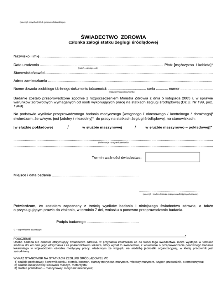 (pieczęć przychodni lub gabinetu lekarskiego) ŚWIADECTWO ZDROWIA członka załogi statku żeglugi śródlądowej Nazwisko i imię ..................................................................................................................................................................... Data urodzenia ...................................................................................................................... Płeć: ]mężczyzna / kobieta]* (dzień, miesiąc, rok) Stanowisko/zawód................................................................................................................................................................. Adres zamieszkania ............................................................................................................................................................. Numer dowodu osobistego lub innego dokumentu tożsamości: ...................................... seria ............ numer ................................ (nazwa innego dokumentu) Badanie zostało przeprowadzone zgodnie z rozporządzeniem Ministra Zdrowia z dnia 5 listopada 2003 r. w sprawie warunków zdrowotnych wymaganych od osób wykonujących pracę na statkach żeglugi śródlądowej (Dz.U. Nr 199, poz. 1949). Na podstawie wyników przeprowadzonego badania medycznego ]wstępnego / okresowego / kontrolnego / doraźnego]* stwierdzam, że w/wym. jest [zdolny / niezdolny]* do pracy na statkach żeglugi śródlądowej, na stanowiskach: [w służbie pokładowej / w służbie maszynowej / w służbie maszynowo – pokładowej]* ............................................................................................................................................................................................... (informacje o ograniczeniach) ............................................................................................................................................................................................... Termin ważności świadectwa: Miejsce i data badania ................................................................................... .......................................................... (pieczęć i podpis lekarza przeprowadzającego badanie) Potwierdzam, że zostałem zapoznany z treścią wyników badania i niniejszego świadectwa zdrowia, a także o przysługującym prawie do złożenia, w terminie 7 dni, wniosku o ponowne przeprowadzenie badania. Podpis badanego .................................................. *) – odpowiednie zaznaczyć POUCZENIE Osoba badana lub armator otrzymujący świadectwo zdrowia, w przypadku zastrzeżeń co do treści tego świadectwa, może wystąpić w terminie siedmiu dni od dnia jego otrzymania i za pośrednictwem lekarza, który wydał to świadectwo, z wnioskiem o przeprowadzenie ponownego badania lekarskiego w wojewódzkim ośrodku medycyny pracy, właściwym ze względu na siedzibę jednostki organizacyjnej, w której pracownik jest zatrudniony. WYKAZ STANOWISK NA STATKACH ŻEGLUGI ŚRÓDLĄDOWEJ W: 1) służbie pokładowej: kierownik statku, sternik, bosman, starszy marynarz, marynarz, młodszy marynarz, szyper, przewoźnik, stermotorzysta; 2) służbie maszynowej: kierownik maszyn, motorzysta; 3) służbie pokładowo – maszynowej: marynarz motorzysta;