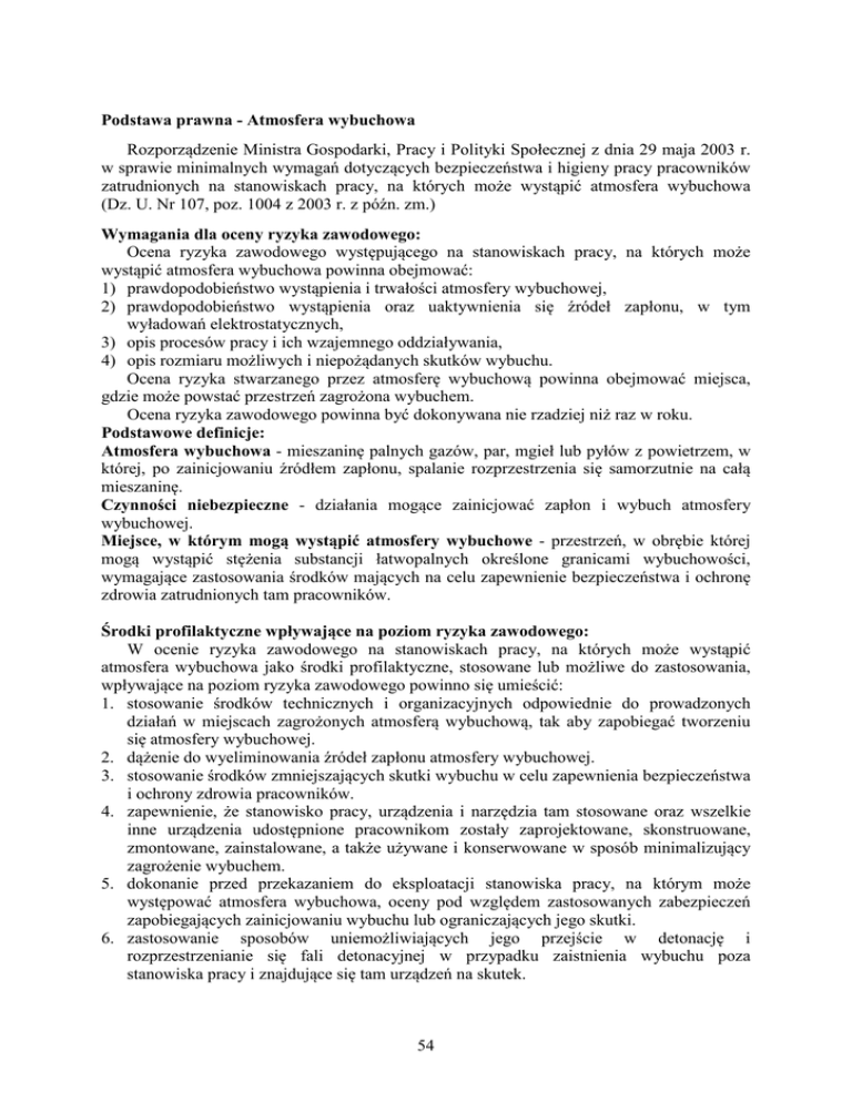 Podstawa prawna - Atmosfera wybuchowa Rozporządzenie Ministra Gospodarki, Pracy i Polityki Społecznej z dnia 29 maja 2003 r. w sprawie minimalnych wymagań dotyczących bezpieczeństwa i higieny pracy pracowników zatrudnionych na stanowiskach pracy, na których może wystąpić atmosfera wybuchowa (Dz. U. Nr 107, poz. 1004 z 2003 r. z późn. zm.) Wymagania dla oceny ryzyka zawodowego: Ocena ryzyka zawodowego występującego na stanowiskach pracy, na których może wystąpić atmosfera wybuchowa powinna obejmować: 1) prawdopodobieństwo wystąpienia i trwałości atmosfery wybuchowej, 2) prawdopodobieństwo wystąpienia oraz uaktywnienia się źródeł zapłonu, w tym wyładowań elektrostatycznych, 3) opis procesów pracy i ich wzajemnego oddziaływania, 4) opis rozmiaru możliwych i niepożądanych skutków wybuchu. Ocena ryzyka stwarzanego przez atmosferę wybuchową powinna obejmować miejsca, gdzie może powstać przestrzeń zagrożona wybuchem. Ocena ryzyka zawodowego powinna być dokonywana nie rzadziej niż raz w roku. Podstawowe definicje: Atmosfera wybuchowa - mieszaninę palnych gazów, par, mgieł lub pyłów z powietrzem, w której, po zainicjowaniu źródłem zapłonu, spalanie rozprzestrzenia się samorzutnie na całą mieszaninę. Czynności niebezpieczne - działania mogące zainicjować zapłon i wybuch atmosfery wybuchowej. Miejsce, w którym mogą wystąpić atmosfery wybuchowe - przestrzeń, w obrębie której mogą wystąpić stężenia substancji łatwopalnych określone granicami wybuchowości, wymagające zastosowania środków mających na celu zapewnienie bezpieczeństwa i ochronę zdrowia zatrudnionych tam pracowników. Środki profilaktyczne wpływające na poziom ryzyka zawodowego: W ocenie ryzyka zawodowego na stanowiskach pracy, na których może wystąpić atmosfera wybuchowa jako środki profilaktyczne, stosowane lub możliwe do zastosowania, wpływające na poziom ryzyka zawodowego powinno się umieścić: 1. stosowanie środków technicznych i organizacyjnych odpowiednie do prowadzonych działań w miejscach zagrożonych atmosferą wybuchową, tak aby zapobiegać tworzeniu się atmosfery wybuchowej. 2. dążenie do wyeliminowania źródeł zapłonu atmosfery wybuchowej. 3. stosowanie środków zmniejszających skutki wybuchu w celu zapewnienia bezpieczeństwa i ochrony zdrowia pracowników. 4. zapewnienie, że stanowisko pracy, urządzenia i narzędzia tam stosowane oraz wszelkie inne urządzenia udostępnione pracownikom zostały zaprojektowane, skonstruowane, zmontowane, zainstalowane, a także używane i konserwowane w sposób minimalizujący zagrożenie wybuchem. 5. dokonanie przed przekazaniem do eksploatacji stanowiska pracy, na którym może występować atmosfera wybuchowa, oceny pod względem zastosowanych zabezpieczeń zapobiegających zainicjowaniu wybuchu lub ograniczających jego skutki. 6. zastosowanie sposobów uniemożliwiających jego przejście w detonację i rozprzestrzenianie się fali detonacyjnej w przypadku zaistnienia wybuchu poza stanowiska pracy i znajdujące się tam urządzeń na skutek. 54 7. zapewnienie utrzymania pracy urządzeń i systemów zabezpieczających w stanie bezpiecznego funkcjonowania, nawet w przypadku odcięcia dopływu energii, niezależnie od pracy pozostałych instalacji. 8. zapewnienie możliwości sterowania ręcznego, zastępującego sterowanie automatyczne, pod warunkiem że takie sterowanie nie ma wpływu na obniżenie poziomu bezpieczeństwa; czynności te mogą wykonywać jedynie pracownicy, którzy odbyli szkolenie stanowiskowe; 9. przewidzieć, w przypadku wyłączenia awaryjnego, sposoby rozproszenia skumulowanej energii lub odcięcia jej w taki sposób, aby nie stanowiła zagrożenia. 10. umieszczanie przy wejściach do pomieszczeń, gdzie znajdują się miejsca, w których występują atmosfery wybuchowe, oznakowania w kształcie trójkąta z czarnym obramowaniem, gdzie wewnątrz obramowania powinny być umieszczone czarne litery "Ex" na żółtym tle. 11. wykonywanie prac wykonywanych w miejscach zagrożonych wybuchem po uzyskaniu pisemnego zezwolenia w trybie ustalonym przez pracodawcę. Podstawa prawna – Promieniowanie optyczne Rozporządzenia Ministra Pracy i Polityki Społecznej z dnia 27 maja 2010 r. w sprawie bezpieczeństwa i higieny pracy przy pracach związanych z ekspozycją na promieniowanie optyczne (Dz. U. Nr 100, poz. 643 z dnia 9 czerwca 2010 r. ) Wymagania dla oceny ryzyka zawodowego: Ocena ryzyka zawodowego związanego z ekspozycją pracowników na promieniowanie optyczne, wynikające z konkretnych uwarunkowań występujących w miejscu pracy, powinna uwzględniać: 1) czynniki mające wpływ na skutki oddziaływania promieniowania optycznego na organizm człowieka dla promieniowania nielaserowego, tj. poziom promieniowania, długość fali promieniowania, czas trwania ekspozycji oraz rozmiar obrazu źródła promieniowania na siatkówce oka (dla λ = 300-1400 nm) oraz dla promieniowania laserowego, tj. poziom promieniowania, długość fali promieniowania, czas ekspozycji lub czasu trwania impulsu oraz rozmiar obrazu źródła promieniowania na siatkówce oka (dla λ = 400-1400 nm). 2) wartości MDE, w tym również wartości MDE odrębnie dla kobiet w ciąży określone w przepisach w sprawie prac szczególnie uciążliwych lub szkodliwych dla zdrowia kobiet, oraz ograniczeń przy zatrudnianiu młodocianych wynikających z przepisów w sprawie prac wzbronionych młodocianym i warunków ich zatrudniania przy niektórych z tych prac. 3) skutki dla zdrowia i bezpieczeństwa pracowników, w tym należących do grup szczególnego ryzyka. 55 4) możliwe skutki dla zdrowia i bezpieczeństwa pracowników, wynikające ze współwystępowania w środowisku pracy promieniowania optycznego i fotouczulających substancji chemicznych. 5) pośrednie skutki mające wpływ na bezpieczeństwo pracowników, w szczególności zagrożenia związanych z możliwością wywołania olśnienia