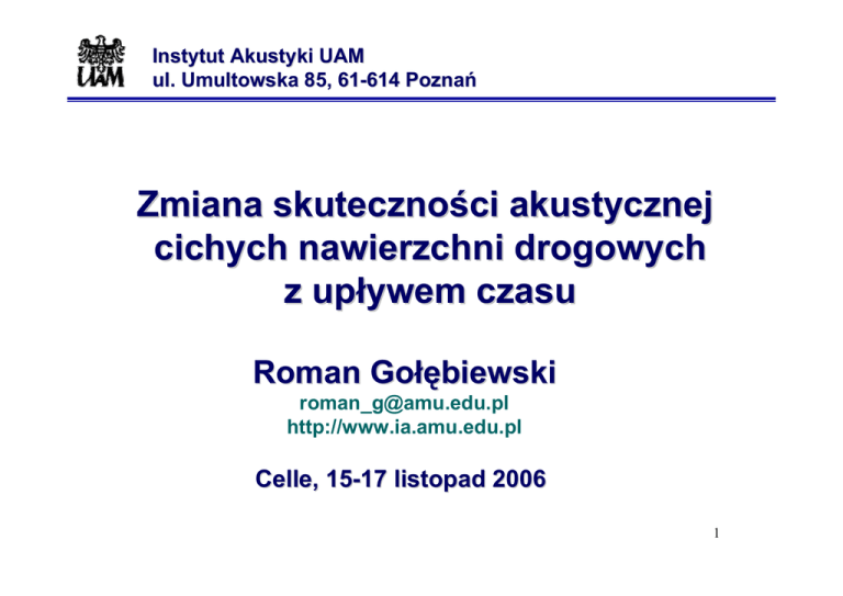 Instytut Akustyki UAM ul. Umultowska 85, 61-614 Poznań Zmiana skuteczności akustycznej cichych nawierzchni drogowych z upływem czasu Roman Gołębiewski [email protected] http://www.ia.amu.edu.pl Celle, 15-17 listopad 2006 1 R. Gołębiewski, Zmiana skuteczności akustycznej cichych nawierzchni drogowych z upływem czasu Program referatu Cel badań Budowa porowatych nawierzchni drogowych Zmiana skuteczności akustycznej nawierzchni porowatych Metodyka i zakres badań Wyniki badań 2 R. Gołębiewski, Zmiana skuteczności akustycznej cichych nawierzchni drogowych z upływem czasu Metody redukcji hałasu samochodowego Efe ktywny poziom mocy a kus tycznne j [dB] Zmniejszenie prędkości ruchu 120 115 110 105 100 95 40 60 80 100 120 140 160 P rę dkoś ć [km/godz.] 3 R. Gołębiewski, Zmiana skuteczności akustycznej cichych nawierzchni drogowych z upływem czasu Metody redukcji hałasu samochodowego (cd.) Zmniejszenie prędkości ruchu (cd.) Zmiana prędkości 100 km/godz. → 60km/godz. (na nawierzchni tradycyjnej, pojazdy lekkie) oznacza spadek poziomu ekspozycji hałasu o 6.7dB Dla innych nawierzchni, innej kategorii pojazdów – inna zmiana poziomu hałasu 4 R. Gołębiewski, Zmiana skuteczności akustycznej cichych nawierzchni drogowych z upływem czasu Metody redukcji hałasu samochodowego (cd.) Ekrany akustyczne Zalety - bardzo duża skuteczność Wady - cena - w wielu sytuacjach – brak możliwości budowy Ekranu (ulice śródmiejskie) Ciche opony, cichsze silniki, zarządzanie ruchem pojazdów (ulica jednokierunkowa, zakaz ruchu poj.ciężkich) 5 R. Gołębiewski, Zmiana skuteczności akustycznej cichych nawierzchni drogowych z upływem czasu Metody redukcji hałasu samochodowego (cd.) Porowate nawierzchnie drogowe ☺ stosowanie w przypadku przekroczeń dopuszczalnych poziomów dźwięków o kilka decybeli ☺ metoda redukcji tańsza niż inne metody porowate nawierzchnie są droższe w utrzymaniu niż tradycyjne nawierzchnie drogowe po pewnym czasie tracą swoje właściwości 6 R. Gołębiewski, Zmiana skuteczności akustycznej cichych nawierzchni drogowych z upływem czasu Cel badań Określenie zmiany skuteczności akustycznej porowatych nawierzchni drogowych z upływem czasu 7 R. Gołębiewski, Zmiana skuteczności akustycznej cichych nawierzchni drogowych z upływem czasu Budowa nawierzchni porowatych Nawierzchnie porowate posiadają dużo tzw. wolnej przestrzeni – tzw. pory Pory – niewielkie wnęki wypełnione powietrzem 8 R. Gołębiewski, Zmiana skuteczności akustycznej cichych nawierzchni drogowych z upływem czasu Budowa nawierzchni porowatych (cd.) Nawierzchnia jednowarstwowa D jedna warstwa drenażowa o grubości ok. 4cm (pod tą warstwą znajduje się warstwa nieprzepuszczalna) D warstwa drenażowa posiada ok. 20-25% wolnej przestrzeni 9 R. Gołębiewski, Zmiana skuteczności akustycznej cichych nawierzchni drogowych z upływem czasu Budowa nawierzchni porowatych (cd.) Nawierzchnia dwuwarstwowa D warstwa górna – drobnoziarnista D warstwa dolna – gruboziarnista (pod tą warstwą znajduje się warstwa nieprzepuszczalna) D przykładowe parametry: warstwa drobnoziarnista – grys 2/5 i 5/8 warstwa gruboziarnista – grys 11/16 i 16/22 10 R. Gołębiewski, Zmiana skuteczności akustycznej cichych nawierzchni drogowych z upływem czasu Budowa nawierzchni porowatych (cd.) Nawierzchnia dwuwarstwowa (cd.) 11 R. Gołębiewski, Zmiana skuteczności akustycznej cichych nawierzchni drogowych z upływem czasu Właściwości nawierzchni porowatych Zalety nawierzchni porowatych ☺ właściwości tłumiące hałas (zmniejszenie hałasu toczenia oraz hałasu podczas propagacji) ☺ właściwości drenażowe (lepiej odprowadzana woda z powierzchni jezdni → wzrost bezpieczeństwa jazdy) 12 R. Gołębiewski, Zmiana skuteczności akustycznej cichych nawierzchni drogowych z upływem czasu Właściwości nawierzchni porowatych (cd.) Zalety nawierzchni porowatych (cd.) Fala akustyczna padająca na powierzchnię drogi wymusza drgania powietrza we wnękach Na skutek tarcia powietrza o ich ścianki, hałas jest tłumiony (niewielka część energii akustycznej zostaje odbita) Im większa liczba wnęk i im większe są ich rozmiary tym tłumienie fali akustycznej większe 13 R. Gołębiewski, Zmiana skuteczności akustycznej cichych nawierzchni drogowych z upływem czasu Właściwości nawierzchni porowatych (cd.) Zalety nawierzchni porowatych (cd.) O 14 R. Gołębiewski, Zmiana skuteczności akustycznej cichych nawierzchni drogowych z upływem czasu Właściwości nawierzchni porowatych (cd.) Zalety nawierzchni porowatych (cd.) 15 R. Gołębiewski, Zmiana skuteczności akustycznej cichych nawierzchni drogowych z upływem czasu Właściwości nawierzchni porowatych (cd.) Wady nawierzchni porowatych duże koszty utrzymania w stosunku do nawierzchni tradycyjnych (szczególnie w okresie zimowym) zanikanie właściwości tłumiących 16 R. Gołębiewski, Zmiana skuteczności akustycznej cichych nawierzchni drogowych z upływem czasu Właściwości nawierzchni porowatych (cd.) Od czego zależy skuteczność akustyczna nawierzchni porowatych? budowa i skład nawierzchni porowatej rodzaj pojazdów samochodowych Z reguły skuteczność akustyczna jest większa dla pojazdów lekkich niż dla pojazdów ciężkich. Istnieją nawierzchnie, które lepiej tłumią hałas pojazdów ciężkich niż lekkich 17 R. Gołębiewski, Zmiana skuteczności akustycznej cichych nawierzchni drogowych z upływem czasu Właściwości nawierzchni porowatych (cd.) Zmiana skuteczności akustycznej nawierzchni porowatych Spadek skuteczności akustycznej spowodowany jest zanieczyszczeniami, które wypełniają wnęki na powierzchni jezdni i w znacznym stopniu zmniejszają ich objętość Zmniejszenie objętości wnęk oznacza zmniejszenie właściwości absorpcyjnych Nawierzchnie jednowarstwowe → szczególnie podatne na zanieczyszczenia 18 R. Gołębiewski, Zmiana skuteczności akustycznej cichych nawierzchni