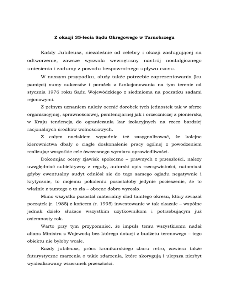 Z okazji 35-lecia Sądu Okręgowego w Tarnobrzegu Każdy Jubileusz, niezależnie od celebry i okazji zasługującej na odtworzenie, zawsze wyzwala wewnętrzny nastrój nostalgicznego uniesienia i zadumy z powodu bezpowrotnego upływu czasu. W naszym przypadku, służy także potrzebie zaprezentowania (ku pamięci) sumy sukcesów i porażek z funkcjonowania na tym terenie od stycznia 1976 roku Sądu Wojewódzkiego z siedmioma na początku sądami rejonowymi. Z pełnym uznaniem należy ocenić dorobek tych jednostek tak w sferze organizacyjnej, sprawnościowej, penitencjarnej jak i orzeczniczej z pionierską w Kraju tendencją do ograniczania kar izolacyjnych na rzecz bardziej racjonalnych środków wolnościowych. Z całym naciskiem wypadnie też zasygnalizować, że kolejne kierownictwa dbały o ciągłe doskonalenie pracy ogólnej z powodzeniem realizując wszystkie cele ówczesnego wymiaru sprawiedliwości. Dokonując oceny zjawisk społeczno – prawnych z przeszłości, należy uwzględniać subiektywny z reguły, autorski opis rzeczywistości, natomiast gdyby ewentualny audyt odniósł się do tego samego oglądu negatywnie i krytycznie, to mojemu pokoleniu pozostałoby jedynie pocieszenie, że to właśnie z tamtego o to zła – obecne dobro wyrosło. Mimo wszystko pozostał materialny ślad tamtego okresu, który związał początek (r. 1985) z końcem (r. 1995) inwestowanie w tak okazałe – wspólne jednak dzieło służące wszystkim użytkownikom i potrzebującym już osiemnasty rok. Warto przy tym przypomnieć, że impuls temu wszystkiemu nadał alians Ministra z Wojewodą bez którego dotacji z budżetu terenowego – tego obiektu nie byłoby wcale. Każdy jubileusz, prócz kronikarskiego zboru retro, zawiera także futurystyczne marzenia o takie zdarzenia, które skorygują i ulepszą niezbyt wyidealizowany wizerunek przeszłości. Tym celom w naszej sytuacji ma m.in. służyć nowe prawo USP z 18.VIII.2011r., które przełomowo poddało sędziów okresowym ocenom ich pracy i aktywności zawodowej. To to właśnie rozwiązanie wzbudziło wiele oporów i protestów niektórych grup pod pozorem ograniczenia niezawisłości, ale chyba bardziej z obawy o własne zdyscyplinowanie. Tymczasem opinia publiczna jest coraz bardziej krytyczna wobec niesprawności niektórych sądów, orzekania jakoby bez wyobraźni skutków stosowanego prawa najczęściej opiekuńczego, a także przewlekanie procesów, aż po kres przedawnienia karalności przestępstwa. Jakie więc należy upatrywać sposoby i środki na odwrócenie tak niekorzystnych tendencji? – przede wszystkim w doskonaleniu prawa procesowego, bo tylko te przepisy dają gwarancję sprawnego i praworządnego stosowania prawa materialnego. Dlatego w każdej sytuacji gdy określony organ rządzony formalizmem narusza wiążący go system albo działa bez osłony procesowej – godzi w prawa obywatelskie, i autorytet własnego Kraju. O ścisłej zależności prawa sądowego pisał obrazowo w skrypcie dla studentów z procedury prof. M. Cieślak następująco „czymże jak nie strachem na wróble w konopiach byłoby prawo karne nawet najsurowsze, któremu ptaki beztrosko wydziobywałyby watę z czapki, gdyby nie proces karny”. Ta zasada znajduje potwierdzenie w krajach z ustawową jeszcze karą śmierci, ale ponieważ funkcjonują tam procedury właściwe najbardziej rozwiniętym demokracjom, dlatego nikt tym państwom, prócz może nadmiernej opresji, niepraworządności nie przypisuje. Oczekując na rychłe, ale nieodzowne reformy, z pozycji praktyki można zasygnalizować proste i beznakładowe przykładowo następujące zmiany: - zniesienie przymusu udziału w sprawach karnych mając w pamięci jakie straty i szkody moralne towarzyszą torpedowaniu rozpraw wieloosobowych, rozpisanych na długie miesiące, symulowanymi z reguły powodami absencji oskarżonego we własnej sprawie, - złagodzenie rygorów wynikających z naruszenia terminów sądowych lub zawitych wykorzystywanych chętnie do odfajkowania numeru sprawy 2 cywilnej, natomiast nawet skuteczna próba odwrócenia tego szkodliwego dla strony formalizmu, oddala sprawę od wokandy nawet o kilka miesięcy, - zrezygnowanie z rozpatrywania w trybie nieprocesowym przez sąd okręgowy w pierwszej instancji wniosku o ubezwłasnowolnienie (art.544 kpc) oraz o uznanie orzeczeń zagranicznych (art.1148 kpc) w składach zawodowych na rzecz jednoosobowych lub ławniczych, wykorzystując zwolnionych sędziów wotantów ze składów kolegialnych do obsługi innych spraw wydziałowych, - rozszerzenie o nowe możliwości techniczne sposobów kontaktowania się z podmiotami procesowymi co ułatwi i przyśpieszy tryb wymiany informacji z sądem na każdym etapie postępowania, - wprowadzenie zasady kierowania sądom akt wyłącznie z materiałem związanym z zarzutami redukując w ten sposób ogromne zbiory dla sprawy obojętne co ułatwi i przyśpieszy wyznaczenie rozprawy. Podobnie jak z redukcją z akt materiałów zbędnych można zdecydowanie usprawnić technikę oskarżycielską przez redukcję kazuistyki zastępując niezmierną czasem ilość zarzutów (o to, że) o czyny jednorodne lub zbliżone jednym jako przestępstwo ciągłe. Taka metoda (stosowana w przeszłości – „Nauka o przestępstwie” PWN 1973 – prof. W. Wolter) znakomicie usprawni postępowanie związane z przygotowaniem oskarżenia. Obok zbioru czynników rzutujących na niesprawność postępowania należy też przywołać także i te, które okazały się niezwykle korzystne dla praktyki sądowej jak i interesu społecznego. Chodzi o dwie epokowe legislacje oparte na nowej technice, a mianowicie: - o dozorze elektronicznym związanym z obrączkowaniem skazanych, bardzo kosztownym, ale skuteczniejszym w naszym systemie penitencjarnym, - o migracji komputerowej ksiąg wieczystych umożliwiającej zbadanie treści każdej w domowym komputerze, a praktykując jeszcze na hipotekach porozbiorowych, osobiście