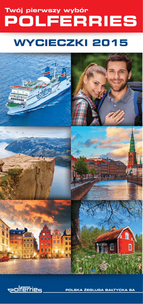 Twój pierwszy wybór POLFERRIES WYCIECZKI 2015 POLSKA ŻEGLUGA BAŁTYCKA SA Poznajcie cudowną Skandynawię! Nasze wycieczki to świetna okazja do poznania wielu wspaniałych miejsc. Wielkie stolice, tętniące życiem, pełne zabytków, przytulnych kafejek czy zielonych parków, które mimo wszystko mogą się poszczycić kameralnością. Dzika, nieskażona przyroda, niewielkie, ale za to bardzo malownicze miejscowości. Jedno jest pewne, Skandynawię trzeba poznać. Pozostawia ona w pamięci na długo wspaniałe obrazy, których nie zobaczymy nigdzie indziej. UROKI POŁUDNIOWEJ SZWECJI - Malownicze Ystad cena od 255zł/os. wycieczka 2-dniowa KOPENHAGA EXPRESS cena od 375zł/os. wycieczka 2-dniowa www.polferries.pl SZTOKHOLM, UPPSALA, SIGTUNA cena od 600zł/os. wycieczka 4-dniowa WEEKEND W KOPENHADZE I MALMÖ cena od 850zł/os. wycieczka 3-dniowa DOOKOŁA CIEŚNINY ØRESUND cena od 875zł/os. wycieczka 3-dniowa GÖTEBORG - MAGICZNE SERCE SZWECJI cena od 890zł/os. wycieczka 3-dniowa Organizujemy wycieczki do Szwecji, Danii, Norwegii i krajów nadbałtyckich, konferencje, integracje na promach oraz wycieczki szkolne dla młodzieży. BORNHOLM - Wyspa Słońca oraz Południe Szwecji cena od 895zł/os. wycieczka 3-dniowa SKANDYNAWIA W PIGUŁCE Szwecja - Dania - Norwegia cena od 1495zł/os. wycieczka 4-dniowa SZTOKHOLM - HELSINKI cena od 1570zł/os. wycieczka 5-dniowa CUDOWNA PODRÓŻ FIORDAMI ZACHODNIEJ NORWEGII: Oslo, Bergen, Stavanger cena od 3180zł/os. wycieczka 7-dniowa Morskie Biuro Podróży w Szczecinie tel. +48 91 488 02 38 [email protected]