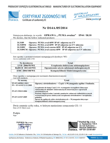Nr D14A /05/2014 Niniejszym deklaruje, że wyrób: OPRAWA „ PUMA owalna” We declare, that the bellow indicated products: D.3189 D.3189M D.3189C D.3189CM Oprawa Oprawa Oprawa Oprawa IP44 / IK10 PUMA oval 60W IP 65 odporna na UV PUMA oval 60W IP 65 odporna na UV mleczna PUMA oval czarna 60W IP 65 odporna na UV PUMA oval czarna 60W IP 65 odporna na UV mleczna Jest zgodny z postanowieniami następujących dyrektyw WE: Are in conformity with LVD: Nr dyrektywy LVD 2006/95/WE RoHS II 2011/65/WE EMC 2004/108/WE Tytuł Urządzenia elektryczne niskonapięciowe Ograniczenie użycia substancji niebezpiecznych Kompatybilność Elaktromagnetyczna Oraz zgodny z następującymi normami zharmonizowanymi: And with standards: Nr normy PN-EN 60598-1:2011 PN - EN 61347-2-11:2005 PN-EN 55015:2006 PN-EN 61547:2009 Tytuł Oprawy oświetleniowe – Część 1:Wymagania ogólne i badania. Urządzenia do lamp Część 2-11: wymagania szczegółowe dotyczące różnorodnych układów elektronicznych stosowanych w oprawach oświetleniowych. Poziomy dopuszczalne i metody pomiarów zaburzeń radioelektrycznych wytwarzanych przez elektryczne urządzenia oświetleniowe i urządzenia podobne Sprzęt do ogólnych celów oświetleniowych -- Wymagania dotyczące kompatybilności elektromagnetycznej Dwie ostatnie cyfry roku, w którym naniesiono oznaczenie CE: 11 Date of CE Mark issue: Podpis Sign