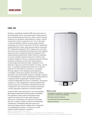 KARTA OFERTOWA LWA 100 Naścienne, kompaktowe urządzenie LWA 100 przeznaczone jest dla Użytkowników, którzy cenią wysoki komfort ciepłej wody oraz dobrze wentylowanego pomieszczenia. Główne atuty to centralna wentylacja oraz ogrzewanie wody użytkowej w małych i średnich mieszkaniach, domach o powierzchni 120 -140 m2. W zwartej i estetycznej obudowie znajduje się pompa ciepła, jednostka wentylacyjna oraz zbiornik o pojemności 100 litrów z wbudowaną grzałką elektryczną. Pompa ciepła ogrzewa wodę do temperatury 55°C. Maksymalna temperatura 85°C osiągana jest w razie takiej konieczności przez wbudowany element grzejny. W celu szybszego dogrzania wody lub osiągnięcia temperatury większej niż 55°C należy zastosować przycisk grzałki. Żądana wartość jest nastawiana przy pomocy pokrętła regulatora temperatury. W dolnej części urządzenia znajduje się również 3-stopnowy przełącznik obrotowy dmuchawy, pozwalający na sterowanie ilością powietrza przetłaczanego przez wymiennik ciepła. Użytkownik ma do dyspozycji 3 tryby pracy centralnej wentylacji: normalny - dzienny, party - w przypadku większego zapotrzebowania na wymianę powietrza oraz tryb obniżony, stosowany np. w przypadku dłuższego wyjazdu. Panel obsługowy został wyposażony w niezbędne czujniki pracy sprężarki i dmuchawy, regulator temperatury oraz przycisk grzałki. Dzięki temu obsługa urządzenia jest nieskomplikowana i prosta. Kompaktowa konstrukcja wykonana z najwyższej jakości komponentów, niewielkie wymiary i estetyczny wygląd LWA 100 stanowi o niezwykłości i atrakcyjności urządzenia na rynku. Wyjątkowość urządzenia podkreśla fakt, że jest przeznaczone do stosunkowo niewielkich pomieszczeń a Użytkownik nie jest zmuszony do montowania kosztownych i wielkich gabarytowo systemów do centralnej wentylacji. Urządzenie LWA 100 jest wyposażone w ultra cichy wentylator, który wytwarza podciśnienie w pomieszczeniach mieszkalnych. Przez pojedyncze zawory powietrza doprowadza świeże powietrze do pomieszczeń. Zasysa ciepłe powietrze z pomieszczeń i wykorzystuje je do ogrzania 100-litrowego zbiornika. Urządzenie nadaje się również do dodatkowego rozbudowania. Niewątpliwą zaletą tego systemu jest decentralny dopływ powietrza, dlatego można zrezygnować ze skomplikowanych instalacji. To pozwala na znaczne redukcje kosztów związanych z montażem. Główne cechy: Kompaktowe urządzenie z funkcjami: wentylacji i ogrzewania ciepłej wody użytkowej Niezależny system wentylacji Trzy stopniowy tryb pracy wentylacji Montaż naścienny Błędy oraz zmiany techniczne zastrzeżone STIEBEL ELTRON Polska Sp. z o.o. | Działkowa 2 | 02-234 Warszawa | Tel 22/609-20-30 | Fax 22/609-20-29 Internet: www.stiebel-eltron.pl | www.PompaCiepla.com.pl | www.pakiety-solarne.pl | E-mail: [email protected] KARTA OFERTOWA Typ LWA 100 Nr katalogowy 220278 Dane techniczne Zakres stosowania WQA 1) °C Maksymalna temperatura c.w.u. - tylko pompa ciepła °C +55 Maksymalna temperatura c.w.u. - tylko pompa ciepła °C +85 h 6,3 / 3,6 Czas nagrzewu i dogrzewania c.w.u. - tylko pompa ciepła z 15°C do 55°C (P20/W40)2) i 90 m³/h strumienie przepływu powietrza Pobór mocy wbudowanej grzałki elektrycznej Pobór mocy wentylatora stopieñ 1 / 2 / 3 / 4 / 5 Zabezpieczenie / Maksymalny pobór mocy Pobór mocy (L20/W58)3) i temperaturze c.w.u. 45°C Moc grzewcza pompy ciepła (L20/W58) i temperaturze c.w.u. 45°C 3) Napięcie częstotliwość od +15 do +30 kW 3,0 W 17 / 23,1 / 29 / 36 / 71 A/kW kW W V/Hz Rodzaj ochrony 16 / 3,45 0,35 800 1/N/PE ~ 230 / 50 IP 24 Pompa ciepła Dopuszczalne ciśnienie robocze obiegu termodynamicznego MPa Czynnik chłodniczy Ilość czynnika 2,8 R290 g 150 Ciepła woda użytkowa Dopuszczalne ciśnienie robocze c.w.u. MPa 0,6 l 100 Wysokość mm 1290 Szerokość mm 510 Głębokość mm 510 kg 65 Pojemność zasobnika c.w.u. Ciężar urządzenia Wentylacja Strumień przepływu powietrza doprowadzanego dla trybu wentylacji m³/h 60 - 130 Minimalny strumień przepływu przy trybie pompy ciepła m³/h 60 Pa 75 Maksymalne dostępne ciśnienie zewnętrzne przy maksymalnych obrotach wentylatora i 130 m³/h strumienia przepływu powietrza Przyłącza Przyłącza c.w.u. cale G 1 GZ Odprowadzenie kondensatu cale cale 1/2, wąż 1,55 m DN 125 dB(A) 45 Króćce odprowadzenie powietrza / doprowadzenia powietrza Poziom hałasu 1) WQA - system źródła ciepła - powietrze wentylacyjne (strona zimna). 2) (P20/W40) - temperatura powietrza doprowadzanego +20°C, wilgotność powietrza doprowadzanego 40% 3) (P20/W58) - temperatura powietrza doprowadzanego +20°C, wilgotność powietrza doprowadzanego 58% Błędy oraz zmiany techniczne zastrzeżone STIEBEL ELTRON Polska Sp. z o.o. | Działkowa 2 | 02-234 Warszawa | Tel 22/609-20-30 | Fax 22/609-20-29 Internet: www.stiebel-eltron.pl | www.PompaCiepla.com.pl | www.pakiety-solarne.pl | E-mail: [email protected]