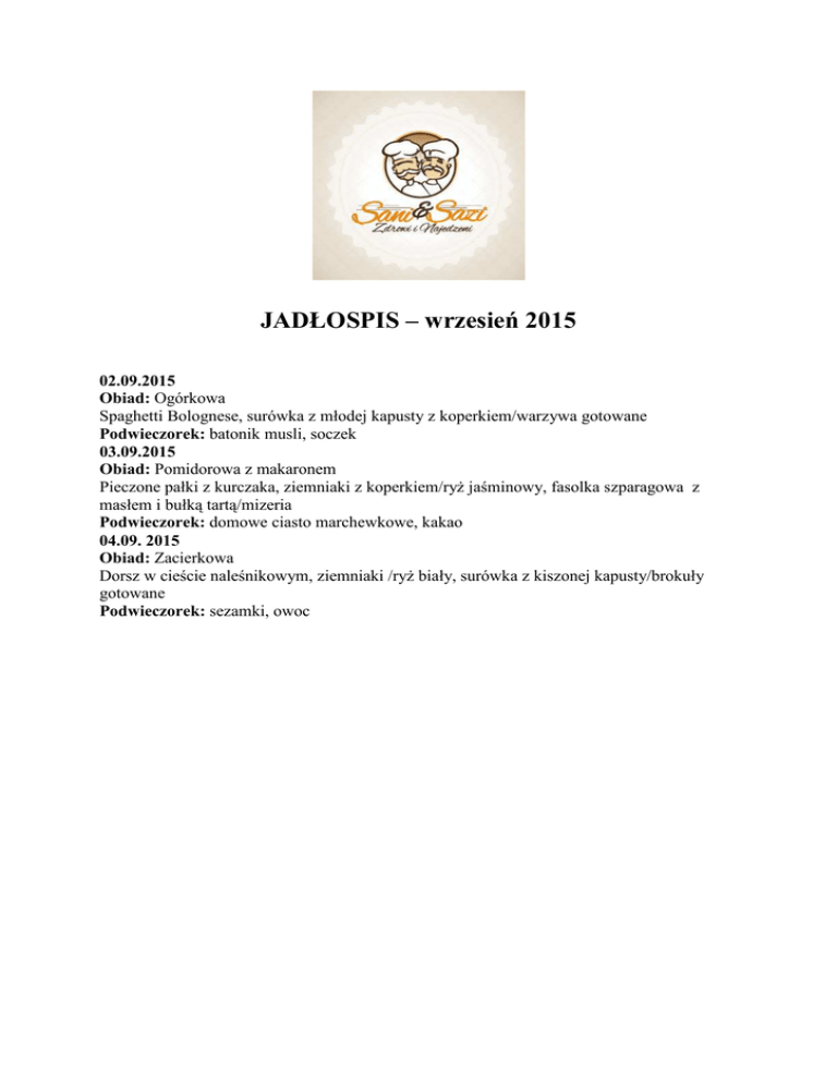 JADŁOSPIS – wrzesień 2015 02.09.2015 Obiad: Ogórkowa Spaghetti Bolognese, surówka z młodej kapusty z koperkiem/warzywa gotowane Podwieczorek: batonik musli, soczek 03.09.2015 Obiad: Pomidorowa z makaronem Pieczone pałki z kurczaka, ziemniaki z koperkiem/ryż jaśminowy, fasolka szparagowa z masłem i bułką tartą/mizeria Podwieczorek: domowe ciasto marchewkowe, kakao 04.09. 2015 Obiad: Zacierkowa Dorsz w cieście naleśnikowym, ziemniaki /ryż biały, surówka z kiszonej kapusty/brokuły gotowane Podwieczorek: sezamki, owoc 07.09.2015 Obiad: Szczawiowa z ziemniakami i jajkiem Pierogi z mięsem domowej produkcji, sałatka z pomidora z cebulką/fasolka szparagowa Podwieczorek: biszkopty, owoc 08.09.2015 Obiad: Barszcz czerwony zabielany Pieczony indyk w sosie własnym, kopytka/kasza jęczmienna, mizeria/marchewka z groszkiem Podwieczorek: bułka drożdżowa, soczek 09.09.2015 Obiad: Jarzynowa Antrykot z piersi kurczaka, ziemniaki z koperkiem/ ryż jaśminowy, sałatka wiosenna/buraczki zasmażane Podwieczorek: batonik owsiany, owoc 10.09.2015 Obiad: Barszcz biały z kiełbaską Gołąbki z mięsem i kapustą po hiszpańsku z sosem pomidorowym, ziemniaki z koperkiem Podwieczorek: domowy sernik 11.09.2015 Obiad: Ogórkowa Paluszki z morszczuka, ziemniaki z koperkiem/ryż basmati, surówka z kiszonej kapusty/brokuły gotowane Podwieczorek: sałatka owocowa z jogurtem naturalnym 14.09.2015 Obiad: Rosół Kotlet schabowy, ziemniaki z koperkiem/kasza jęczmienna, kapusta zasmażana/mizeria Podwieczorek: serek Danio 15.09.2015 Obiad: Krupnik Kluski leniwe, surówka z marchewki i jabłka z pestkami słonecznika Podwieczorek: domowa szarlotka z bitą śmietaną 16.09.2015 Obiad: Ogórkowa Lasagne z mięsem z sosem pomidorowym, mix warzyw gotowanych Podwieczorek: owoc, jogurt 17.09.2015 Obiad: Pomidorowa z makaronem Kotlet mielony z szynki wieprzowej, ziemniaki z koperkiem/kasza jęczmienna, marchewka z groszkiem/surówka wielowarzywna Podwieczorek: ciasteczka owsiane, soczek 18.09.2015 Obiad: Pieczarkowa Burger z mintaja, ziemniaki z koperkiem/ryż jaśminowy, brokuły gotowane/kiszona kapusta Podwieczorek: bułeczka drożdżowa 21.09.2015 Obiad: Zupa jarzynowa Pierś kurczaka w cieście naleśnikowym, ziemniaki z koperkiem/ ryż paraboliczny, sałatka wiosenna z sosem jogurtowo-ziołowym/mix warzyw gotowanych Podwieczorek: herbatniczki Be-be, owoc 22.09. 2015 Obiad: Ogórkowa Bitka wieprzowa w sosie własnym, kluski śląskie/ kasza gryczana, sałatka na bazie sałaty zielonej z pomidorem, ogórkiem, rzodkiewką z sosem jogurtowo-ziołowym/buraczki zasmażane Podwieczorek: domowe ciasto drożdżowe , kakao 23.09.2015 Obiad: Rosół Tortilla z piersią kurczaka i warzywami, surówka Colesław Podwieczorek: jogurt naturalny, owoc 24.09.2015 Obiad: Zupa z fasolki szparagowej Gulasz wieprzowy, makaron świderki/ kasza gryczana, buraczki zasmażane Podwieczorek: kanapeczki rozmaitości, herbata 25.09.2015 Obiad: Kalafiorowa Naleśniki z białym serem i śmietaną Podwieczorek: soczek, batonik 28.09.2015 Obiad: Pomidorowa z makaronem Grillowana pierś kurczaka, dwa sosy do wyboru, ziemniaki z koperkiem/ryż basmati, sałatka wiosenna/mix warzyw gotowanych Podwieczorek: pączek 29.09.2015 Obiad: Krupnik Sznycelki z indyka ,ziemniaki z koperkiem/ ryż paraboliczny, fasolka szparagowa z bułką tartą i masełkiem, surówka z marchewki i jabłka Podwieczorek: owoc, jogurt 30.09.2015 Obiad: Ogórkowa Pulpeciki wieprzowe w sosie pomidorowym, kopytka/kasza pęczak, mix warzyw gotowanych/surówka wielowarzywna Podwieczorek: budyń waniliowy z polewą czekoladową