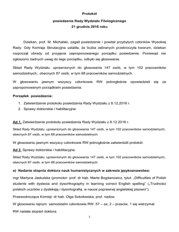 Protokół posiedzenia Rady Wydziału Filologicznego 21 grudnia 2016 roku Dziekan, prof. M. Michalski, zagaił posiedzenie i powitał przybyłych członków Wysokiej Rady. Gdy Komisja Skrutacyjna ustaliła, że liczba zebranych przekroczyła kworum, dziekan rozpoczął obrady od przyjęcia zaproponowanego porządku posiedzenia. Ponieważ nie zgłoszono żadnych uwag do tego porządku, odbyło się głosowanie. Skład Rady Wydziału: uprawnionych do głosowania 147 osób, w tym 102 pracowników samodzielnych;. obecnych 87 osób, w tym 68 pracowników samodzielnych. W głosowaniu jawnym wszyscy członkowie RW jednogłośnie opowiedzieli się za zaproponowanym porządkiem posiedzenia. Porządek posiedzenia: 1. Zatwierdzenie protokołu posiedzenia Rady Wydziału z 8.12.2016 r. 2. Sprawy doktorskie i habilitacyjne. Ad 1. Zatwierdzenie protokołu posiedzenia Rady Wydziału z 8.12.2016 r. Skład Rady Wydziału: uprawnionych do głosowania 147 osób, w tym 102 pracowników samodzielnych;. obecnych 87 osób, w tym 68 pracowników samodzielnych. W głosowaniu jawnym wszyscy członkowie RW jednogłośnie zatwierdzili protokół. Ad 2. Sprawy doktorskie i habilitacyjne. Skład Rady Wydziału: uprawnionych do głosowania 147 osób, w tym 102 pracowników samodzielnych;. obecnych 87 osób, w tym 68 pracowników samodzielnych. a) Nadanie stopnia doktora nauk humanistycznych w zakresie językoznawstwa: mgr Martyna Jaskulska (promotor: prof. dr hab. Marta Bogdanowicz, tytuł: „Difficulties of Polish students with dyslexia and dysorthography in learning correct English spelling” („Trudności polskich uczniów z dysleksją i dysortografią w nauce poprawnej angielskiej pisowni”). Przewodnicząca Komisji: dr hab. Olga Sokołowska, prof. nadzw. W głosowaniu tajnym samodzielni członkowie RW: 57 – za, 2 – przeciw, 1 się wstrzymał. RW nadała stopień doktora. 1 b) Wyróżnienie pracy doktorskiej: mgr Martyna Jaskulska (promotor: prof. dr hab. Marta Bogdanowicz, tytuł: „Difficulties of Polish students with dyslexia and dysorthography in learning correct English spelling” („Trudności polskich uczniów z dysleksją i dysortografią w nauce poprawnej angielskiej pisowni”). Przewodnicząca Komisji: dr hab. Olga Sokołowska, prof. nadzw. W głosowaniu tajnym samodzielni członkowie RW: 53 – za, 3 – przeciw, 2 się wstrzymało. RW wyróżniła pracę doktorską. c) Nadanie stopnia doktora nauk humanistycznych w zakresie literaturoznawstwa: mgr Iwona Lepka (promotor: dr hab. Andrzej Ceynowa, prof. nadzw., tytuł: „We’re Here, We’re Queer, Get Used To It!: The Autobiographical Writings of the Violet Quill” [„To my, zboczeńcy, jesteśmy tu, przyzwyczajcie się!: Twórczość autobiograficzna w literaturze Violet Quill”]). Przewodnicząca Komisji: dr hab. Monika Rzeczycka, prof. nadzw. W głosowaniu tajnym samodzielni członkowie RW: 50 – za, 5 – przeciw, 3 się wstrzymało. RW nadała stopień doktora. d) Nadanie stopnia doktora nauk humanistycznych w zakresie nauk o sztuce: mgr Przemysław Zawrotny (promotor: prof. dr hab. Jerzy Szyłak, tytuł: „Opowieści o religii w twórczości mistrzów komiksu współczesnego”). Przewodniczący Komisji: prof. dr hab. Jan Ciechowicz. W głosowaniu tajnym samodzielni członkowie RW: 57 – za, 2 – przeciw, 2 się wstrzymało. RW nadała stopień doktora. e) Wyróżnienie pracy doktorskiej: mgr Przemysław Zawrotny (promotor: prof. dr hab. Jerzy Szyłak, tytuł: „Opowieści o religii w twórczości mistrzów komiksu współczesnego”). Przewodniczący komisji: prof. dr hab. Jan Ciechowicz W głosowaniu tajnym samodzielni członkowie RW: 46 – za, 7 – przeciw, 5 się wstrzymało. RW wyróżniła pracę doktorską. f) Wyznaczenie członków komisji habilitacyjnej dr Iwony Legutko-Marszałek z Instytutu Filologii Germańskiej. Skład Rady Wydziału: uprawnionych do głosowania 147osób, w tym 102 pracowników samodzielnych;. obecnych 87 osób, w tym 68 pracowników samodzielnych. Wyrażenie zgody na przeprowadzenie postępowania habilitacyjnego. 2 W głosowaniu tajnym samodzielni członkowie RW: 57 – za, 2 – przeciw, 1 się wstrzymał. RW wyraziła zgodę na rozpoczęcie postępowania habilitacyjnego. Wyznaczenie członków Komisji. Przed głosowaniem prof. M. Ossowski zapytał, dlaczego przedłożono Wysokiej Radzie tylko kandydaturę prof. G. Łopuszańskiej-Kryszczuk, skoro dyrekcja Instytutu Filologii Germańskiej postulowała, by wyboru dokonać spośród trzech osób, m.in. prof. Liliany Sadownik z UMCS-u. Dziekan, prof. T. Swoboda odpowiedział, że jest lepiej ze względów wizerunkowych, by specjalista w danej dziedzinie naukowej pochodził z UG. Po tej wymianie zdań nastąpiło głosowanie. ― Prof. dr hab. Grażyna Łopuszańska-Kryszczuk – recenzent. W głosowaniu tajnym samodzielni członkowie RW: 44 – za, 7 – przeciw, 4 się wstrzymało. RW wyznaczyła recenzenta. ― Dr hab. Danuta Olszewska, prof. nadzw. – sekretarz. W głosowaniu tajnym samodzielni członkowie RW: 54 – za, 2 – przeciw, 2 się wstrzymało. RW powołała sekretarza Komisji. ― Dr hab. Jan Sikora, prof. nadzw. – członek Komisji. W głosowaniu tajnym samodzielni członkowie RW: 51 – za, 5 – przeciw, 1 się wstrzymał. RW wyznaczyła członka Komisji. Po zakończeniu głosowań dziekan, prof. M. Michalski, podał termin następnego posiedzenia Wysokiej Rady, które się odbędzie 12 stycznia 2017 r., i zamknął obrady. Na tym protokół został zakończony. Protokółował dr Piotr Doroszewski. 3