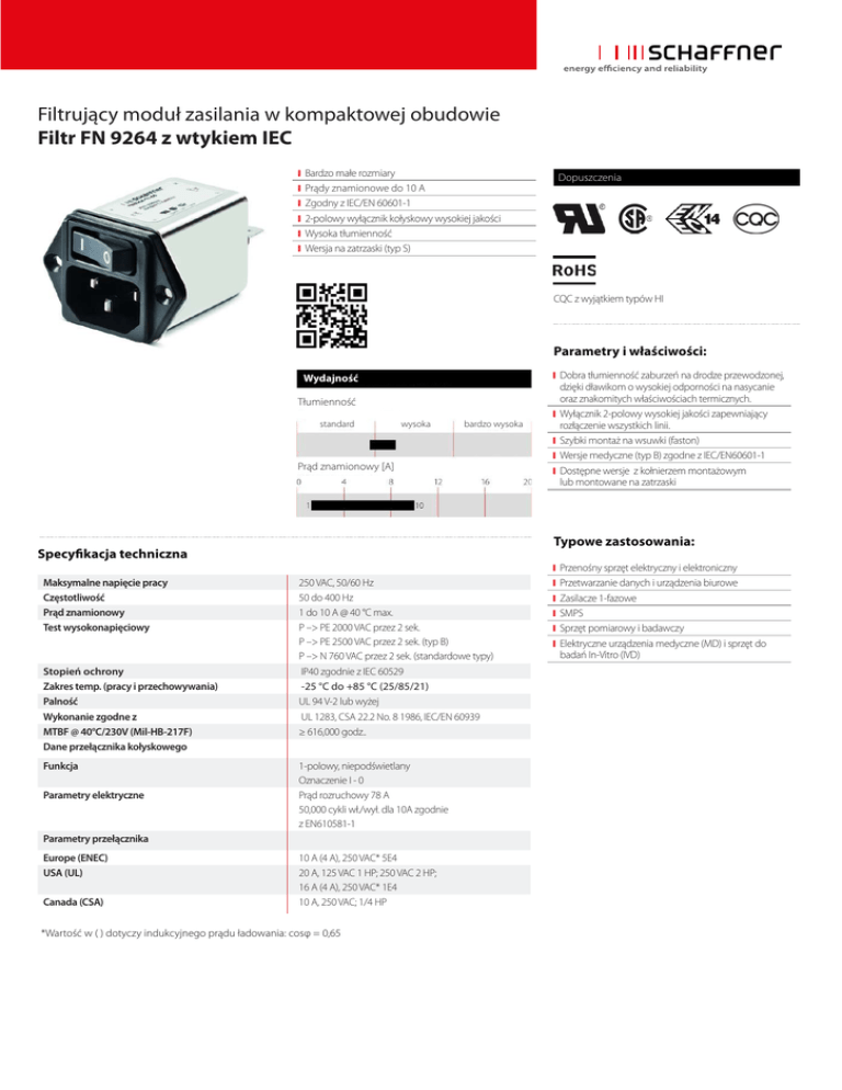 Filtrujący moduł zasilania w kompaktowej obudowie Filtr FN 9264 z wtykiem IEC ┃ Bardzo małe rozmiary Dopuszczenia ┃ Prądy znamionowe do 10 A ┃ Zgodny z IEC/EN 60601-1 ┃ 2-polowy wyłącznik kołyskowy wysokiej jakości ┃ Wysoka tłumienność ┃ Wersja na zatrzaski (typ S) (CQC HI-types) CQC z except wyjątkiem typów HI Parametry i właściwości: ┃ Dobra tłumienność zaburzeń na drodze przewodzonej, Wydajność Tłumienność standard wysoka bardzo wysoka ┃ ┃ Prąd znamionowy [A] ┃ ┃ dzięki dławikom o wysokiej odporności na nasycanie oraz znakomitych właściwościach termicznych. Wyłącznik 2-polowy wysokiej jakości zapewniający rozłączenie wszystkich linii. Szybki montaż na wsuwki (faston) Wersje medyczne (typ B) zgodne z IEC/EN60601-1 Dostępne wersje z kołnierzem montażowym lub montowane na zatrzaski Typowe zastosowania: Specyfikacja techniczna ┃ Przenośny sprzęt elektryczny i elektroniczny Maksymalne napięcie pracy Częstotliwość Prąd znamionowy Test wysokonapięciowy Stopień ochrony Zakres temp. (pracy i przechowywania) Palność Wykonanie zgodne z MTBF @ 40°C/230V (Mil-HB-217F) Dane przełącznika kołyskowego Funkcja Parametry elektryczne 250 VAC, 50/60 Hz 50 do 400 Hz 1 do 10 A @ 40 °C max. P –> PE 2000 VAC przez 2 sek. P –> PE 2500 VAC przez 2 sek. (typ B) P –> N 760 VAC przez 2 sek. (standardowe typy) IP40 zgodnie z IEC 60529 -25 °C do +85 °C (25/85/21) UL 94 V-2 lub wyżej UL 1283, CSA 22.2 No. 8 1986, IEC/EN 60939 ≥ 616,000 godz.. 1-polowy, niepodświetlany Oznaczenie I - 0 Prąd rozruchowy 78 A 50,000 cykli wł./wył. dla 10A zgodnie z EN610581-1 Parametry przełącznika Europe (ENEC) USA (UL) Canada (CSA) 10 A (4 A), 250 VAC* 5E4 20 A, 125 VAC 1 HP; 250 VAC 2 HP; 16 A (4 A), 250 VAC* 1E4 10 A, 250 VAC; 1/4 HP *Wartość w ( ) dotyczy indukcyjnego prądu ładowania: cosφ = 0,65 ┃ Przetwarzanie danych i urządzenia biurowe ┃ Zasilacze 1-fazowe ┃ SMPS ┃ Sprzęt pomiarowy i badawczy ┃ Elektryczne urządzenia medyczne (MD) i sprzęt do badań In-Vitro (IVD) 2 Tabela wyboru filtrów Filter Filtr Rated current Prąd znamionowy Leakage Prądcurrent* upływu* Inductance Indukcyjność Resistance Rezystancja Output Złącza @ 40°C (25°C) @ 250VAC/50Hz L Capacitance Pojemność Cx Cy** R connections Weight Waga [A] [μA] [mH] [μF] [nF] [kΩ] FN 9264-xx-1-06-y 1 (1.2) 373/2** 5.15 0.1 2.2 1000 -06 55 FN 9264-xx-2-06-y 2 (2.3) 373/2** 2.7 0.1 2.2 1000 -06 55 FN 9264-xx-4-06-y 4 (4.6) 373/2** 1 0.1 2.2 1000 -06 55 FN 9264-xx-6-06-y 6 (6.9) 373/2** 0.3 0.1 2.2 1000 -06 55 10 (11.5) 373/2** 0.21 0.1 2.2 1000 -06 55 FN 9264-xx-10-06-y [g] Maximum leakage under normalwarunkach operatingpracy. conditions. if the neutral linezostanie is interrupted, worst leakage could reachpodwójną twice this level. ** Maksymalny upływ w normalnych Uwaga:Note: jeśli przewód neutralny przerwany, prądcase upływu może osiągnąć wartość ** B types without Y2-capacitors ** Wersje medyczne (B) bez kondensatorów Y2 Schemat elektryczny Oznaczenie filtrów Typy standardowe i medyczne (B) Tylko dla wersji S na zatrzaski Puste: grubość panelu 1.0 do 2.5 mm 30: grubość panelu 2.6 do 3.5 mm 06: Złącze tyou Faston 6.3x0.8 mm (uszko do lutowania) 1 do 10: Prąd znamionowy Puste: Wersja standardowa B: Wersja medyczna B (bez kondensatorów Y, prąd upływu max 2uA) Puste: Standardowa obudowa z kołnierzem montażowym S: Wersja na zatrzaski, z zatrzaskiem w ułożeniu pionowym Oznaczenie filtrów Np.: FN 9264-1-06, FN 9264B-6-06, FN 9264SB-4-06-30 Sieć Obciążenie 3 Tłumienność wtrąceniowa Wg CISPR 17; A = 50 Ω/50 Ω sym; B = 50 Ω/50 Ω asym typ 1 A typ 2 A typ 4 A typ 6 A dB dB dB dB 90 90 90 90 80 80 A 70 60 50 A 70 70 60 60 B 50 B 80 80 A 70 B 50 50 40 40 40 40 30 30 30 30 20 20 20 20 10 10 10 10 0 10k 100k 1M 10M 100M 0 10k 100k 1M 10M 100M 0 10k 100k 1M 10M 100M 0 10k typ 10 A dB 90 80 70 A 60 50 40 B 30 20 10 0 10k typ 1 B typ 10 B 100k 1M 10M 100M typ 2 B typ 4 B A 60 typ 6 B B 100k 1M 10M 100M 4 Dane mechaniczne FN 9264 Wycięcie w panelu FN 9264S Wycięcie w panelu Typ złącza IEC C14 Instalacja