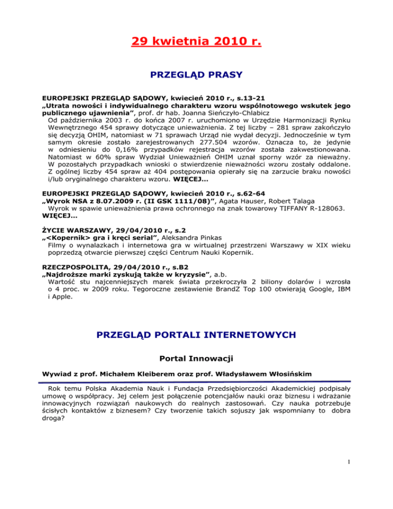29 kwietnia 2010 r. PRZEGLĄD PRASY EUROPEJSKI PRZEGLĄD SĄDOWY, kwiecień 2010 r., s.13-21 „Utrata nowości i indywidualnego charakteru wzoru wspólnotowego wskutek jego publicznego ujawnienia”, prof. dr hab. Joanna Sieńczyło-Chlabicz Od października 2003 r. do końca 2007 r. uruchomiono w Urzędzie Harmonizacji Rynku Wewnętrznego 454 sprawy dotyczące unieważnienia. Z tej liczby – 281 spraw zakończyło się decyzją OHIM, natomiast w 71 sprawach Urząd nie wydał decyzji. Jednocześnie w tym samym okresie zostało zarejestrowanych 277.504 wzorów. Oznacza to, że jedynie w odniesieniu do 0,16% przypadków rejestracja wzorów została zakwestionowana. Natomiast w 60% spraw Wydział Unieważnień OHIM uznał sporny wzór za nieważny. W pozostałych przypadkach wnioski o stwierdzenie nieważności wzoru zostały oddalone. Z ogólnej liczby 454 spraw aż 404 postępowania opierały się na zarzucie braku nowości i/lub oryginalnego charakteru wzoru. WIĘCEJ… EUROPEJSKI PRZEGLĄD SĄDOWY, kwiecień 2010 r., s.62-64 „Wyrok NSA z 8.07.2009 r. (II GSK 1111/08)”, Agata Hauser, Robert Talaga Wyrok w spawie unieważnienia prawa ochronnego na znak towarowy TIFFANY R-128063. WIĘCEJ… ŻYCIE WARSZAWY, 29/04/2010 r., s.2 „<Kopernik> gra i kręci serial”, Aleksandra Pinkas Filmy o wynalazkach i internetowa gra w wirtualnej przestrzeni Warszawy w XIX wieku poprzedzą otwarcie pierwszej części Centrum Nauki Kopernik. RZECZPOSPOLITA, 29/04/2010 r., s.B2 „Najdroższe marki zyskują także w kryzysie”, a.b. Wartość stu najcenniejszych marek świata przekroczyła 2 biliony dolarów i wzrosła o 4 proc. w 2009 roku. Tegoroczne zestawienie BrandZ Top 100 otwierają Google, IBM i Apple. PRZEGLĄD PORTALI INTERNETOWYCH Portal Innowacji Wywiad z prof. Michałem Kleiberem oraz prof. Władysławem Włosińskim Rok temu Polska Akademia Nauk i Fundacja Przedsiębiorczości Akademickiej podpisały umowę o współpracy. Jej celem jest połączenie potencjałów nauki oraz biznesu i wdrażanie innowacyjnych rozwiązań naukowych do realnych zastosowań. Czy nauka potrzebuje ścisłych kontaktów z biznesem? Czy tworzenie takich sojuszy jak wspomniany to dobra droga? 1 Prof. Kleiber: Dla sfer biznesu i nauki nie ma absolutnie innej drogi niż współpraca. Jako naukowiec postrzegam sprawę z punktu widzenia korzyści płynących dla samej nauki. Do tego żeby nauka wypełniła rolę, którą jej się zasadnie przypisuje to musi nawiązywać kontakty z szeroko rozumianą sferą biznesu. Niezbędne jest więc korzystanie z tego typu instytucji pośredniczącej, jaką jest na przykład Fundacja Przedsiębiorczości Akademickiej, która wdraża pomysły naukowych do realnych zastosowań. Takie instytucje istnieją na świecie od dawna i są bardzo skuteczne. Prof. Włosiński: W dodatku ich funkcjonowanie pomaga przezwyciężyć problem mentalnościowy dotyczący współpracy biznesu i nauki. Problem ten jest widoczny i wśród naukowców i wśród przedsiębiorców. Przełamywanie tych barier to zadanie dla podmiotów takich jak wspomniana fundacja bo taki wyspecjalizowany podmiot lepiej sobie z tym poradzi od kogokolwiek kto funkcjonuje tylko w jednym ze światów. Czy po tej pierwszej jaskółce jaką było podpisanie umowy o współpracy między PAN a fundacją do lotu poderwały się kolejne? K: Bałbym się takiego stwierdzenia bez dostępu do szczegółowych danych. Rzeczona współpraca wspomaga na pewno zmianę mentalnościową. W tej chwili rzeczą wstydliwą przestaje być robienie badań z myślą o tym by zostały one potem zastosowane w realnym użytkowaniu. Niedawno takich rzeczy nawet się nie wypowiadało. Dziś jest już dużo lepiej. Żyjemy w kraju w którym tego typu bariery w myśleniu odgrywają zbyt ważną rolę. Konieczne jest więc szybkie ich przezwyciężenie. W: Proces zmiany nastawienia polskich uczonych trwa, choć nie można powiedzieć, że następuje tutaj jakiś skok. Niemniej proces postępuje. Dziś pojawiają się postulaty, aby badania poznawcze przekładały się na konkretne korzyści społeczne, by odkrycia były potwierdzone w formie np. patentów. Myśmy do tego nie przykładali znaczenia. Nie chroniliśmy własnych osiągnięć i nie myśleliśmy o tym by stanowiły one wkład w życie tu i teraz. Cieszymy się więc, że są instytucje, które stawiają sobie taki cel. Dlaczego PAN czy inne ośrodki zarządzające nauką w Polsce nie stworzyły silnych instytucji wyławiających najciekawsze projekty naukowe i wdrażające je? W: Bierze się to stąd, że w Polsce i w ogóle na świecie profesorowie i naukowcy na innych szczeblach kariery naukowej nie są specjalistami od wdrożeń. Oni się po prostu czym innym zajmują, pełnię inne funkcje w systemie nauki. Poważną przyczyną braku zainteresowania pracowników nauki projektami innowacyjnymi i wdrażaniem wyników badań naukowych do praktyki jest system awansu naukowego, który tylko w niewielkim stopniu uwzględnia prace o charakterze innowacyjnym. Ów system musi być kompletny, czyli powinien zawierać w sobie organizacje trzeciego sektora działające w otoczeniu biznesu. Takie instytucje mogą skuteczniej rozwijać współpracę między nauką i gospodarką. Profesorowie mający dobre wyniki, dobre pomysły nie powinni angażować się tam, gdzie czują się mniej kompetentni. Angażowanie profesorów w działania inne niż badawcze jest w 90% przypadków złym posunięciem. Jedynie mała część kadr naukowych ma zdolności nie tylko wymyślania nowych rzeczy, ale i wprowadzania ich do praktycznych zastosowań. Wdrożenia wymagają umiejętności zarządzania projektami i organizacji rozmaitych relacji na linii naukaprzemysł. Decydenci chcieliby żeby już na etapie tworzenia idei, samego zamysłu badań, myśleć o tym jaki one dadzą efekt dla gospodarki. Tymczasem nigdzie na świcie tak nie jest. Taki jest świat naukowy i to nie jest jego wada tylko specyfika, z którą trudn