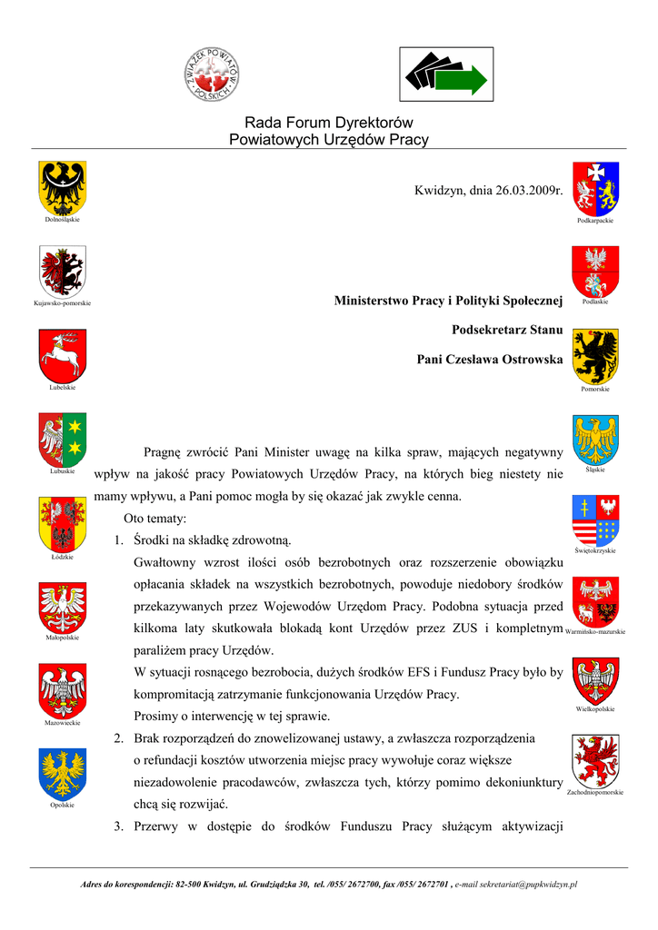 Rada Forum Dyrektorów Powiatowych Urzędów Pracy Kwidzyn, dnia 26.03.2009r. Dolnośląskie Podkarpackie Ministerstwo Pracy i Polityki Społecznej Kujawsko-pomorskie Podlaskie Podsekretarz Stanu Pani Czesława Ostrowska Lubelskie Pomorskie Pragnę zwrócić Pani Minister uwagę na kilka spraw, mających negatywny Lubuskie Śląskie wpływ na jakość pracy Powiatowych Urzędów Pracy, na których bieg niestety nie mamy wpływu, a Pani pomoc mogła by się okazać jak zwykle cenna. Oto tematy: 1. Środki na składkę zdrowotną. Świętokrzyskie Łódzkie Gwałtowny wzrost ilości osób bezrobotnych oraz rozszerzenie obowiązku opłacania składek na wszystkich bezrobotnych, powoduje niedobory środków przekazywanych przez Wojewodów Urzędom Pracy. Podobna sytuacja przed Małopolskie kilkoma laty skutkowała blokadą kont Urzędów przez ZUS i kompletnym Warmińsko-mazurskie paraliŜem pracy Urzędów. W sytuacji rosnącego bezrobocia, duŜych środków EFS i Fundusz Pracy było by kompromitacją zatrzymanie funkcjonowania Urzędów Pracy. Mazowieckie Prosimy o interwencję w tej sprawie. Wielkopolskie 2. Brak rozporządzeń do znowelizowanej ustawy, a zwłaszcza rozporządzenia o refundacji kosztów utworzenia miejsc pracy wywołuje coraz większe niezadowolenie pracodawców, zwłaszcza tych, którzy pomimo dekoniunktury Zachodniopomorskie Opolskie chcą się rozwijać. 3. Przerwy w dostępie do środków Funduszu Pracy słuŜącym aktywizacji Adres do korespondencji: 82-500 Kwidzyn, ul. Grudziądzka 30, tel. /055/ 2672700, fax /055/ 2672701 , e-mail [email protected] bezrobotnych są trudne do wytłumaczenia naszym klientom. Wobec informacji o wysokiej rezerwie z roku ubiegłego, ciągłych i licznych pomysłach na ich wydatkowanie przekazywanych przez wiodących polityków, mówienie osobom bezrobotnym, Ŝe Urząd Pracy dziś nie ma środków, Ŝe proszę przyjść za miesiąc nie przysparza nam przyjaciół. Prosimy o spowodowanie stałego i płynnego dostępu do Funduszu Pracy tak, by jego okresowe braki nie hamowały aktywizacji osób bezrobotnych. 4. Informujemy, Ŝe po konsultacjach w ramach Ogólnopolskiego forum Dyrektorów PUP-ów opracowaliśmy propozycje poprawek do nowelizacji ustawy o promocji zatrudnienia i instytucjach rynku pracy. Propozycja została przekazana Pani Poseł Izabeli Katarzynie Mrzygłockiej. 5. Mamy równieŜ informację, Ŝe podczas kontroli realizacji standardów, w niektórych województwach kwestionowane jest następujące rozwiązanie: jeŜeli ze wzorów na etatyzację wynika, Ŝe do spełnienia wymogu standardu potrzebne jest zatrudnienie pracowników w urzędzie na ½ etatu, to nie moŜe być to realizowane poprzez zmianę zakresu obowiązków, tylko poprzez wypowiedzenie umowy pracy i ponowne zatrudnienie na 2x po ½ etatu. Rozwiązanie takie jest bardzo ryzykowne dla pracowników i trudniejsze dla rozliczania przez pracodawcę. Sądzimy, Ŝe bardziej elastyczne podejście do wymogów rozporządzenia o standardach, ubarwione odrobiną wyobraźni, ułatwiło by nam pracę. Standardy mają czemuś słuŜyć a nie być celem samym w sobie. Tym bardziej Ŝe przy takim wzroście ilości osób bezrobotnych i spadku ilości ofert pracy zaczyna być to sztuka dla sztuki. 6. Prosimy równieŜ, o ile to moŜliwe, o studzenie pomysłów na dokładanie nam róŜnych „cudownych” rozwiązań takich jak obsługa kredytów hipotecznych, czy włączenie Funduszu Pracy do budŜetów powiatów. Wprowadzenie w Ŝycie tych pomysłów spowoduje, Ŝe aktywizacja osób bezrobotnych stanie się naszym zajęciem pobocznym a nie celem zasadniczym. Z wyrazami szacunku i Ŝyczeniem wytrwałości Jerzy Bartnicki Przewodniczący Ogólnopolskiego Forum Dyrektorów PUP Adres do korespondencji: 82-500 Kwidzyn, ul. Grudziądzka 30, tel. /055/ 2672700, fax /055/ 2672701 , e-mail [email protected] Adres do korespondencji: 82-500 Kwidzyn, ul. Grudziądzka 30, tel. /055/ 2672700, fax /055/ 2672701 , e-mail [email protected]