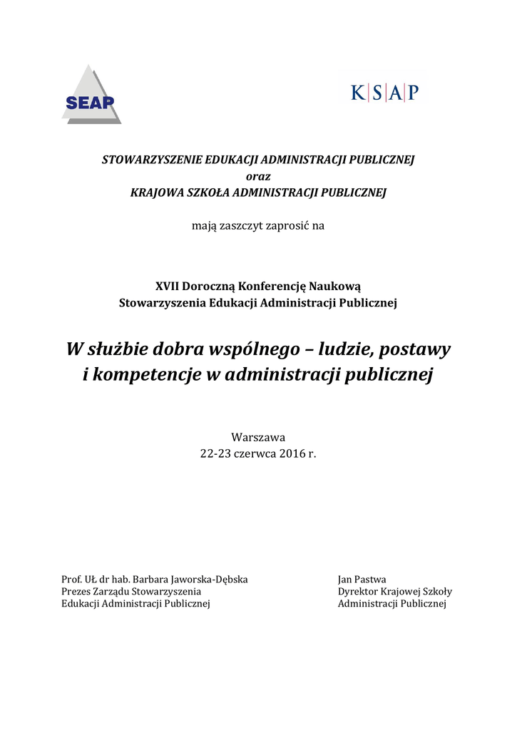 STOWARZYSZENIE EDUKACJI ADMINISTRACJI PUBLICZNEJ oraz KRAJOWA SZKOŁA ADMINISTRACJI PUBLICZNEJ mają zaszczyt zaprosić na XVII Doroczną Konferencję Naukową Stowarzyszenia Edukacji Administracji Publicznej W służbie dobra wspólnego – ludzie, postawy i kompetencje w administracji publicznej Warszawa 22-23 czerwca 2016 r. Prof. UŁ dr hab. Barbara Jaworska-Dębska Prezes Zarządu Stowarzyszenia Edukacji Administracji Publicznej Jan Pastwa Dyrektor Krajowej Szkoły Administracji Publicznej Przedmiot obrad Nie ulega wątpliwości, że stan i jakość kadr administracji publicznej, w szczególności kadry urzędniczej, ma bezpośredni i zasadniczy wpływ na stan i jakość samej administracji. Najlepsze bowiem założenia teoretyczne, struktury organizacyjne, prawo materialne i procesowe nie wpłyną na pożądany obraz administracji publicznej, jeśli nie będą one wykonywane przez odpowiednio przygotowane pod względem merytorycznym i etycznym kadry. Dlatego też tę problematykę czynimy przedmiotem XVII Dorocznej Konferencji Naukowej Stowarzyszenia Edukacji Administracji Publicznej, która jest zaplanowana na 22-23 czerwca 2016 r. W ramach konferencji chcielibyśmy poświęcić obrady m.in. takim zagadnieniom jak: struktura i status prawny służby publicznej, idea służby cywilnej, stabilność kadry urzędniczej, jej etyczny wymiar, apolityczność urzędnicza, fachowość a także poczucie misji. Obrady dotyczyć mogą również wielu innych zagadnień z zakresu szeroko rozumianej problematyki kadr administracji publicznej. Doroczna nagroda naukowa SEAP Pragniemy poinformować o inicjatywie uhonorowania, spośród członków SEAP, autorów najciekawszych referatów zgłoszonych na XVII Doroczną Konferencję Naukową Stowarzyszenia Edukacji Administracji Publicznej, w dwóch kategoriach: magistrowie i doktorzy. Doroczne nagrody SEAP przyznawać będzie Kapituła – Rada Programowa SEAP. Autorzy, którzy do dnia 30 kwietnia nie ukończyli 35 roku życia, zainteresowani udziałem w tym konkursie, proszeni są o zaznaczenie tego w formularzu zgłoszeniowym. Miejsce konferencji Krajowa Szkoła Administracji Publicznej, ul. Wawelska 56, Warszawa Dojazd z Dworca Centralnego autobusami 128 i 175 w kierunku Okęcia. Noclegi Uczestników konferencji prosimy o indywidualne rezerwacje noclegu. W okolicach budynku KSAP znajdują się liczne hotele o zróżnicowanym standardzie. Listę proponowanych miejsc przekazujemy Państwu w osobnym piśmie. Zwiedzanie POLIN Organizatorzy konferencji chcieliby uprzyjemnić Państwu pobyt w Warszawie proponując możliwość zwiedzania Muzeum Historii Żydów Polskich POLIN. Z uwagi na konieczność wcześniejszego wykupienia biletów na wystawę stałą uprzejmie prosimy o wiążące zadeklarowanie (w karcie zgłoszeniowej) chęci wzięcia udziału w wycieczce do tego muzeum. W dniu konferencji możliwość udziału w zwiedzaniu muzeum będzie uzależniona od dostępności biletów. Opłata konferencyjna Dla członków SEAP opłacających składki członkowskie opłata konferencyjna wynosi 550 zł (w tym VAT). Dla osób niebędących członkami SEAP opłata konferencyjna wynosi 700 zł (w tym VAT). Uprzejmie informujemy, iż konferencja ma charakter naukowy i nie stanowi formy kształcenia zawodowego w myśl przepisów podatkowych. Opłata konferencyjna obejmuje: udział w konferencji, wyżywienie, materiały konferencyjne, publikację pokonferencyjną w recenzowanej monografii oraz inne punkty programu konferencji. Opłata nie obejmuje ceny noclegu. Opłaty konferencyjne należy wnosić na rachunek bankowy Stowarzyszenia: Nr konta bankowego: 72 1240 1154 1111 0000 2149 1698. Stowarzyszenie Edukacji Administracji Publicznej, c/o WPiA Gdańsk, ul. Bażyńskiego 6, 80-952 Gdańsk Z podaniem imienia i nazwiska uczestnika i dopiskiem: Konferencja 2016 Termin dokonywania zgłoszeń i uiszczania opłaty konferencyjnej na konto: do 30 kwietnia 2016 r. Uczestników uprzejmie prosimy o jednoczesne przesyłanie zgłoszeń wraz z kopią dowodu przelewu z tytułu opłaty konferencyjnej na [email protected] Termin przesyłania gotowych tekstów referatów: do 30 kwietnia 2016 r. Uczestników uprzejmie prosimy o przesyłanie tekstów referatów na [email protected] Rejestracja uczestników konferencji: 22 czerwca 2016 r. w godzinach porannych Zamknięcie obrad i zakończenie konferencji: 23 czerwca 2016 r. w godzinach popołudniowych