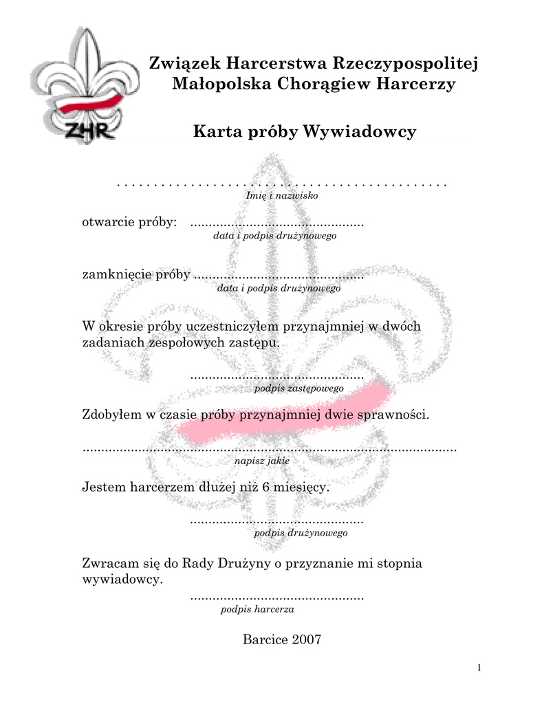 Związek Harcerstwa Rzeczypospolitej Małopolska Chorągiew Harcerzy Karta próby Wywiadowcy ............................................. Imię i nazwisko otwarcie próby: ............................................... data i podpis drużynowego zamknięcie próby .............................................. data i podpis drużynowego W okresie próby uczestniczyłem przynajmniej w dwóch zadaniach zespołowych zastępu. ............................................... podpis zastępowego Zdobyłem w czasie próby przynajmniej dwie sprawności. ..................................................................................................... napisz jakie Jestem harcerzem dłużej niż 6 miesięcy. ............................................... podpis drużynowego Zwracam się do Rady Drużyny o przyznanie mi stopnia wywiadowcy. ............................................... podpis harcerza Barcice 2007 1 Wywiadowca Jestem samodzielny, potrafię pokierować pracą innych. Odkrywam istotę wiary u kieruję się nauką Chrystusa w życiu codziennym. Odnajduję potrzebujących wokół siebie, pomagam im i zachęcam innych do pomocy ubogim. Poradzę sobie samotnie w lesie, zbuduję schronienie, znajdę produkty i ugotuję posiłek. Odnajdę drogę i odczytam mapę, na podstawie własnych szkiców narysuję plan dowolnej okolicy. Potrafię przekazywać wiadomości w terenie i w sieci. Staram się być przykładem dla swoich rówieśników, jestem podporą dla słabszych i otaczam opieką dziewczęta. W domu podejmuję się stałych obowiązków. Znam genezę harcerstwa i jego dzieje, rozumiem strukturę i historię ZHR. Znam historię Polski ostatniego wieku i rozumiem jej związek z współczesnością. Rozpoznaję rozwijam swoje talenty, poznaję dorobek kulturowy Polski i Europy. Pracuję nad tężyzną fizyczną, uprawiam wybraną dziedzinę sportu. Próba (od 6 do 12 miesięcy) Uwaga: Zdobycie sprawności wpisanej przy konkretnym wymaganiu automatycznie zalicza dane wymaganie!. Do dopuszczenia do próby końcowej wymagane jest zdobycie minimum trzech sprawności dwugwiazdkowych. I. Wiedza i umiejętności Lp. Wymagania 1. 2. 3. 4. 5. Sprawność Uwagi Zaliczenie Systematycznie uczestniczy w życiu sakramentalnym. Rozumie 10 Przykazań Bożych, porówna Dekalog z Prawem Harcerskim, wskaże podobieństwa. Potrafi ocenić postawę swoją i cudzą w odniesieniu do Przyrzeczenia i Prawa Harcerskiego. W swoim otoczeniu wskaże przykłady dobra i zła oraz występujące zagrożenia. Stara się zło dobrem zwyciężać. Wykonał prostą pracę artystyczną, np. fotografia, rysunek, zdobnictwo obozowe, monodram, napisał wiersz lub pokierował przygotowaniem przedstawienia zastępu. Przeczytał 3 książki spoza zestawu lektur szkolnych, obejrzał sztukę teatralną, był 2 6. 7. 8. 9. na przedstawieniu operowym. Na temat jednej z nich wygłosił dla ZZ-u kilkuminutową mowę zbudowaną według reguł retoryki. Stara się być przyjazny i opiekuńczy wobec dziewcząt, zorganizował wspólną grę/zbiórkę/zabawę zastępu harcerek i harcerzy. Potrafi uzasadnić szkodliwość stosowania używek, propaguje w swoim środowisku pozaharcerskim postawę abstynencji od alkoholu, tytoniu i narkotyków. Uprawia codzienną gimnastykę poranną. Jest wysportowany. Stosuje zasady higieny osobistej. Przeszedł próbę dzielności, np. broniąc (w szkole, na podwórku) słabszych i pokrzywdzonych lub służąc bliźnim. Próby indywidualne: Lp. Próba indywidualna Uwagi Zaliczenie 1. 2. 3. 4. 3 II. Harcerskie wtajemniczenie Lp. Wymagania 1. 2. 3. 4. 5. 6. 7. 8. 9. 10. 11. 12. Sprawność Uwagi Zaliczenie Zna schemat organizacyjny ZHR i nazwiska Przewodniczącego, Naczelnika, komendanta chorągwi i hufcowego, potrafi uzasadnić odrębność OH-ek i OH-y i rozumie budowę ZHR. Zna genezę powstania skautingu i harcerstwa, wie, kim są wymienione osoby i potrafi wygłosić gawędę o jednej z osób ważnych w dziejach skautingu i harcerstwa: R. Baden-Powell, O. Małkowska, A. Małkowski, ks. Lutosławski, ks. Mauersberger, S. Sedlaczek, A. Kamiński, F. Marciniak, S. Broniewski, T. Strzembosz. Opowie o działaniu Szarych Szeregów i Hufców Polskich w czasie II wojny światowej, o dziejach harcerstwa pod okupacją sowiecką. Opowie, dlaczego powstał ZHR i 5 najważniejszych faktów z historii ZHR. Przeczytał minimum 2 książki harcerskie (np. „Wilk, który nie śpi”, „Kamienie na szaniec”). Zna dzieje, zwyczaje i obrzędy swojej drużyny. Rozpoznaje drużyny należące do jego hufca. Jego mundur jest w nienagannym stanie. Umie uczestniczyć w musztrze apelowej, poprowadzi musztrę zastępu, zna zasady służby wartowniczej. Śpiewa 10 piosenek harcerskich, nie licząc obrzędowych. Rozpoznaje rodzaje drzew w Polsce, krzewów, zbóż, zwierząt, ptaków i owadów oraz owoce leśne. Odróżnia grzyby jadalne od trujących. Rozpoznaje znaki zapowiadające zmianę pogody. Rozróżnia najczęściej spotykane ślady zwierząt i ptaków. Potrafi udawać głos zwierzęcia czy ptaka, podpatrzyć i opisać zachowanie dzikiego zwierzęcia (np. sfotografować). Kierował budową schronienia i bezpiecznej przeprawy przez przeszkodę wodną. Kierował budową schronienia i 4 13. 14. 15. 16. 17. 18. 19. 20. 21. 22. bezpiecznej przeprawy przez barierę wodną. Wyznaczył sobie i przeszedł próbę zręczności (np. wykonał ewolucje na rowerze, łyżwach, deskorolce itp.), ćwiczy pamięć (np. w grze w Kima), zdobył kartę pływacką. Przygotował kilkugodzinną wycieczkę zastępu. Dowiedział się i opowiedział o ciekawym obiekcie na trasie wędrówki. Skorzystał z rozkłady jazdy (PKP, PKS). Pracuje nad swoją tężyzną fizyczną – wyznaczył sobie wymagania i je wypełnił (np. przebył krokiem skautowym 1,5 km, przeskoczył rów szeroki na 2,5 m, przeszedł przez płot wysoki na 2 m, rzucił celnie kamieniem na odległość 25 m). Zmierzył wysokość drzewa i szerokość rzeki. Potrafi narysować 