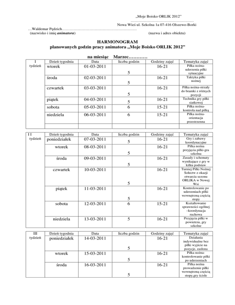 HARMONOGRAM planowanych godzin pracy animatora „Moje