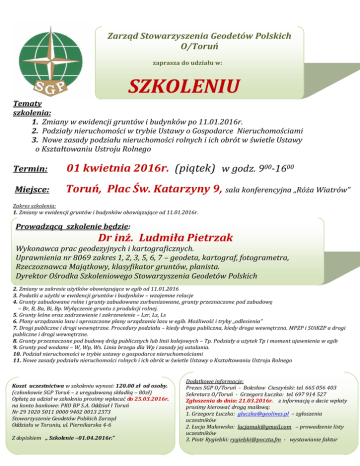 Zarząd Stowarzyszenia Geodetów Polskich O/Toruń zaprasza do udziału w: SZKOLENIU Tematy szkolenia: 1. Zmiany w ewidencji gruntów i budynków po 11.01.2016r. 2. Podziały nieruchomości w trybie Ustawy o Gospodarce Nieruchomościami 3. Nowe zasady podziału nieruchomości rolnych i ich obrót w świetle Ustawy o Kształtowaniu Ustroju Rolnego Termin: 01 kwietnia 2016r. (piątek) w godz. 900-1600 Miejsce: Toruń, Plac Św. Katarzyny 9, sala konferencyjna „Róża Wiatrów” Zakres szkolenia: 1. Zmiany w ewidencji gruntów i budynków obowiązujące od 11.01.2016r. Prowadzącą szkolenie będzie: Dr inż. Ludmiła Pietrzak Wykonawca prac geodezyjnych i kartograficznych. Uprawnienia nr 8069 zakres 1, 2, 3, 5, 6, 7 – geodeta, kartograf, fotogrametra, Rzeczoznawca Majątkowy, klasyfikator gruntów, planista. Dyrektor Ośrodka Szkoleniowego Stowarzyszenia Geodetów Polskich 2. Zmiany w zakresie użytków obowiązujące w egib od 11.01.2016 3. Podatki a użytki w ewidencji gruntów i budynków – wzajemne relacje 4. Grunty zabudowane rolne i grunty zabudowane zurbanizowane, grunty przeznaczone pod zabudowę – Br, B, Ba, Bi, Bp. Wyłączenie gruntu z produkcji rolnej. 5. Grunty leśne oraz zadrzewienie i zakrzewienie – Lzr, Lz, Ls 6. Plany urządzania lasu i uproszczone plany urządzania lasu w egib. Możliwość i tryby „odlesienia” 7. Drogi publiczne i drogi wewnętrzne. Procedury podziału – kiedy droga publiczna, kiedy droga wewnętrzna. MPZP i SUiKZP a drogi publiczne i drogi wewnętrzne. 8. Grunty przeznaczone pod budowę dróg publicznych lub linii kolejowych – Tp. Podziały a użytek Tp i moment ujawnienia w egib 9. Grunty pod wodami – W, Wp, Ws. Linia brzegu dla Wp i zasady jej ustalania. 10. Podział nieruchomości w trybie ustawy o gospodarce nieruchomościami 11. Nowe zasady podziału nieruchomości rolnych i ich obrót w świetle Ustawy o Kształtowaniu Ustroju Rolnego Koszt uczestnictwa w szkoleniu wynosi: 120.00 zł od osoby. (członkowie SGP Toruń – z uregulowaną składką – 80zł) Opłatę za udział w szkoleniu prosimy wpłacać do 25.03.2016r. na konto bankowe: PKO BP S.A. Oddział I Toruń Nr 29 1020 5011 0000 9402 0013 2373 Stowarzyszenie Geodetów Polskich Zarząd Oddziału w Toruniu, ul. Piernikarska 4-6 Z dopiskiem „ Szkolenie –01.04.2016r.” Dodatkowe informacje: Prezes SGP O/Toruń - Bolesław Cieszyński: tel. 665 056 403 Sekretarz O/Toruń - Grzegorz Łuczka: tel. 697 914 527 Zgłoszenia do dnia: 21.03.2016r. z informacją o dacie wpłaty prosimy kierować drogą mailową: 1. Grzegorz Łuczka: [email protected] – zgłoszenia uczestników 2. Łucja Makowska: [email protected] – prowadzenie listy uczestników 3. Piotr Rygielski: [email protected] - wystawianie faktur