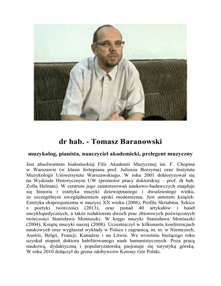 dr hab. - Tomasz Baranowski muzykolog, pianista, nauczyciel akademicki, prelegent muzyczny Jest absolwentem białostockiej Filii Akademii Muzycznej im. F. Chopina w Warszawie (w klasie fortepianu prof. Juliusza Borzyma) oraz Instytutu Muzykologii Uniwersytetu Warszawskiego. W roku 2001 doktoryzował się na Wydziale Historycznym UW (promotor pracy doktorskiej – prof. dr hab. Zofia Helman). W centrum jego zainteresowań naukowo-badawczych znajduje się historia i estetyka muzyki dziewiętnastego i dwudziestego wieku, ze szczególnym uwzględnieniem epoki modernizmu. Jest autorem książek: Estetyka ekspresjonizmu w muzyce XX wieku (2006), Profile Skriabina. Szkice z poetyki twórczości (2013), oraz ponad 40 artykułów i haseł encyklopedycznych, a także redaktorem dwóch prac zbiorowych poświęconych twórczości Stanisława Moniuszki: W kręgu muzyki Stanisława Moniuszki (2004), Książę muzyki naszej (2008). Uczestniczył w kilkunastu konferencjach naukowych oraz wygłaszał wykłady w Polsce i zagranicą, m. in. w Niemczech, Austrii, Belgii, Francji, Kanadzie i na Litwie. We wrześniu bieżącego roku uzyskał stopień doktora habilitowanego nauk humanistycznych. Poza pracą naukową, dydaktyczną i popularyzatorską pasjonuje się turystyką górską. W roku 2010 dołączył do grona zdobywców Korony Gór Polski.