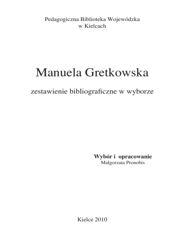 Pedagogiczna Biblioteka Wojewódzka w Kielcach Manuela Gretkowska zestawienie bibliograficzne w wyborze Wybór i opracowanie Małgorzata Pronobis Kielce 2010 2 1. Burska, Lidia : Hotel Europa / Lidia Burska // „Res Publica Nowa”. – 1996, nr 4, s. 34-39 [Pisarze młodego pokolenia : Janusz Rudnicki, Natasza Goerke, Manuela Gretkowska i Krzysztof Rutkowski] Czytelnia Pedagogicznej Biblioteki Wojewódzkiej 2. Czapliński, Przemysław : Sztuka prozatorska Manueli Gretkowskiej / Przemysław Czapliński // „Kresy”. – 1997, nr 2, s. 72-84 Czytelnia Pedagogicznej Biblioteki Wojewódzkiej 3. Gretkowska, Manuela : Literatura, czyli sposób myślenia / Manuela Gretkowska, rozm. Stanisław Bereś // „Odra”. – 2001, nr 12, s. 49-56 Czytelnia Pedagogicznej Biblioteki Wojewódzkiej 4. Gretkowska, Manuela : Myślenie o Polsce szokuje / Manuela Gretkowska, rozm. Dorota Nosowska // „Cogito”. – 1999, nr 1, s. 5-7 Czytelnia Pedagogicznej Biblioteki Wojewódzkiej 5. Gretkowska, Manuela : Nie ma słów. Z... / Manuela Gretkowska, rozm. Agnieszka Kosińska // „Dekada Literacka”. – 1995, nr 1, s. 3, 10 Czytelnia Pedagogicznej Biblioteki Wojewódzkiej 6. Kempny, Paweł : Arlekinada i egzystencja : wokół prozy Manueli Gretkowskiej / Paweł Kempny // „Czas Kultury”. – 1994, nr 5/6, s. 46-47 Czytelnia Pedagogicznej Biblioteki Wojewódzkiej 7. Kuźmina, Irina : Ukryta kamerą „Światowidza”...: odkrywanie Zachodu – odkrywanie siebie w twórczości Manueli Gretkowskiej oraz sióstr Tatiany i Natalii Tołstoj / Irina Kuźmina // „Slavia Occidentalis”. – 2002, t. 59, s. 133-143 Czytelnia Główna – Uniwersytet Humanistyczno-Przyrodniczy 8. Łukaszewicz, Michał : Fenomen pani Manueli / Michał Łukaszewicz // „Literatura”. – 1996, nr 7/8, s. 42-43 Czytelnia Pedagogicznej Biblioteki Wojewódzkiej 3 9. Markiewicz, Jarosław : Drabina do nieba / Jarosław Markiewicz // „Fa – Art.”. – 1997, nr 1, s. 86-89 Czytelnia Pedagogicznej Biblioteki Wojewódzkiej 10. Miszczak, Magdalena : Kicz i parodia w prozie Manueli Gretkowskiej / Magdalena Miszczak // „Acta Universitatis Lodziensis. Folia Litteraria Polonica”. – 2001, z. 2, s. 145-189 Czytelnia Główna – Uniwersytet Humanistyczno – Przyrodniczy 11. Miszczak, Magdalena : Manueli Gretkowskiej zabawy (z) kiczem / Magdalena Miszczak // „Teksty Drugie”. – 1998, nr 6, s. 135-153 Czytelnia Pedagogicznej Biblioteki Wojewódzkiej 12. Nacher, Anna : W labiryncie nowej wrażliwości : na marginesie „Podręcznika do ludzi” Manueli Gretkowskiej / Anna Nacher // „Ruch Literacki”. – 1998, z. 1, s. 101-111 Czytelnia Pedagogicznej Biblioteki Wojewódzkiej 13. Nowacki, Dariusz : „Upiększyć swoje położenie” : o tych co napisały o rodzeniu dzieci i nie zapomniały ich urodzić / Dariusz Nowacki // „Opcje”. – 2003, nr 6, s. 51-57 [Jolanta Brach-Czaina, Anna Nasiłowska, Manuela Gretkowska] Czytelnia Pedagogicznej Biblioteki Wojewódzkiej 14. Pułaczewska, Hanna : Postmodernizm i polskość w powieściach Manueli Gretkowskiej / Hanna Pułaczewska // „Teksty Drugie”. – 1998, nr 6, s. 155-169 Czytelnia Pedagogicznej Biblioteki Wojewódzkiej 15. Słaby, Jeannette : Stereotypy macierzyństwa w prozie Anny nasiłowskiej i Manueli Gretkowskiej / Jeannette Słaby // „Teksty Drugie”. – 2008, nr 1/2,s. 117-137 Czytelnia Pedagogicznej Biblioteki Wojewódzkiej 4 16. Veretjuk, Oksana : Wchodzimy, wracamy czy wyrzekamy się Zachodu? : (Milan Kundera, Manuela Gretkowska, Wołodymyr Dibrowa) / Oksana Veretjuk // „Akcent”. – 2003, nr 4, s. 69-78 Czytelnia Pedagogicznej Biblioteki Wojewódzkiej 17. Woźniakiewicz –Dziadosz, Maria : Literacki „gargamel” Manueli Gretkowskiej / Maria Woźniakiewicz – Dziadosz // „Język Polski w Szkole Średniej”. – 2000/2001, nr 1, s. 71-80 Czytelnia Pedagogicznej Biblioteki Wojewódzkiej ”Kabaret metafizyczny” 18. Kosińska, Agnieszka : Rytm, czyli powinność / Agnieszka Kosińska // „Dekada Literacka”. – 1994, nr 18/19, s. 13 Czytelnia Pedagogicznej Biblioteki Wojewódzkiej 19. Legeżyńska, Anna : Albi kicz, albo śmierć / Anna Legeżyńska // „Polonistyka”. – 1995, nr 8, s. 565-567 Czytelnia Pedagogicznej Biblioteki Wojewódzkiej 20. Lengren, Magda : Proza w błazeńskiej czapce / Magda Lengren // „Twórczość”. – 1995, nr 1, s. 112-114 Czytelnia Pedagogicznej Biblioteki Wojewódzkiej 21. Szkołut, Tadeusz : Metafizyka i pornografia / Tadeusz Szkołut // „Akcent”. – 1995, nr 2, s. 153-156 Czytelnia Pedagogicznej Biblioteki Wojewódzkiej 22. Terradas, Pau Freixa : Kilka uwag na temat prowokacji erotycznej męskiego podmiotu i polskiej tradycji na przykładzie powieści „Kabaret metafizyczny” Manueli Gretkowskiej / Pau Freixa, Terradas // „Teksty Drugie”. – 2008, nr 5, s. 146-152 Czytelnia Pedagogicznej Biblioteki Wojewódzkiej 5 ”My zdjes emigranty” 23. Kuziak, Dariusz : Gnoza i anegdota / Dariusz Kuziak // „Literatura”. – 1992, nr 7, s. 56 Czytelnia Pedagogicznej Biblioteki Wojewódzkiej 24. Nelicki, Aleksander : To jest młoda pisarka / Aleksander Nelicki // „Dekada Literacka”. – 1991, nr 28, s. 9 Czytelnia Pedagogicznej Biblioteki Wojewódzkiej ”Obywatelka” 25. Darska, Bernadetta : Zapiski z czasów walki i nadziei / Bernadetta Darska // „Twórczość”. – 2008, nr 9, s. 112-113 Czytelnia Pedagogicznej Biblioteki Wojewódzkiej ”Tarot paryski” 26. Ciupek, Marcin : W tym szaleństwie jest metoda ? / Marcin Ciupek // „Dekada Literacka”. – 1994, nr 1, s. 9 Czytelnia Pedagogicznej Biblioteki Wojewódzkiej 27. Jarosińska, Izabela : Gdzie jest ten „emigracyjny” skowyt” ? / Izabela Jarosińska // „Nowe Książki”. – 1993, nr 12, s. 49-50 Czytelnia Pedagogicznej Biblioteki Wojewódzkiej 28. Lengren, Magda : Papieros Diogenesa / Magda Lengren // „twórczość”. – 1993, nr 12, s. 117-118 Czytelnia Pedagogicznej Biblioteki Wojewódzkiej 29. Nowacki, Dariusz : 