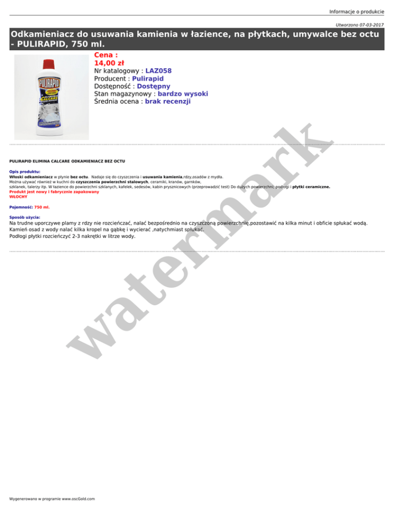 Informacje o produkcie Utworzono 07-03-2017 Odkamieniacz do usuwania kamienia w łazience, na płytkach, umywalce bez octu - PULIRAPID, 750 ml. Cena : 14,00 zł er m ar k Nr katalogowy : LAZ058 Producent : Pulirapid Dostępność : Dostępny Stan magazynowy : bardzo wysoki Średnia ocena : brak recenzji PULIRAPID ELIMINA CALCARE ODKAMIENIACZ BEZ OCTU Opis produktu: Włoski odkamieniacz w płynie bez octu. Nadaje się do czyszczenia i usuwania kamienia,rdzy,osadów z mydła. Można używać również w kuchni do czyszczenia powierzchni stalowych, ceramiki, kranów, garnków, szklanek, talerzy itp. W łazience do powierzchni szklanych, kafelek, sedesów, kabin prysznicowych (przeprowadzić test) Do dużych powierzchni; podłogi i płytki ceramiczne. Produkt jest nowy i fabrycznie zapakowany WŁOCHY Pojemność: 750 ml. Sposób użycia: w at Na trudne uporczywe plamy z rdzy nie rozcieńczać, nalać bezpośrednio na czyszczoną powierzchnię,pozostawić na kilka minut i obficie spłukać wodą. Kamień osad z wody nalać kilka kropel na gąbkę i wycierać ,natychmiast spłukać. Podłogi płytki rozcieńczyć 2-3 nakrętki w litrze wody. Wygenerowano w programie www.oscGold.com