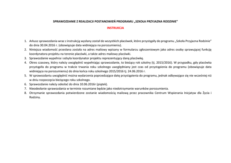 SPRAWOZDANIE Z REALIZACJI POSTANOWIEŃ PROGRAMU „SZKOŁA PRZYJAZNA RODZINIE” INSTRUKCJA 1. Arkusz sprawozdania wraz z instrukcją wysłany został do wszystkich placówek, które przystąpiły do programu „Szkoła Przyjazna Rodzinie” do dnia 30.04.2016 r. (obowiązuje data widniejąca na porozumieniu). 2. Niniejsza wiadomość przesłana została na adres mailowy wpisany w formularzu zgłoszeniowym jako adres osoby sprawującej funkcję koordynatora projektu na terenie placówki, a także adres mailowy placówki. 3. Sprawozdanie wypełnia i odsyła koordynator projektu reprezentujący daną placówkę. 4. Okres czasowy, który należy uwzględnić wypełniając sprawozdanie, to bieżący rok szkolny (tj. 2015/2016). W przypadku, gdy placówka przystąpiła do programu w trakcie trwania roku szkolnego uwzględniany jest czas od przystąpienia do programu (obowiązuje data widniejąca na porozumieniu) do dnia końca roku szkolnego 2015/2016 tj. 24.06.2016 r. 5. W sprawozdaniu uwzględnić można wydarzenia poprzedzające datę przystąpienia do programu, jednak odbywające się nie wcześniej niż w dniu rozpoczęcia bieżącego roku szkolnego. 6. Sprawozdanie należy odesłać do dnia 10.06.2016r (piątek). 7. Nieodesłanie sprawozdania w terminie rozumiane będzie jako niedotrzymanie warunków porozumienia. 8. Otrzymanie sprawozdania potwierdzone zostanie wiadomością mailową przez pracownika Centrum Wspierania Inicjatyw dla Życia i Rodziny. Wzór wypełnionego sprawozdania: NAZWA WYDARZENIA Cykl spotkań edukacyjnych z rodzicami „Dzień Rodziny” DATA WYDARZENIA 07.11.1424.04.16 KRÓTKIS OPIS WYDARZENIA Na terenie placówki organizowano comiesięczne spotkania wychowawców klas z rodzicami uczniów klas IV-VI. W czasie pięciu spotkań rodzice mieli możliwość zapoznać się z następującą tematyką: - „Rola autorytetu w wychowaniu” - „Edukacja seksualna” - „Jak radzić sobie z agresją wśród dzieci” - „Media – szansa czy zagrożenie w wychowaniu” - „Jak rozwijać w dziecku zainteresowania i pasje” W spotkaniach uczestniczyli chętni rodzice. Treść spotkań opracowana została przez czteroosobowy zespół składający się z nauczycieli i pedagoga – pracowników placówki. 26.05.2016r. Wydarzenie to od wielu lat organizowane jest na terenie placówki przy współpracy rodziców, nauczycieli oraz uczniów. W tym roku odbyło się ono w formie pikniku połączonego z występami uczniów oraz loterią fantową. Uczniowie i rodzice mieli ponadto możliwość wspólnie brać udział w konkursach sportowych, plastycznych oraz kulinarnych zorganizowanych przez pracowników szkoły. PRODZINNY ASPEKT WYDARZENIA Rodzice mają okazję pogłębić relację z wychowawcą klasy, w której uczy się ich dziecko. Ponadto ma możliwość zdobycia wiedzy z zakresu aktualnych problemów wychowawczych, zadania nurtujących pytań w konsekwencji czego może lepiej odpowiedzieć na potrzeby własnego dziecka. Wydarzenie to ma na celu podkreślenie wartości rodziny oraz jej znaczenia w życiu każdego dziecka. Jest to ponadto sposobność do wspólnego spędzanie czasu rodziców z dziećmi, ich współdziałania i współpracy. Takie świętowanie wpływa również na lepsze relacje rodziców z pracownikami szkoły.