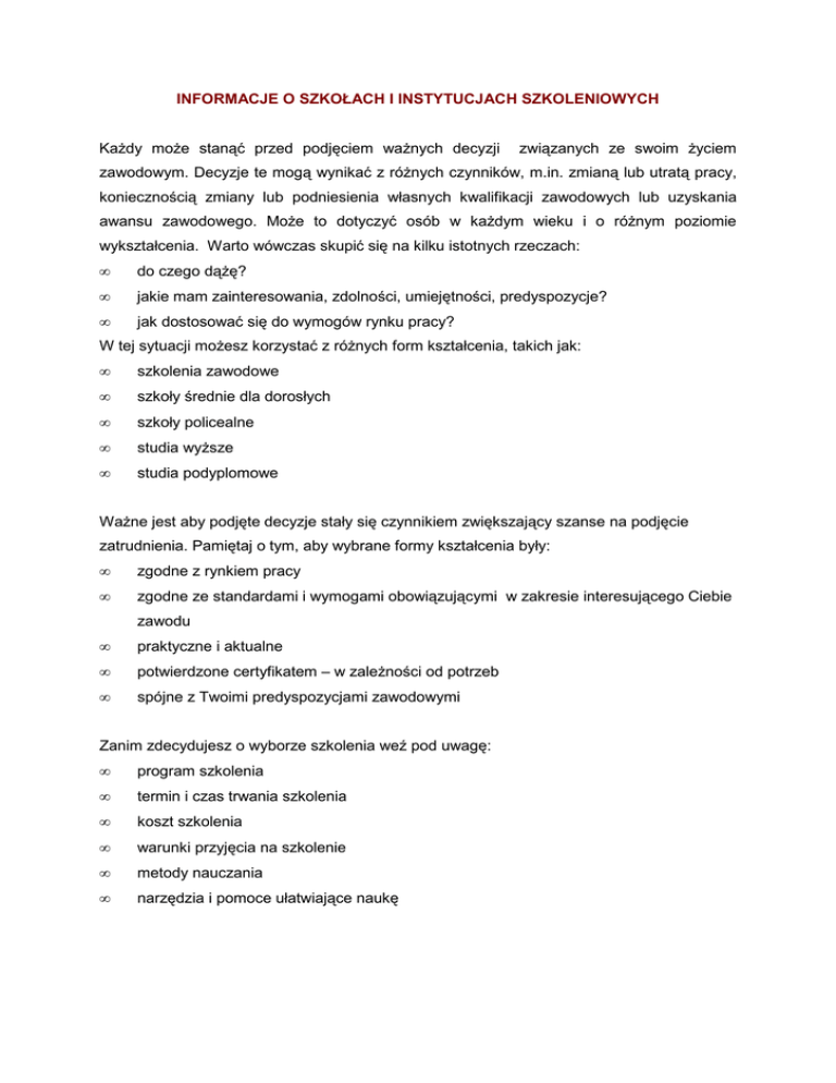 INFORMACJE O SZKOŁACH I INSTYTUCJACH SZKOLENIOWYCH Każdy może stanąć przed podjęciem ważnych decyzji związanych ze swoim życiem zawodowym. Decyzje te mogą wynikać z różnych czynników, m.in. zmianą lub utratą pracy, koniecznością zmiany lub podniesienia własnych kwalifikacji zawodowych lub uzyskania awansu zawodowego. Może to dotyczyć osób w każdym wieku i o różnym poziomie wykształcenia. Warto wówczas skupić się na kilku istotnych rzeczach: • do czego dążę? • jakie mam zainteresowania, zdolności, umiejętności, predyspozycje? • jak dostosować się do wymogów rynku pracy? W tej sytuacji możesz korzystać z różnych form kształcenia, takich jak: • szkolenia zawodowe • szkoły średnie dla dorosłych • szkoły policealne • studia wyższe • studia podyplomowe Ważne jest aby podjęte decyzje stały się czynnikiem zwiększający szanse na podjęcie zatrudnienia. Pamiętaj o tym, aby wybrane formy kształcenia były: • zgodne z rynkiem pracy • zgodne ze standardami i wymogami obowiązującymi w zakresie interesującego Ciebie zawodu • praktyczne i aktualne • potwierdzone certyfikatem – w zależności od potrzeb • spójne z Twoimi predyspozycjami zawodowymi Zanim zdecydujesz o wyborze szkolenia weź pod uwagę: • program szkolenia • termin i czas trwania szkolenia • koszt szkolenia • warunki przyjęcia na szkolenie • metody nauczania • narzędzia i pomoce ułatwiające naukę UDOSTĘPNIAMY DO SAMODZIELNEGO KORZYSTANIA W PUP: • wykaz szkół powiatu kartuskiego • wykaz instytucji szkoleniowych PRZYDATNE STRONY: SZKOŁY: http://www.szkoly.info.pl http://www.szkolnictwo.pl http://uczelne.pl http://edusiec.pl http://www.kuratorium.gda.pl http://www.cku.sopot.pl INSTYTUCJE SZKOLENIOWE: http://www.ris.praca.gov.pl http://psz.praca.pl