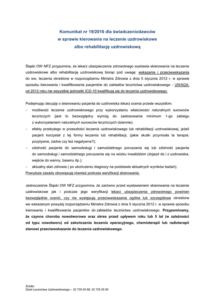 Komunikat nr 19/2016 dla świadczeniodawców w sprawie kierowania na leczenie uzdrowiskowe albo rehabilitację uzdrowiskową Śląski OW NFZ przypomina, że lekarz ubezpieczenia zdrowotnego wystawia skierowania na leczenie uzdrowiskowe albo rehabilitację uzdrowiskową biorąc pod uwagę: wskazania i przeciwwskazania do ww. leczenia określone w rozporządzeniu Ministra Zdrowia z dnia 5 stycznia 2012 r. w sprawie sposobu kierowania i kwalifikowania pacjentów do zakładów lecznictwa uzdrowiskowego - UWAGA: od 2012 roku nie wszystkie jednostki ICD-10 kwalifikują się do leczenia uzdrowiskowego. Podejmując decyzję o skierowaniu pacjenta do uzdrowiska lekarz ocenia przede wszystkim: możliwość leczenia uzdrowiskowego przy wykorzystaniu właściwości naturalnych surowców leczniczych (jest to bezwzględny wymóg do zastosowania minimum 1-go zabiegu z wykorzystaniem naturalnych surowców leczniczych dziennie); efekty przebytego w przeszłości leczenia uzdrowiskowego lub rehabilitacji uzdrowiskowej, jeżeli pacjent korzystał z tej formy leczenia lub rehabilitacji, (jakie skutki przyniosła ta terapia: pozytywne, żadne czy też negatywne?); zdolność pacjenta do samoobsługi i samodzielnego poruszania się lub zdolność pacjenta do samoobsługi i samodzielnego poruszania się na wózku inwalidzkim (dojazd do i z uzdrowiska, wejście do wanny, basenu itp.); aktualny stan zdrowia ( po ukończeniu diagnozy na podstawie aktualnych wyników badań); Powyższe zasady obowiązują również podczas weryfikacji skierowania. Jednocześnie Śląski OW NFZ przypomina, że zarówno przed wystawieniem skierowania na leczenie uzdrowiskowe jak i podczas jego weryfikacji lekarz ubezpieczenia zdrowotnego powinien bezwzględnie ocenić, czy nie występują przeciwwskazania ogólne lub szczegółowe określone we wskazanym powyżej rozporządzeniu Ministra Zdrowia z dnia 5 stycznia 2012 r. w sprawie sposobu kierowania i kwalifikowania pacjentów do zakładów lecznictwa uzdrowiskowego. Przypominamy, że czynna choroba nowotworowa oraz okres przed upływem roku lub 5 lat (w zależności od typu nowotworu) od zakończenia leczenia operacyjnego, chemioterapii lub radioterapii stanowi przeciwwskazanie do leczenia uzdrowiskowego. Źródło: Dział Lecznictwa Uzdrowiskowego – 32 735 05 66; 32 735 05 65