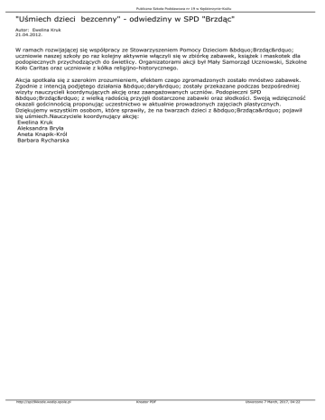 Publiczna Szkoła Podstawowa nr 19 w Kędzierzynie-Koźlu "Uśmiech dzieci bezcenny" - odwiedziny w SPD "Brzdąc" Autor: Ewelina Kruk 21.04.2012. W ramach rozwijającej się współpracy ze Stowarzyszeniem Pomocy Dzieciom „Brzdąc” uczniowie naszej szkoły po raz kolejny aktywnie włączyli się w zbiórkę zabawek, książek i maskotek dla podopiecznych przychodzących do świetlicy. Organizatorami akcji był Mały Samorząd Uczniowski, Szkolne Koło Caritas oraz uczniowie z kółka religijno-historycznego. Akcja spotkała się z szerokim zrozumieniem, efektem czego zgromadzonych zostało mnóstwo zabawek. Zgodnie z intencją podjętego działania „dary” zostały przekazane podczas bezpośredniej wizyty nauczycieli koordynujących akcję oraz zaangażowanych uczniów. Podopieczni SPD „Brzdąc” z wielką radością przyjęli dostarczone zabawki oraz słodkości. Swoją wdzięczność okazali gościnnością proponując uczestnictwo w aktualnie prowadzonych zajęciach plastycznych. Dziękujemy wszystkim osobom, które sprawiły, że na twarzach dzieci z „Brzdąca” pojawił się uśmiech.Nauczyciele koordynujący akcję: Ewelina Kruk Aleksandra Bryła Aneta Knapik-Król Barbara Rycharska http://sp19kkozle.wodip.opole.pl Kreator PDF Utworzono 7 March, 2017, 04:22