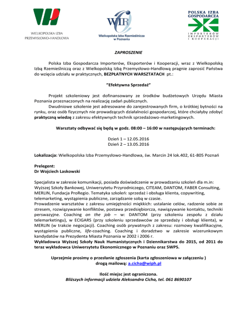 ZAPROSZENIE Polska Izba Gospodarcza Importerów, Eksporterów i Kooperacji, wraz z Wielkopolską Izbą Rzemieślniczą oraz z Wielkopolską Izbą Przemysłowo-Handlową pragnie zaprosić Państwa do wzięcia udziału w praktycznych, BEZPŁATNYCH WARSZTATACH pt.: ”Efektywna Sprzedaż” Projekt szkoleniowy jest dofinansowany ze środków budżetowych Urzędu Miasta Poznania przeznaczonych na realizację zadań publicznych. Dwudniowe szkolenie jest adresowane do zarejestrowanych firm, o krótkiej bytności na rynku, oraz osób fizycznych nie prowadzących działalności gospodarczej, które chciałyby zdobyć praktyczną wiedzę z zakresu efektywnych technik sprzedażowo-marketingowych. Warsztaty odbywać się będą w godz. 08:00 – 16:00 w następujących terminach: Dzień 1 – 12.05.2016 Dzień 2 – 13.05.2016 Lokalizacja: Wielkopolska Izba Przemysłowo-Handlowa, św. Marcin 24 lok.402, 61-805 Poznań Prelegent: Dr Wojciech Laskowski Specjalista w zakresie komunikacji, posiada doświadczenie w prowadzaniu szkoleń dla m.in: Wyższej Szkoły Bankowej, Uniwersytetu Przyrodniczego, CITEAM, DANTOM, FABER Consulting, MERLIN, Fundacja ProRegio. Tematyka szkoleń: sprzedaż i obsługa klienta, copywriting, telemarketing, wystąpienia publiczne, zarządzanie sobą w czasie. Prowadzenie warsztatów z zakresu umiejętności miękkich: ustalanie celów, radzenie sobie ze stresem, rozwiązywanie konfliktów, postawa przedsiębiorcza, nawiązywanie kontaktu, techniki perswazyjne. Coaching on the job – w: DANTOM (przy szkoleniu zespołu z działu telemarketingu), w ECIGARS (przy szkoleniu sprzedawców ze sprzedaży i obsługi klienta), w MERLIN (w trakcie negocjacji). Coaching osób prywatnych z zakresu: rozmowy kwalifikacyjne, wystąpienia publiczne, life-coaching. Coaching i doradztwo w zakresie wizerunkowym kandydatów na Prezydenta Miasta Poznania w 2002 i 2006 r. Wykładowca Wyższej Szkoły Nauk Humanistycznych i Dziennikarstwa do 2015, od 2011 do teraz wykładowca Uniwersytetu Ekonomicznego w Poznaniu oraz SWPS. Uprzejmie prosimy o przesłanie zgłoszenia (karta zgłoszeniowa w załączeniu ) drogą mailową: [email protected] Ilość miejsc jest ograniczona. Bliższych informacji udziela Aleksandra Cicha, tel. 061 8690107 PROGRAM WARSZTATÓW Dzień 1 1. Cechy orientacji produkcyjnej, sprzedażowej i marketingowej firm. Elementy marketingu mix w przedsiębiorstwie handlowym. 2. Sprzedaż osobista jako element promocji sklepu 3. Instrumenty promocji mix w małej firmie handlowej: a. etapy sprzedaży osobistej -określenie docelowej grupy nabywców’ -przygotowanie wstępne spotkania z klientami, -spotkanie z klientami *nawiązanie kontaktu, dotarcie z informacją *pierwsze wrażenie, *pozyskanie uwagi *prezentacja oferty sklepu *pokonywanie oporów, -zamknięcie sprzedaży; -czynności posprzedażowe; b. ćwiczenia praktyczne 4. Zasady telemarketingu – sprzedaż przez telefon Dzień 2 1. Psychologia sprzedaży: a. sprzedawanie korzyści, b. typologia nabywców, c. komunikacja werbalna i niewerbalna w procesie sprzedaży, d. test umiejętności sprzedaży, e. cechy dobrego handlowca, f. ćwiczenia praktyczne 2. Pozyskiwanie i utrzymywanie relacji z klientami: a. promocje, b. programy lojalnościowe 3. Aktywne techniki wywierania wpływu