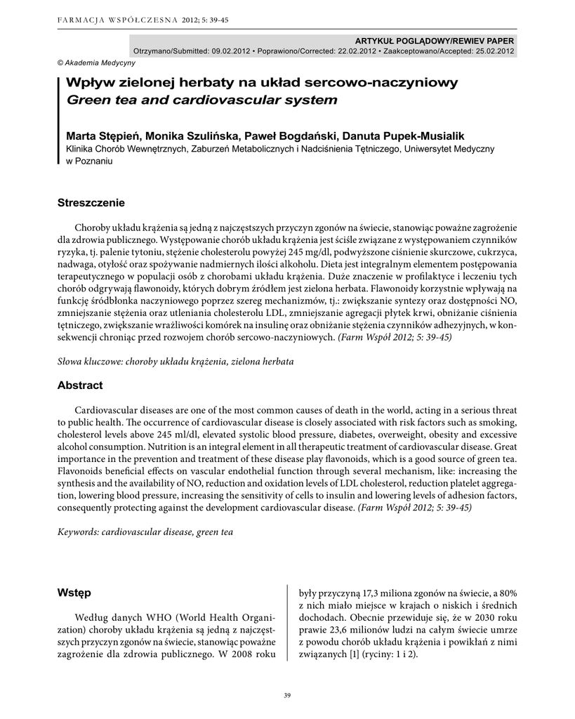 39 FA R M A C J A W S P Ó Ł C Z E S N A 2012; 5: 39-45 ARTYKUŁ POGLĄDOWY/REWIEV PAPER Otrzymano/Submitted: 09.02.2012 • Poprawiono/Corrected: 22.02.2012 • Zaakceptowano/Accepted: 25.02.2012 © Akademia Medycyny Wpływ zielonej herbaty na układ sercowo-naczyniowy Green tea and cardiovascular system Marta Stępień, Monika Szulińska, Paweł Bogdański, Danuta Pupek-Musialik Klinika Chorób Wewnętrznych, Zaburzeń Metabolicznych i Nadciśnienia Tętniczego, Uniwersytet Medyczny w Poznaniu Streszczenie Choroby układu krążenia są jedną z najczęstszych przyczyn zgonów na świecie, stanowiąc poważne zagrożenie dla zdrowia publicznego. Występowanie chorób układu krążenia jest ściśle związane z występowaniem czynników ryzyka, tj. palenie tytoniu, stężenie cholesterolu powyżej 245 mg/dl, podwyższone ciśnienie skurczowe, cukrzyca, nadwaga, otyłość oraz spożywanie nadmiernych ilości alkoholu. Dieta jest integralnym elementem postępowania terapeutycznego w populacji osób z chorobami układu krążenia. Duże znaczenie w profilaktyce i leczeniu tych chorób odgrywają flawonoidy, których dobrym źródłem jest zielona herbata. Flawonoidy korzystnie wpływają na funkcję śródbłonka naczyniowego poprzez szereg mechanizmów, tj.: zwiększanie syntezy oraz dostępności NO, zmniejszanie stężenia oraz utleniania cholesterolu LDL, zmniejszanie agregacji płytek krwi, obniżanie ciśnienia tętniczego, zwiększanie wrażliwości komórek na insulinę oraz obniżanie stężenia czynników adhezyjnych, w konsekwencji chroniąc przed rozwojem chorób sercowo-naczyniowych. (Farm Współ 2012; 5: 39-45) Słowa kluczowe: choroby układu krążenia, zielona herbata Abstract Cardiovascular diseases are one of the most common causes of death in the world, acting in a serious threat to public health. The occurrence of cardiovascular disease is closely associated with risk factors such as smoking, cholesterol levels above 245 ml/dl, elevated systolic blood pressure, diabetes, overweight, obesity and excessive alcohol consumption. Nutrition is an integral element in all therapeutic treatment of cardiovascular disease. Great importance in the prevention and treatment of these disease play flavonoids, which is a good source of green tea. Flavonoids beneficial effects on vascular endothelial function through several mechanism, like: increasing the synthesis and the availability of NO, reduction and oxidation levels of LDL cholesterol, reduction platelet aggregation, lowering blood pressure, increasing the sensitivity of cells to insulin and lowering levels of adhesion factors, consequently protecting against the development cardiovascular disease. (Farm Współ 2012; 5: 39-45) Keywords: cardiovascular disease, green tea Wstęp były przyczyną 17,3 miliona zgonów na świecie, a 80% z nich miało miejsce w krajach o niskich i średnich dochodach. Obecnie przewiduje się, że w 2030 roku prawie 23,6 milionów ludzi na całym świecie umrze z powodu chorób układu krążenia i powikłań z nimi związanych [1] (ryciny: 1 i 2). Według danych WHO (World Health Organization) choroby układu krążenia są jedną z najczęstszych przyczyn zgonów na świecie, stanowiąc poważne zagrożenie dla zdrowia publicznego. W 2008 roku 39 FA R M A C J A W S P Ó Ł C Z E S N A 2012; 5: 39-45 W celu jak najlepszej oceny jakie dana choroba stwarza zagrożenie dla zdrowia społeczeństwa, oblicza się wskaźnik DALY (disability-adjusted life years). Jest to suma lat utraconych z powodu przedwczesnego zgonu oraz lat życia z niepełnosprawnością, z poprawką na stopień niepełnosprawności. Udział chorób sercowo-naczyniowych dla Europy w DALY wynosi 17-29% całkowitej liczby utraconych lat, dla Polski wskaźnik ten wynosi 22%, stanowiąc poważny problem społeczny i ekonomiczny, generujący wysokie koszty leczenia [4] (rycina 3). Rycina 1. Poziom umieralności kobiet z powodu chorób układu krążenia na 100 000 osób według danych WHO z 2008 r. [2] Figure 1. The mortality rate of women with cardiovascular disease per 100 000 people according the WHO in 2008 [2] Rycina 3. Wskaźnik DALY według danych WHO z 2004 r. [2] Figure 3. DALY indicato according WHO in 2004 [2] Występowanie chorób układu krążenia jest ściśle związane z występowaniem czynników ryzyka, czyli każdej cechy jakościowej bądź parametru ilościowego, którego występowanie w populacji ludzi zdrowych będzie wiązało się ze statystycznie istotnym zwiększeniem ryzyka zachorowania lub zgonu z powodu danej choroby. Czynniki ryzyka chorób układu krążenia można podzielić na modyfikowalne oraz niemodyfikowalne. Do głównych czynników ryzyka chorób sercowo-naczyniowych należą: palenie tytoniu, stężenie cholesterolu LDL, podwyższone ciśnienie skurczowe, cukrzyca, nadwaga, otyłość oraz spożywanie nadmiernych ilości alkoholu [4]. Oceny całkowitego ryzyka chorób sercowo-naczyniowych dokonuje się za pomocą tabel SCORE (Systematic Coronary Risk Evelauation); u wielu osób występuje kilka umiarkowanie nasilonych czynników ryzyka, których suma daje nieoczekiwanie wysoki poziom całkowitego ryzyka chorób sercowo-naczyniowych [5]. Rycina 2. Poziom umieralności mężczyzn z powodu chorób układu sercowo-naczyniowego na 100 000 osób według danych WHO z 2008 r. [2] Figure 2. The mortality rate of male with cardiovascular disease per 100 000 people according the WHO in 2008 [2] W Polsce problem ten jest również szeroko rozpowszechniony. Według danych GUS (Główny Urząd Statystyczny) w 2010 roku umieralność z powodu chorób układu krążenia, mimo istotnej poprawy, nadal stanowiła przyczynę 46% wszystkich zgonów (w 2000 roku - 48%). Umieralność z powodu chorób układu krążenia występuje częściej u kobiet, których udział w ogólnej liczbie zgonów wynosi 52%, a wśród mężczyzn 41% [3]. Choroby sercowo-naczyniowe są również najczęstszą przyczyną hospitalizacji w P