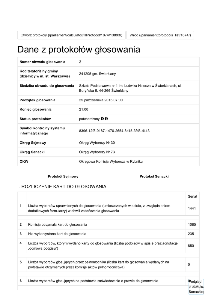 Otwórz protokoły (/parliament/calculator/fillProtocol/1874/13893/) Wróć (/parliament/protocols_list/1874/) Dane z protokołów głosowania Numer obwodu głosowania 2 Kod terytorialny gminy (dzielnicy w m. st. Warszawie) 241205 gm. Świerklany Siedziba obwodu do głosowania Szkoła Podstawowa nr 1 im. Ludwika Holesza w Świerklanach, ul. Boryńska 6, 44-266 Świerklany Początek głosowania 25 października 2015 07:00 Koniec głosowania 21:00 Status protokołów potwierdzony Symbol kontrolny systemu informatycznego 8396-12f8-0187-1470-2654-8d15-3fd8-d443 Okręg Sejmowy Okręg Wyborczy Nr 30 Okręg Senacki Okręg Wyborczy Nr 73 OKW Okręgowa Komisja Wyborcza w Rybniku Protokół Sejmowy Protokół Senacki I. ROZLICZENIE KART DO GŁOSOWANIA Senat 1 Liczba wyborców uprawnionych do głosowania (umieszczonych w spisie, z uwzględnieniem dodatkowych formularzy) w chwili zakończenia głosowania 1441 2 Komisja otrzymała kart do głosowania 1085 3 Nie wykorzystano kart do głosowania 235 4 Liczba wyborców, którym wydano karty do głosowania (liczba podpisów w spisie oraz adnotacje „odmowa podpisu”) 850 5 Liczba wyborców głosujących przez pełnomocnika (liczba kart do głosowania wydanych na podstawie otrzymanych przez komisję aktów pełnomocnictwa) 0 6 Liczba wyborców głosujących na podstawie zaświadczenia o prawie do głosowania 0Podgląd protokołu: Senackiego 7 Liczba wyborców, którym wysłano pakiety wyborcze 0 8 Liczba otrzymanych kopert zwrotnych 0 8a Liczba kopert zwrotnych, w których nie było oświadczenia o osobistym i tajnym oddaniu głosu 0 8b Liczba kopert zwrotnych, w których oświadczenie nie było podpisane przez wyborcę 0 8c Liczba kopert zwrotnych, w których nie było koperty na kartę do głosowania 0 8d Liczba kopert zwrotnych, w których znajdowała się niezaklejona koperta na kartę do głosowania 0 8e Liczba kopert na kartę do głosowania wrzuconych do urny 0 II. USTALENIE WYNIKÓW GŁOSOWANIA Senat 9 Liczba kart wyjętych z urny 850 9a w tym liczba kart wyjętych z kopert na kartę do głosowania 0 10 Liczba kart nieważnych (innych niż urzędowo ustalone lub nieopatrzonych pieczęcią obwodowej komisji wyborczej) 0 11 Liczba kart ważnych 850 12 Liczba głosów nieważnych (z kart ważnych) 18 12a w tym z powodu postawienia znaku „X” obok nazwiska dwóch lub większej liczby kandydatów 5 12b w tym z powodu niepostawienia znaku „X” obok nazwiska żadnego kandydata 13 12c w tym z powodu postawienia znaku „X” wyłącznie obok skreślonego nazwiska kandydata 0 13 Liczba głosów ważnych oddanych łącznie na wszystkich kandydatów (z kart ważnych) 832 14. Na poszczególnych kandydatów na senatorów oddano następujące liczby głosów ważnych: Numer na liście Imiona i nazwisko Liczba głosów 1 GĄSIORCZYK Alojzy Stanisław 65 2 HELIS Paweł 103 3 KURPANIK Franciszek Jan 145 4 PIECHA Wojciech Piotr 519 Razem 832 III. UWAGI I ADNOTACJE Podgląd protokołu: Senackiego 15. Uwagi o przypuszczalnej przyczynie różnicy pomiędzy sumą liczb z pkt 3 i 4 a liczbą z pkt 2; jeżeli różnica nie występuje, wpisać „brak uwag”: brak uwag 16. Uwagi o przypuszczalnej przyczynie różnicy pomiędzy liczbą z pkt 9 pomniejszoną o liczbę z pkt 9a a liczbą z pkt 4, a także o przypuszczalnej przyczynie ewentualnej różnicy pomiędzy liczbą z pkt 9a a liczbą z pkt 8e; jeżeli różnice nie występują, wpisać „brak uwag”: brak uwag 17. Uwagi o przypuszczalnej przyczynie wystąpienia kart nieważnych (pkt 10); jeżeli liczba w pkt 10 wynosi 0, wpisać „brak uwag”: brak uwag 18. W trakcie głosowania wydano następujące zarządzenia; jeżeli nie wydano, wpisać „brak zarządzeń”: brak zarządzeń 19. Adnotacja o wniesieniu uwag przez mężów zaufania z wymienieniem konkretnych zarzutów **); jeżeli nie ma, wpisać odpowiednio „brak zarzutów” lub „brak mężów zaufania w obwodzie”: brak zarzutów 20. Adnotacja o wniesieniu uwag przez członków Komisji z wymienieniem konkretnych zarzutów **); jeżeli nie ma, wpisać „brak zarzutów”: brak zarzutów 21. Inne uwagi; jeżeli nie ma, wpisać „brak uwag”: brak uwag Przy sporządzeniu protokołów obecni byli członkowie Komisji: 1. Kamil Musiolik Przewodniczący 2. Krystyna Bilich Zastępca Przewodniczącego 3. Paulina Adamczyk Członek 4. Patrycja Filipiak Członek 5. Emilia Holesz Członek 6. Jerzy Labus Członek 7. Magdalena Marcinkowska Członek 8. Kazimierz Oleś Członek 9. Mirosław Szulik Członek Wróć (/parliament/protocols_list/1874/) Podgląd protokołu: Senackiego Wycofaj potwierdzenie (/parliament/protocols/unconfirm/13893/?next=/parliament/protocols_list/1874/) Podgląd protokołu: Senackiego