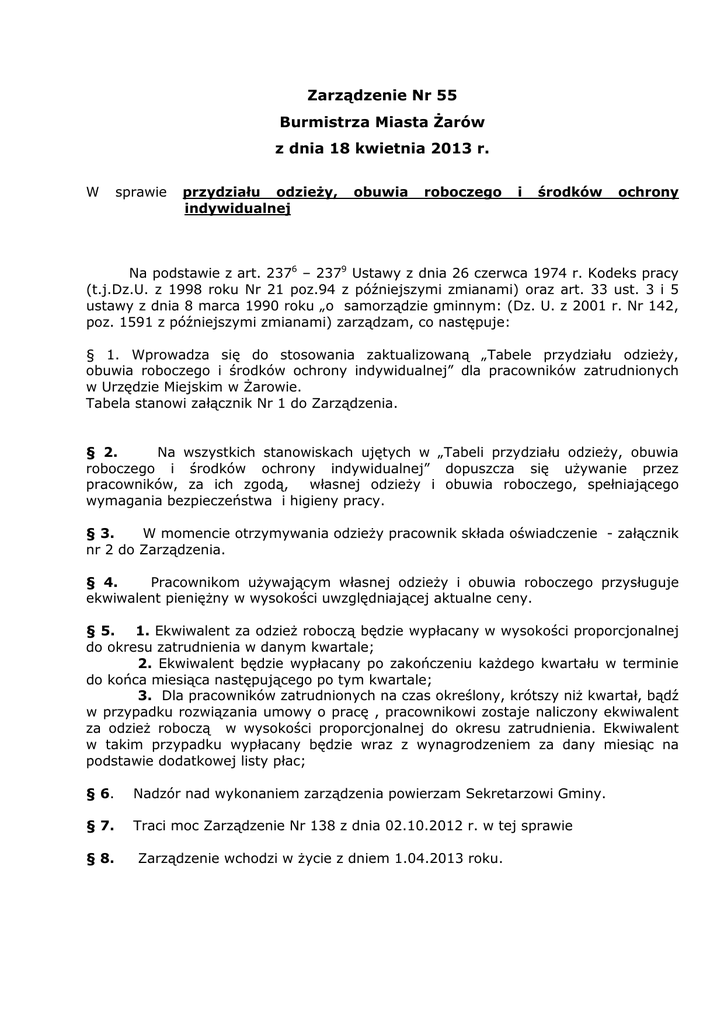 Zarządzenie Nr 55 Burmistrza Miasta Żarów z dnia 18 kwietnia 2013 r. W sprawie przydziału odzieży, indywidualnej obuwia roboczego i środków ochrony Na podstawie z art. 2376 – 2379 Ustawy z dnia 26 czerwca 1974 r. Kodeks pracy (t.j.Dz.U. z 1998 roku Nr 21 poz.94 z późniejszymi zmianami) oraz art. 33 ust. 3 i 5 ustawy z dnia 8 marca 1990 roku „o samorządzie gminnym: (Dz. U. z 2001 r. Nr 142, poz. 1591 z późniejszymi zmianami) zarządzam, co następuje: § 1. Wprowadza się do stosowania zaktualizowaną „Tabele przydziału odzieży, obuwia roboczego i środków ochrony indywidualnej” dla pracowników zatrudnionych w Urzędzie Miejskim w Żarowie. Tabela stanowi załącznik Nr 1 do Zarządzenia. § 2. Na wszystkich stanowiskach ujętych w „Tabeli przydziału odzieży, obuwia roboczego i środków ochrony indywidualnej” dopuszcza się używanie przez pracowników, za ich zgodą, własnej odzieży i obuwia roboczego, spełniającego wymagania bezpieczeństwa i higieny pracy. § 3. W momencie otrzymywania odzieży pracownik składa oświadczenie - załącznik nr 2 do Zarządzenia. § 4. Pracownikom używającym własnej odzieży i obuwia roboczego przysługuje ekwiwalent pieniężny w wysokości uwzględniającej aktualne ceny. § 5. 1. Ekwiwalent za odzież roboczą będzie wypłacany w wysokości proporcjonalnej do okresu zatrudnienia w danym kwartale; 2. Ekwiwalent będzie wypłacany po zakończeniu każdego kwartału w terminie do końca miesiąca następującego po tym kwartale; 3. Dla pracowników zatrudnionych na czas określony, krótszy niż kwartał, bądź w przypadku rozwiązania umowy o pracę , pracownikowi zostaje naliczony ekwiwalent za odzież roboczą w wysokości proporcjonalnej do okresu zatrudnienia. Ekwiwalent w takim przypadku wypłacany będzie wraz z wynagrodzeniem za dany miesiąc na podstawie dodatkowej listy płac; § 6. Nadzór nad wykonaniem zarządzenia powierzam Sekretarzowi Gminy. § 7. Traci moc Zarządzenie Nr 138 z dnia 02.10.2012 r. w tej sprawie § 8. Zarządzenie wchodzi w życie z dniem 1.04.2013 roku. Załącznik Nr 1 do zarządzenia Nr 55 TABELA norm przydziału środków ochrony indywidualnej oraz odzieży i obuwia roboczego dla pracowników urzędu Miejskiego w Żarowie 1 Stanowisko pracy Robotnik gospodarczy/meliorant Rodzaj wyposażenia Odzież i obuwie robocze 2 Sprzątaczka Ochrony indywidualne Odzież i obuwie robocze 2 konserwator Ochrony indywidualne Odzież i obuwie robocze lp 3 4 archiwista goniec Ochrony indywidualne Ochrony indywidualne Odzież i obuwie robocze asortyment Ubranie drelichowe Czapka Trzewiki ocieplacz Obuwie gumowe lub buty rybackie Rękawice robocze Kurtka p. deszczowa (dyżurna) Fartuch Trzewiki profilaktyczne Rękawice ochronne lateksowe Czapka Ubranie lub fartuch drelichowy Trzewiki skórzano/gumowe Rękawice robocze fartuch Rękawice gumowe Maseczka ochronna Rękawiczki gumowe Trzewiki Czapka Botki zimowe Kurtka ocieplana Okres używalności 18 miesięcy 24 miesiące 24 miesiące 3 okresy zimowe Do zużycia Do zużycia Do zużycia 24 m-cy 12 miesięcy Do zużycia 24 m-ce 12 m-cy 24 m-ce Do zużycia Do zużycia Do zużycia Do zużycia Do zużycia 24 m-ce 4 okresy zimowe 4 okresy zimowe 4 okresy zimowe Ubranie lub fartuch drelichowy 36 miesiący Kamizelka ocieplana 4 okresy zimowe Buty ocieplane 4 okresy zimowe Pracownik administracji wychodzący w teren 1) 5 2) 3) 4) 5) 6) stanowisko ds. remontów i inwestycji stanowisko ds. dróg stanowisko ds. przeglądów technicznych i remontów stanowisko ds. wspólnot Kierownik referatu Inwestycji i Dróg ST.ds.gospodarki komunalnej 7) Odzież i obuwie robocze Stanowisko ds.remontów i dróg