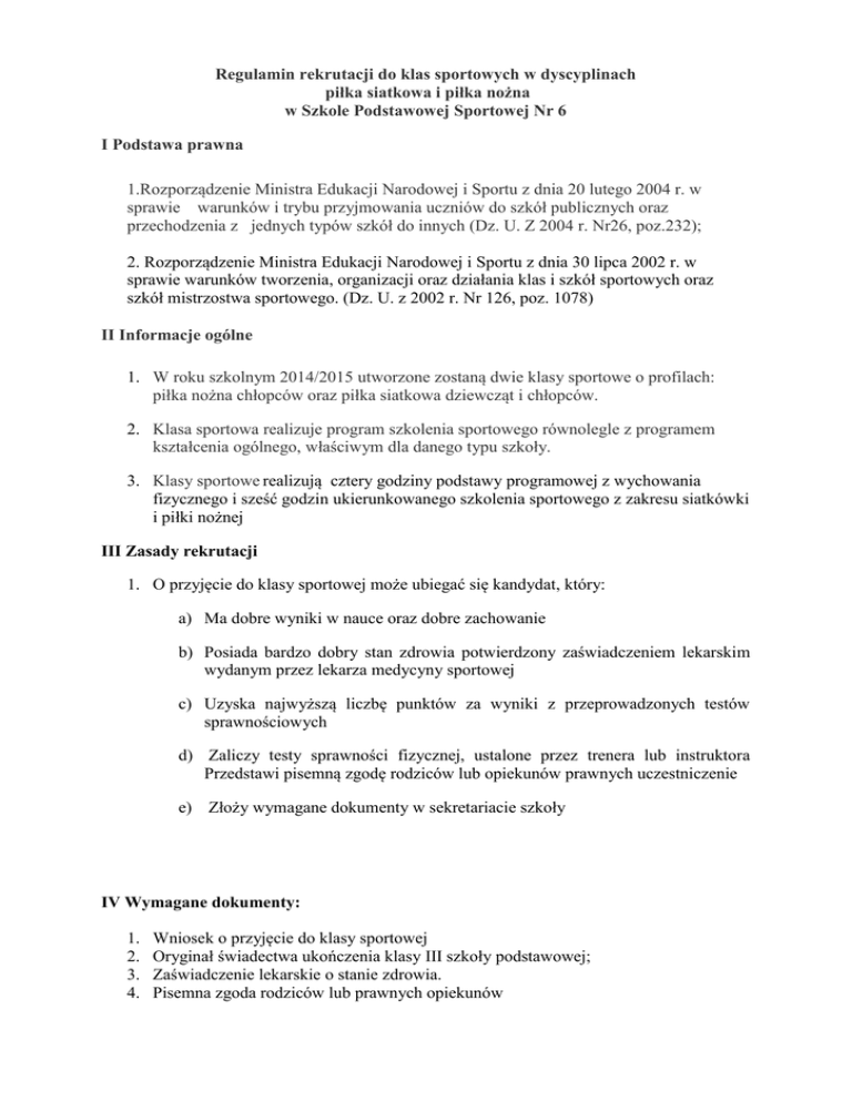 Regulamin rekrutacji do klas sportowych w dyscyplinach piłka siatkowa i piłka nożna w Szkole Podstawowej Sportowej Nr 6 I Podstawa prawna 1.Rozporządzenie Ministra Edukacji Narodowej i Sportu z dnia 20 lutego 2004 r. w sprawie warunków i trybu przyjmowania uczniów do szkół publicznych oraz przechodzenia z jednych typów szkół do innych (Dz. U. Z 2004 r. Nr26, poz.232); 2. Rozporządzenie Ministra Edukacji Narodowej i Sportu z dnia 30 lipca 2002 r. w sprawie warunków tworzenia, organizacji oraz działania klas i szkół sportowych oraz szkół mistrzostwa sportowego. (Dz. U. z 2002 r. Nr 126, poz. 1078) II Informacje ogólne 1. W roku szkolnym 2014/2015 utworzone zostaną dwie klasy sportowe o profilach: piłka nożna chłopców oraz piłka siatkowa dziewcząt i chłopców. 2. Klasa sportowa realizuje program szkolenia sportowego równolegle z programem kształcenia ogólnego, właściwym dla danego typu szkoły. 3. Klasy sportowe realizują cztery godziny podstawy programowej z wychowania fizycznego i sześć godzin ukierunkowanego szkolenia sportowego z zakresu siatkówki i piłki nożnej III Zasady rekrutacji 1. O przyjęcie do klasy sportowej może ubiegać się kandydat, który: a) Ma dobre wyniki w nauce oraz dobre zachowanie b) Posiada bardzo dobry stan zdrowia potwierdzony zaświadczeniem lekarskim wydanym przez lekarza medycyny sportowej c) Uzyska najwyższą liczbę punktów za wyniki z przeprowadzonych testów sprawnościowych d) Zaliczy testy sprawności fizycznej, ustalone przez trenera lub instruktora Przedstawi pisemną zgodę rodziców lub opiekunów prawnych uczestniczenie e) Złoży wymagane dokumenty w sekretariacie szkoły IV Wymagane dokumenty: 1. 2. 3. 4. Wniosek o przyjęcie do klasy sportowej Oryginał świadectwa ukończenia klasy III szkoły podstawowej; Zaświadczenie lekarskie o stanie zdrowia. Pisemna zgoda rodziców lub prawnych opiekunów V Terminy rekrutacji: 1. Składanie wniosków o przyjęcie do klasy sportowej - do 23 kwietnia. 2. Przeprowadzenia testów sprawności fizycznej z piłki siatkowej: I termin 25 kwietnia (piątek) godz. 16:00 II termin 26 kwietnia (sobota) godz. 10:00 Miejsce - Zespół Szkół Samorządowych, ul. Suwalska 15- sala gimnastyczna Termin testów sprawnościowych z piłki nożnej podany zostanie w oddzielnym ogłoszeniu 3. Ogłoszenie listy zakwalifikowanych uczniów – 29 kwietnia 4. W przypadku usprawiedliwionej nieobecności na sprawdzianie szkolna komisja rekrutacyjno-kwalifikacyjna może wyznaczyć nowy termin sprawdzianu. 5. Rekrutację do klasy sportowej można przeprowadzić w trakcie roku szkolnego na wniosek ucznia za zgodą rodziców(prawnych opiekunów) po spełnieniu opisanych wymagań VI Szkolna komisja rekrutacyjno-kwalifikacyjna 1. W celu przeprowadzenia rekrutacji do klasy sportowej dyrektor szkoły powołuje szkolną komisję rekrutacyjno-kwalifikacyjną 1. Zadaniem szkolnej komisji rekrutacyjno – kwalifikacyjnej jest: a) Prowadzenie postępowania rekrutacyjno – kwalifikacyjnego b) Kwalifikowanie kandydatów c) Sporządzanie protokołów z etapów postępowania rekrutacyjno kwalifikacyjnego. d) Ustalenie listy przyjętych e) Opublikowanie listy przyjętych TESTY SPRAWNOŚCIOWE DO KLASY IV SPORTOWEJ Z DYSCYPLINY PIŁKA SIATKOWA I. TECHNIKA Rys. Boisko do siatkówki z wyrysowanym polem, po którym porusza się badany wykonując rzuty lub odbicia. Przebieg: Badany z miejsca oznaczonego na rysunku literą „S”, stojąc tyłem do linii bocznej wykonuje odbicie sposobem górnym nad sobą lub rzut, następnie po przekątnej biegnąc za piłką, na pozycję „2” stojąc przodem do linii bocznej po chwycie piłki w koszyczek kieruje ją na pole nr „3”, stąd po przekątnej na pole nr „4”, i dalej stojąc tyłem do linii bocznej na pole startu oznaczone literą „s”. Wynik Ocenę stanowi jakość wykonywanych odbić piłki sposobem górnym, zgodność techniki prezentowanej przez badanego z wzorcem technicznym odbicia sposobem górnym w skali od 010 punktów. : Wzór techniczny odbicia sposobem górnym: 1.Postawa: rozkroczno-wykroczna, kończyny dolne lekko ugięte w stawach, tułów nieznacznie pochylony w przód, kończyny górne ugięte w stawach, ramie z przedramieniem tworzą kąt prosty, dłonie powyżej czoła, kciuki w jednej linii skierowane do siebie, palce wskazujące tworzą trójkąt równoboczny, wszystkie palce rozstawione szeroko w lekkim ugięciu. 2. Przebieg ruchu: Odbicie odbywa się poprzez płynny wyprost kończyn dolnych oraz górnych. Pracę ramion charakteryzuje symetria. Punktacja –od 1pkt. do 4 pkt. II. MOTORYKA 1. Zwinność Bieg po kopercie Sposób wykonania: w prostokącie 5m x 3m we wszystkich rogach i środku na przecięciu się przekątnych, ustawione są pachołki. Badany startuje z pozycji wykrocznej (start wysoki) i omijając chorągiewki obiega je trzykrotnie po wyznaczonej trasie nie dotykając ich żadną częścią ciała. Wykonuje się dwie próby - liczy się czas lepszy. Czas mierzy się z dokładności do 0,1 sekundy. Punktacja –od 1pkt. do 6 pkt. 2.Skoczność- siła eksplozywna kończyn dolnych skok w dal z miejsca Sposób wykonania: pozycja wyjściowa – stopy na szerokości bioder ustawione równolegle przed linią odbicia. Po kilku zamachach ramion dołem w tył z jednoczesnym przejściem do półprzysiadu badany wykonuje dynamiczny wymach ramion w przód z jednoczesnym odbiciem. Z trzech skoków mierzonych z dokładnością do 1 cm uwzględnia się wynik najlepszy. Długość skoku mierzy się prostopadle od najbliższego śladu pięty do linii odbicia. Punktacja –od 1pkt. do 6 pkt. Skok dosiężny Sposób wykonania: Badany staje przodem do listwy odczytu wyniku, palce stóp dotykają ściany, mierzony jest zasięg oburącz. Po zapisaniu zasięgu ćwiczący staje bokiem dominującym do listwy odczytu wyników. Wykonuje maksymalny wyskok w górę z dotknięciem listwy odczytu w jak najwyższym punkcie. Od uzyskanego wyniku odejmowany 