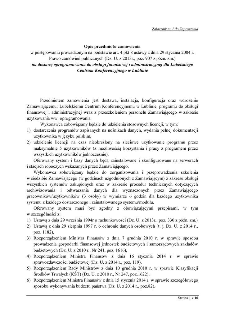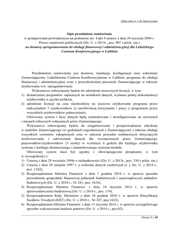 Załącznik nr 1 do Zaproszenia Opis przedmiotu zamówienia w postępowaniu prowadzonym na podstawie art. 4 pkt 8 ustawy z dnia 29 stycznia 2004 r. Prawo zamówień publicznych (Dz. U. z 2013r., poz. 907 z późn. zm.) na dostawę oprogramowania do obsługi finansowej i administracyjnej dla Lubelskiego Centrum Konferencyjnego w Lublinie Przedmiotem zamówienia jest dostawa, instalacja, konfiguracja oraz wdrożenie Zamawiającemu: Lubelskiemu Centrum Konferencyjnemu w Lublinie, programu do obsługi finansowej i administracyjnej wraz z przeszkoleniem personelu Zamawiającego w zakresie użytkowania ww. oprogramowania. Wykonawca zobowiązany będzie do udzielenia stosownych licencji, w tym: 1) dostarczenia programów zapisanych na nośnikach danych, wydania pełnej dokumentacji użytkownika w języku polskim, 2) udzielenie licencji na czas nieokreślony na sieciowe użytkowanie programu przez maksymalnie 5 użytkowników (z możliwością korzystania i pracy z programem przez wszystkich użytkowników jednocześnie). Oferowany system i bazy danych będą zainstalowane i skonfigurowane na serwerach i stacjach roboczych wskazanych przez Zamawiającego. Wykonawca zobowiązany będzie do zorganizowania i przeprowadzenia szkolenia w siedzibie Zamawiającego (w godzinach uzgodnionych z Zamawiającym) z zakresu obsługi wszystkich systemów zakupionych oraz w zakresie procedur technicznych dotyczących archiwizowania i odtwarzania danych dla wyznaczonych przez Zamawiającego pracowników/użytkowników (3 osoby) w wymiarze 6 godzin dla każdego użytkownika systemu z każdego dostarczonego i zainstalowanego systemu/modułu. Oferowany system musi być zgodny z obowiązującymi przepisami, w tym w szczególności z: 1) Ustawą z dnia 29 września 1994r o rachunkowości (Dz. U. z 2013r., poz. 330 z późn. zm.) 2) Ustawą z dnia 29 sierpnia 1997 r. o ochronie danych osobowych (t. j. Dz. U. z 2014 r., poz. 1182), 3) Rozporządzeniem Ministra Finansów z dnia 7 grudnia 2010 r. w sprawie sposobu prowadzenia gospodarki finansowej jednostek budżetowych i samorządowych zakładów budżetowych (Dz. U. z 2010 r., Nr 241, poz. 1616), 4) Rozporządzeniem Ministra Finansów z dnia 16 stycznia 2014 r. w sprawie sprawozdawczości budżetowej (Dz. U. z 2014 r., poz. 119), 5) Rozporządzeniem Rady Ministrów z dnia 10 grudnia 2010 r. w sprawie Klasyfikacji Środków Trwałych (KŚT) (Dz. U. z 2010 r., Nr 247, poz.1622), 6) Rozporządzeniem Ministra Finansów z dnia 15 stycznia 2014 r. w sprawie szczegółowego sposobu wykonywania budżetu państwa (Dz. U. z 2014 r., poz.82). Strona 1 z 10 System/moduł finansowo-księgowy: Oprogramowanie do obsługi księgowości i finansów powinno być łatwe w obsłudze, intuicyjne i funkcjonalne, ograniczać ryzyko popełnienia pomyłki, oferować użytkownikowi kompleksową pomoc na każdym etapie pracy i współpracować z innymi modułami systemu. Program/moduł do obsługi finansowo-księgowej musi umożliwiać wykonywanie zadań takich jak: 1) realizacja przelewów, 2) tworzenie rejestru VAT sprzedaż i zakupy, 3) budowa wydzielonych rejestrów księgowych (w dowolnej ilości) zgodnych ze specyfiką działalności jednostki (definiowanie przez użytkownika odrębnych planów kont, z odrębną analityką, możliwością sporządzania zestawień wg. potrzeb), 4) plan kont wielopoziomowy (min. 6 poziomów i 15 znaków), analityka z możliwością powiązania ze słownikami (danymi z innych miejsc systemu, w tym własnymi) na dowolnym miejscu i w dowolnej liczbie analityk; konta walutowe w standardzie; możliwe konta wielowalutowe, uwzględnienie klasyfikacji budżetowej w budowie kont, 5) rozliczenie międzyokresowe kosztów (RMK), 6) możliwość określenia sposobu budowy kodów kont analitycznych, 7) możliwość filtrowania zapisów w dziennikach i zestawieniu obrotów i sald, 8) możliwość ręcznego wprowadzania kodów kont analitycznych na podstawie zdefiniowanego przez użytkownika zestawu grup analitycznych: katalog kontrahentów, katalog pracowników, katalog ośrodków powstawania kosztów, źródeł finansowania działalności, 9) zbiorcza ewidencja dokumentów, 10) cechy/atrybuty dokumentów 11) możliwość zdefiniowania planu kont zgodnie z własnymi potrzebami oraz możliwość modyfikacji, rozbudowy i usuwania nieczynnych kont w dowolnym momencie pracy z systemem, 12) bieżąca informacja o obrotach i stanie konta, z możliwością uwzględnienia obrotów niezaksięgowanych 13) automatyczne przenoszenie i aktualizacja bilansu otwarcia kont księgi głównej nowego roku na podstawie bilansu zamknięcia poprzedniego roku, 14) możliwość wprowadzenia dokumentów z ręcznym określeniem sposobu dekretacji 15) Możliwość wprowadzania dokumentów z automatycznym określeniem sposobu dekretacji poprzez zdefiniowanie przez użytkownika schematy księgowania dokumentów dla określonych operacji gospodarczych, 16) możliwość sporządzania raportów obejmujących dane z kilku kont księgowych w określonym zakresie np. projektu, zadania lub podzadania w dowolnym momencie roku, 17) bieżące sprawdzanie poprawności wprowadzanych dokumentów – kontrola poprawności wprowadzanych dekretów przed ich ostatecznym zatwierdzeniem poprzez kontrolę bilansowania pozycji i zgodności kont przeciwstawnych, 18) automatyczne przeksięgowanie obrotów wybranych kont, Strona 2 z 10 19) automatyczne rozksięgowanie kosztów na konta ośrodków powstawania kosztów zgodnie z określonym kluczem rozdziału, 20) możliwość wykorzystania dodatkowych słowników nie stanowiących analityki kont przy dekretacji dokumentów (np. ewidencja kosztów wg samochodów), 21) możliwość wprowadzenia planów kont, grup Kont księgi głównej dla celów budżetu zadaniowego, 22) gromadzenie informacji o stanie rozrachunków z kontrahentami i ich obsługa, 23) gromadzenie informacji identyfikacyjnych kontrahentów (kartoteka kontrahentów), 24) możliwość syntetycznej/analitycznej inf
