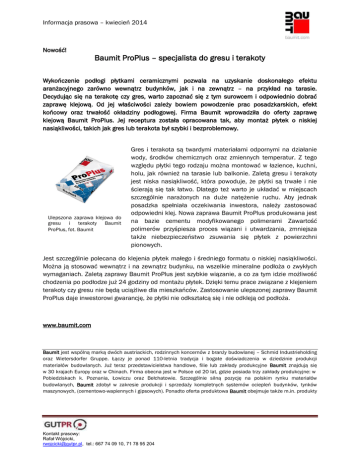 Informacja prasowa – kwiecień 2014 Nowość! Baumit ProPlus – specjalista do gresu i terakoty Wykończenie podłogi płytkami ceramicznymi pozwala na uzyskanie doskonałego efektu aranżacyjnego zarówno wewnątrz budynków, jak i na zewnątrz – na przykład na tarasie. Decydując się na terakotę czy gres, warto zapoznać się z tym surowcem i odpowiednio dobrać zaprawę klejową. Od jej właściwości zależy bowiem powodzenie prac posadzkarskich, efekt końcowy oraz trwałość okładziny podłogowej. Firma Baumit wprowadziła do oferty zaprawę klejową Baumit ProPlus. Jej receptura została opracowana tak, aby montaż płytek o niskiej nasiąkliwości, takich jak gres lub terakota był szybki i bezproblemowy. Ulepszona zaprawa klejowa do gresu i terakoty Baumit ProPlus, fot. Baumit Gres i terakota są twardymi materiałami odpornymi na działanie wody, środków chemicznych oraz zmiennych temperatur. Z tego względu płytki tego rodzaju można montować w łazience, kuchni, holu, jak również na tarasie lub balkonie. Zaletą gresu i terakoty jest niska nasiąkliwość, która powoduje, że płytki są trwałe i nie ścierają się tak łatwo. Dlatego też warto je układać w miejscach szczególnie narażonych na duże natężenie ruchu. Aby jednak posadzka spełniała oczekiwania inwestora, należy zastosować odpowiedni klej. Nowa zaprawa Baumit ProPlus produkowana jest na bazie cementu modyfikowanego polimerami Zawartość polimerów przyśpiesza proces wiązani i utwardzania, zmniejsza także niebezpieczeństwo zsuwania się płytek z powierzchni pionowych. Jest szczególnie polecana do klejenia płytek małego i średniego formatu o niskiej nasiąkliwości. Można ją stosować wewnątrz i na zewnątrz budynku, na wszelkie mineralne podłoża o zwykłych wymaganiach. Zaletą zaprawy Baumit ProPlus jest szybkie wiązanie, a co za tym idzie możliwość chodzenia po podłodze już 24 godziny od montażu płytek. Dzięki temu prace związane z klejeniem terakoty czy gresu nie będą uciążliwe dla mieszkańców. Zastosowanie ulepszonej zaprawy Baumit ProPlus daje inwestorowi gwarancję, że płytki nie odkształcą się i nie odkleją od podłoża. www.baumit.com Baumit jest wspólną marką dwóch austriackich, rodzinnych koncernów z branży budowlanej – Schmid Industrieholding oraz Wietersdorfer Gruppe. Łączy je ponad 110-letnia tradycja i bogate doświadczenia w dziedzinie produkcji materiałów budowlanych. Już teraz przedstawicielstwa handlowe, filie lub zakłady produkcyjne Baumit znajdują się w 30 krajach Europy oraz w Chinach. Firma obecna jest w Polsce od 20 lat, gdzie posiada trzy zakłady produkcyjne: w Pobiedziskach k. Poznania, Łowiczu oraz Bełchatowie. Szczególnie silną pozycję na polskim rynku materiałów budowlanych, Baumit zdobył w zakresie produkcji i sprzedaży kompletnych systemów ociepleń budynków, tynków maszynowych, (cementowo-wapiennych i gipsowych). Ponadto oferta produktowa Baumit obejmuje także m.in. produkty Kontakt prasowy: Rafał Wójcicki, [email protected], tel.: 667 74 09 10, 71 78 95 204 Informacja prasowa – kwiecień 2014 do: układania płytek ceramicznych, materiały do renowacji zabytków, a także jastrychy, wyprawy wierzchnie oraz zaprawy murarskie. Kontakt prasowy: Rafał Wójcicki, [email protected], tel.: 667 74 09 10, 71 78 95 204