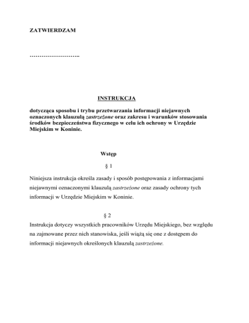 ZATWIERDZAM …………………….. INSTRUKCJA dotycząca sposobu i trybu przetwarzania informacji niejawnych oznaczonych klauzulą zastrzeŜone oraz zakresu i warunków stosowania środków bezpieczeństwa fizycznego w celu ich ochrony w Urzędzie Miejskim w Koninie. Wstęp §1 Niniejsza instrukcja określa zasady i sposób postępowania z informacjami niejawnymi oznaczonymi klauzulą zastrzeŜone oraz zasady ochrony tych informacji w Urzędzie Miejskim w Koninie. §2 Instrukcja dotyczy wszystkich pracowników Urzędu Miejskiego, bez względu na zajmowane przez nich stanowiska, jeśli wiąŜą się one z dostępem do informacji niejawnych określonych klauzulą zastrzeŜone. Klasyfikowanie informacji niejawnych §3 Informacjom niejawnym nadaje się klauzulę zastrzeŜone, jeŜeli nie nadano im wyŜszej klauzuli tajności, a ich nieuprawnione ujawnienie moŜe mieć szkodliwy wpływ na wykonywanie przez jednostki organizacyjne zadań w zakresie obrony narodowej, polityki zagranicznej, bezpieczeństwa publicznego, przestrzegania praw i wolności obywateli, wymiaru sprawiedliwości albo interesów ekonomicznych Rzeczypospolitej Polskiej. §4 Klauzulę tajności nadaje osoba, która jest uprawniona do podpisania dokumentu lub oznaczenia innego niŜ dokument materiału. Osoba ta moŜe określić datę lub wydarzenie, po których nastąpi zniesienie lub zmiana klauzuli tajności. §5 Zniesienie lub zmiana klauzuli tajności są moŜliwe wyłącznie po wyraŜeniu pisemnej zgody przez osobę, o której mowa w § 4 , albo jej przełoŜonego – w przypadku ustania lub zmiany ustawowych przesłanek ochrony. Po zniesieniu lub zmianie klauzuli tajności podejmuje się czynności polegające na naniesieniu odpowiednich zmian w oznaczeniu dokumentu i poinformowaniu o tym jego odbiorców. §6 Informacjom niejawnym, materiałom, a zwłaszcza dokumentom i ich zbiorom przyznaje się klauzulę tajności co najmniej równą najwyŜszej zaklasyfikowanej informacji lub najwyŜszej klauzuli w zbiorze. §7 Informacjami niejawnymi o klauzuli zastrzeŜone w Urzędzie Miejskim w Koninie są informacje dotyczące, m.in.: 1/ realizacji poszczególnych zadań operacyjnych w warunkach zewnętrznego zagroŜenia bezpieczeństwa państwa i w czasie wojny, 2/ prowadzenia akcji kurierskiej, 3/ lokalizacji zapasowego miejsca pracy, 4/ wykazu osób zatrudnionych i uprawnionych do dostępu do informacji niejawnych, 5/ inne – zgodnie z decyzją osób uprawnionych do podpisywania dokumentów. Dostęp do informacji niejawnych o klauzuli zastrzeŜone §8 Dokumenty niejawne o klauzuli zastrzeŜone mogą być udostępniane wyłącznie osobom, które spełniają następujące warunki: 1/ posiadają waŜne poświadczenie bezpieczeństwa upowaŜniające do dostępu do informacji niejawnych o klauzuli co najmniej zastrzeŜone lub upowaŜnienie Prezydenta wystawione zgodnie z art. 21 ust. 4 ustawy o ochronie informacji niejawnych, 2/ odbyły przeszkolenie w zakresie ochrony informacji niejawnych i posiadają aktualne zaświadczenie stwierdzające odbycie tego przeszkolenia ( nie starsze niŜ 5 lat od daty wystawienia), 3/ realizują zadania, które wymagają dostępu do określonej informacji zastrzeŜonej. §9 Ewidencję poświadczeń bezpieczeństwa oraz upowaŜnień, o których mowa w § 8 pkt. 1, prowadzi Pełnomocnik ds. Ochrony Informacji Niejawnych (dalej Pełnomocnik Ochrony) . Pracownik , który posiada poświadczenie bezpieczeństwa wydane w innej jednostce organizacyjnej, obowiązany jest do przedłoŜenia oryginału Pełnomocnikowi Ochrony w ciągu 5 dni od chwili poinformowania go o tym fakcie. § 10 Kierownicy komórek organizacyjnych Urzędu Miejskiego zobowiązani są do informowania Pełnomocnika Ochrony o konieczności wydania upowaŜnienia przez Prezydenta pracownikom, których zakres obowiązków wymaga dostępu do dokumentów niejawnych oznaczonych klauzulą zastrzeŜone. Obieg dokumentów i materiałów oznaczonych klauzulą zastrzeŜone § 11 Korespondencja przychodząca z zewnątrz Urzędu Miejskiego, zawierająca informacje niejawne zakwalifikowane jako zastrzeŜone , wpływająca do Kancelarii Ogólnej Urzędu Miejskiego za pośrednictwem poczty polskiej lub przesyłek kurierskich, przekazywana jest pracownikowi Kancelarii Materiałów Niejawnych, który po zarejestrowaniu w „Dzienniku ewidencyjnym”, przekazuje Prezydentowi w celu dokonania dekretacji lub innemu wskazanemu na kopercie adresatowi. § 12 Pracownik Kancelarii Ogólnej Urzędu Miejskiego, dokonujący odbioru przesyłki, zobowiązany jest sprawdzić: - prawidłowość adresu, - całość pieczęci i opakowania, - zgodność odcisku pieczęci na opakowaniu z nazwą jednostki nadawcy, - odcisnąć na przesyłce pieczęć oraz wpisać datę wpływu do Urzędu, - potwierdzić w KsiąŜce Doręczeń Przesyłek Miejscowych fakt przekazania przesyłki niejawnej pracownikowi Kancelarii Materiałów Niejawnych. W przypadku stwierdzenia uszkodzenia przesyłki lub śladów jej otwierania, osoba kwitująca odbiór przesyłki sporządza, wraz z doręczającym , protokół uszkodzenia. Jeden egzemplarz protokółu przekazuje się nadawcy, drugi Pełnomocnikowi Ochrony, a w przypadku gdy w obiegu przesyłek pośredniczył Przewoźnik – kolejny egzemplarz protokołu przekazuje się takŜe jemu. § 13 Pracownik Kancelarii Materiałów Niejawnych po otrzymaniu i otwarciu przesyłki: - sprawdza, czy zawartość przesyłki odpowiada wyszczególnionym na niej numerom ewidencyjnym, - ustala, czy liczba załączników i stron jest zgodna z liczbą podaną na poszczególnych dokumentach. W razie stwierdzenia nieprawidłowości, pracownik Kancelarii Materiałów Niejawnych sporządza w dwóch egzemplarzach protokół z otwarcia przesyłki, zawierający opis nieprawidłowości, jeden egzemplarz przekazując do nadawcy. Fakt sporządzenia protokółu odnotowuje się w „Dzienniku ewidencyjnym”, w rubryce „Informacje uzupełniające/uwagi”. § 14 Prezydent do