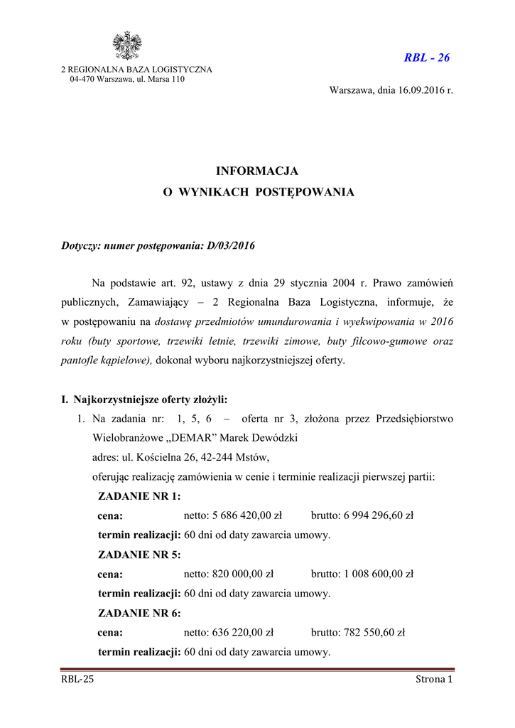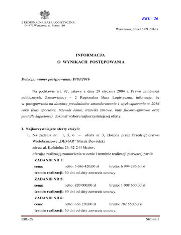 RBL - 26 2 REGIONALNA BAZA LOGISTYCZNA 04-470 Warszawa, ul. Marsa 110 Warszawa, dnia 16.09.2016 r. INFORMACJA O WYNIKACH POSTĘPOWANIA Dotyczy: numer postępowania: D/03/2016 Na podstawie art. 92, ustawy z dnia 29 stycznia 2004 r. Prawo zamówień publicznych, Zamawiający – 2 Regionalna Baza Logistyczna, informuje, że w postępowaniu na dostawę przedmiotów umundurowania i wyekwipowania w 2016 roku (buty sportowe, trzewiki letnie, trzewiki zimowe, buty filcowo-gumowe oraz pantofle kąpielowe), dokonał wyboru najkorzystniejszej oferty. I. Najkorzystniejsze oferty złożyli: 1. Na zadania nr: 1, 5, 6 – oferta nr 3, złożona przez Przedsiębiorstwo Wielobranżowe „DEMAR” Marek Dewódzki adres: ul. Kościelna 26, 42-244 Mstów, oferując realizację zamówienia w cenie i terminie realizacji pierwszej partii: ZADANIE NR 1: cena: netto: 5 686 420,00 zł brutto: 6 994 296,60 zł termin realizacji: 60 dni od daty zawarcia umowy. ZADANIE NR 5: cena: netto: 820 000,00 zł brutto: 1 008 600,00 zł termin realizacji: 60 dni od daty zawarcia umowy. ZADANIE NR 6: cena: netto: 636 220,00 zł brutto: 782 550,60 zł termin realizacji: 60 dni od daty zawarcia umowy. RBL-25 Strona 1 Uzasadnienie wyboru: Wykonawca „DEMAR” Marek Dewódzki, uzyskał najwyższą punktację = 100 pkt. Zamawiający dokonał wyboru oferty oddzielnie dla każdego zadania przy zastosowaniu kryterium: cena = 90%, termin realizacji pierwszej partii = 10%. Wykonawca w zadaniach nr 1, 5 i 6 uzyskał najwyższą punktację = 100 pkt. II. W postępowaniu na zadania 1,5 i 6 złożono 1 ofertę, której zbiorcze zestawienie cen i uzyskanej punktacji, w kryterium „cena= 90%” oraz „termin realizacji pierwszej partii = 10%”, dla poszczególnych zadań, przedstawia poniższa tabela: Nr oferty Nazwa wykonawcy Oferowana cena Liczba pkt w kryterium cena Termin realizacji Liczba pkt w kryterium termin realizacji Razem 60 dni 10,00 100,00 60 dni 10,00 100,00 60 dni 10,00 100,00 ZADANIE NR 1 3 Przedsiębiorstwo Wielobranżowe „DEMAR” Marek Dewódzki ul. Kościelna 26, 42-244 Mstów netto: 5 686 420,00 zł brutto: 6 994 296,60 zł 90,00 ZADANIE NR 5 3 Przedsiębiorstwo Wielobranżowe „DEMAR” Marek Dewódzki ul. Kościelna 26, 42-244 Mstów netto: 820 000,00 zł brutto: 1 008 600,00 zł 90,00 ZADANIE NR 6 3 Przedsiębiorstwo Wielobranżowe „DEMAR” Marek Dewódzki ul. Kościelna 26, 42-244 Mstów netto: 636 220,00 zł brutto: 782 550,60 zł 90,00 III. Z postępowania nie wykluczono wykonawców. IV. W postępowaniu nie odrzucono ofert. V. Zamawiający informuje, zgodnie z art. 94, przed upływem 10 dni od niniejszego zawiadomienia, może zostać zawarta umowa w sprawie udzielenia zamówienia Wykonawcom wskazanym w pkt. I. RBL-25 Strona 2 VI. Zgodnie z art. 180 ust. 1 i 2 ustawy z dnia 29 stycznia 2004r. Prawo zamówień publicznych, Wykonawcy mogą wnieść odwołanie w ciągu 10 dni od dnia przesłania informacji o czynności Zamawiającego stanowiącej podstawę jego wniesienia. KOMENDANT 2 RBLog /-/ cz.p.o. płk Dariusz NAGRABSKI RBL-25 Strona 3