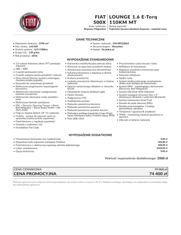 FIAT LOUNGE 1.6 E-Torq 500X 110KM MT Kolor nadwozia: Brązowy Magnetico Rodzaj tapicerki: Tapicerka łączona ekoskóra brązowa - materiał szary DANE TECHNICZNE • Pojemność skokowa : 1598 cm3 • Moc silnika : 110 KM • Średnie spalanie : 6.0 l/100km • Emisja CO2 : 139 g/km • Rok produkcji : 2016 • Numer nadwozia : 334 0P522063 • Skrzynia biegów : Manualna • Napęd : Na jedną oś WYPOSAŻENIE STANDARDOWE • 3,5-calowy kolorowy ekran TFT pomiędzy zegarami • ABS + EBD • Czujniki parkowania tylne • Czujniki zapięcia pasów przednich i tylnych • Drive Mood Selector (system zmieniąjący charakterystykę pojazdu) • Dywaniki do samochodu (przednie) • Elektryczne progresywne wspomaganie kierownicy • Elektrycznie sterowane i podgrzewane lusterka zewnętrzne • Elektrycznie sterowane szyby przednie i tylne • Elektryczny hamulec postojowy • ESC + Dynamic Steering Torque + Electr Roll Mitigation + Electr Brake Prefill + Hill Start Assist • Felgi ze stopów lekkich 18" 15-ramienne • Fix&Go - zestaw do naprawy opon ze sprężarką (wyklucza koło zapasowe) • Fotel kierowcy z regulacją wysokości • Gniazdo z zasilaniem 12v • Immobiliser Fiat Code • • • • • • • • • • • • • • • • Kierownica wielofunkcyjna pokryta skórą Kieszenie na oparciach przednich siedzeń Klimatyzacja automatyczna dwustrefowa Kolumna kierownicy z regulacją w dwóch płaszczyznach Kurtyny powietrzne Lusterka zewnętrzne lakierowane w kolorze nadwozia Oparcie tylnej kanapy składane w stosunku 60/40 Oświetlenie wnętrza Ambient Light Pakiet Chromo Podgrzewacz PTC Podłokietnik przedni Poduszka powietrzna kierowcy Poduszka powietrzna pasażera Poduszki powietrzne przednie boczne Podwójna podłoga bagażnika Cargo Magic Space (dostępna tylko z Fix&Go (opcja 499)) Port USB i AUX • Przyciemnione szyby boczne i tylna • Reflektory bi-ksenonowe • Regulacja wysokości mocowania pasa bezpieczeństwa • Schowek chłodzony • Spojler tylny • System bezkluczykowego uruchamiania silnika oraz dostępu do samochodu • System ERM - zapobiegający dachowaniu (Electronic Roll Mitigation) • System GSI (Gear Shift Indicator) • System nawigacji Uconnect Nav z 5" dotykowym ekranem i systemem Bluetooth • System tankowania Smart Fuel • Światła do jazdy dziennej (DRL) • Światła przeciwmgielne z funkcją doświetlania zakrętów • Tempomat i ogranicznik prędkości • TPMS - monitoring ciśnienia powietrza w oponach • Zderzaki w kolorze nadwozia WYPOSAŻENIE DODATKOWE • • • • • Chromowana końcówka rury wydechowej Dojazdowe koło zapasowe (zastępuje Fix&Go) Fotel kierowcy z elektryczną regulacją odcinka lędźwiowego Lakier metalizowany Opcja techniczna 0.00 zł 450.00 zł 600.00 zł 2450.00 zł 0.00 zł Wartość wyposażenia dodatkowego: 3500 zł CENA CENNIKOWA CENA PROMOCYJNA 79 000 zł 74 400 zł Niniejsze ogłoszenie jest wyłącznie informacją handlową i nie stanowi oferty w myśl art. 66, § 1. Kodeksu Cywilnego. Sprzedający nie odpowiada za ewentualne błędy lub nieaktualność ogłoszenia.
