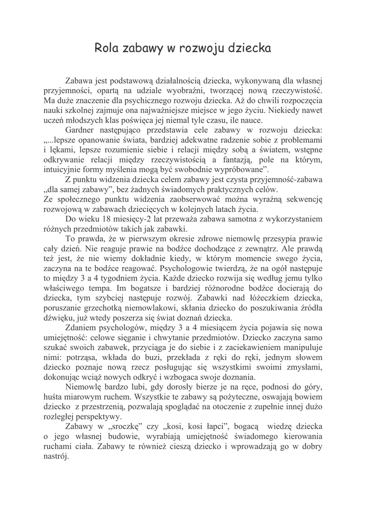 ! " ! na % & # ' enie sobie z problemami # # ) * * + -zabawa * # # # * $ # ( ( # ) ! Z punktu widzenia dziecka + ! # , -. # -2 * / %$ ! # " * ! # 1 2 ! ! 4 0 3 ! ! !* ! # ! # # * * * ! * # # # !* #! ' # % 1 2 # * , ! ' dziecko p # ! # # ! $ # ! # !* owiem 5 ! ! ( #+ ! + # * nastrój. ( ! # ! ! 0 ! ! * ! 0 ramion mamy w ramiona taty. Zabawa ta daje ) % , * 6 * ! ! ! 5 * 5 ) # ! % ( ny # ( + ! 7 # # !+ # * ! - 6 # * ! * ( + 6 # , # ! # * ! " #' mówi c ) # je to odzwierciedlenie ! * ! 8 # ! # 5 0 0 * # ! 7 ! ! ! # # # ) * # # dziecko wci 9 * # * * 0 ! ! 5 ' * * ! 0 p ! ! 4 * * ! ! , # * #! 7 # # !* ! # * 5 ! # ! # ! ) ' * 0 zabaw dziecka. * * # ! ! ) ! * ! ! ! ! # * % % ! 7 * ! # * # # * 5 !# # majsterkowanie. D 4 * * !* * * : # # ! ! ! kojarzen # ! ! !* # 6 * ! # ! * * ) ! * !* ; * # )! * teryjki, domina liczbowe i obrazkowe, gry < 5 ! ! ! Bardzo ! # ! # ! ! ! # * ) ! ! 7 ' * # ) ychomotorycznego dziecka. Zabawy ruchowe: * # # ! # zaspokojenia naturalnej potrzeby ruchu, ) ' ) # * # - ! * # ! ! # ! # # * * ! * - # # ! ! !* *) * # * 5 # * , # ! ! # * $ ) ! + je! # 0 # ! # * ! ( * ! !# $ ! # ! / ! # ! * ! # # # ! ! = ( + * # ! Zabawy > # * !# # # Zabawy * ! 5 osób. A tematów dostarczy nie tylko > ? , ! # # * ' ! # * bardzo potrzebne przy nauce szkolnej. > # 8 ! # , 5 ! # #! # ' ! ! @ # 0 # # # 5 # # #!* ) ! zieci do ? ! * * * # ) ' # Literatura: Ann Brich, Tony Malim „Psychologia rozwojowa w zarysie”. Maria Klimowa: „Zabawy z moim dzieckiem”. 5 5 7 %'( & + 3 5 '(5 7 ) '4 + 6 % #