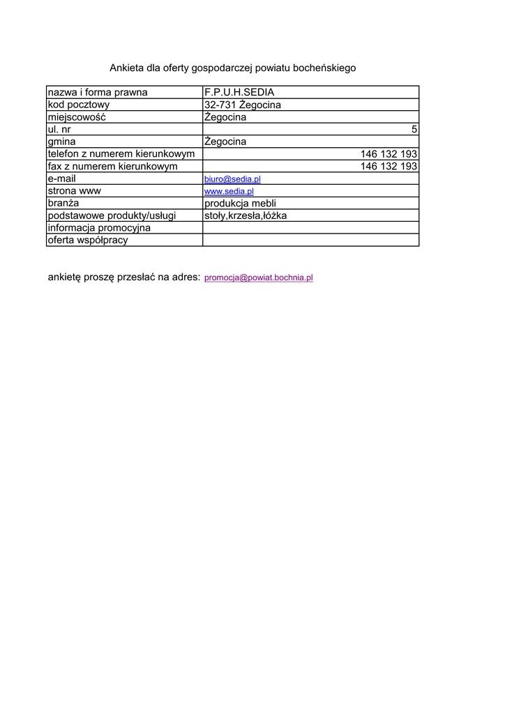 Ankieta dla oferty gospodarczej powiatu bocheńskiego nazwa i forma prawna kod pocztowy miejscowość ul. nr gmina telefon z numerem kierunkowym fax z numerem kierunkowym e-mail strona www branŜa podstawowe produkty/usługi informacja promocyjna oferta współpracy F.P.U.H.SEDIA 32-731 śegocina śegocina 5 śegocina 146 132 193 146 132 193 [email protected] www.sedia.pl produkcja mebli stoły,krzesła,łóŜka ankietę proszę przesłać na adres: [email protected]