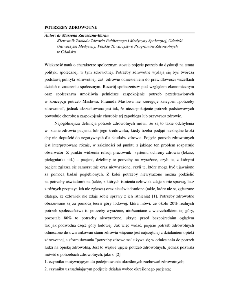 POTRZEBY ZDROWOTNE Autor: dr Marzena Zarzeczna