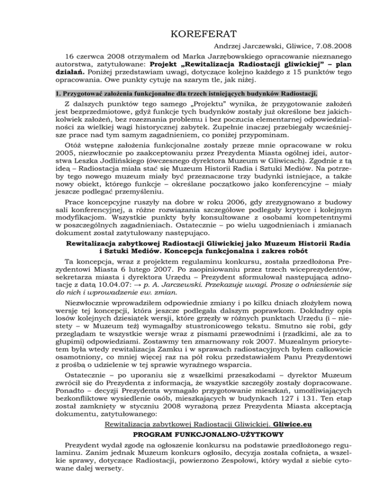 KOREFERAT Andrzej Jarczewski, Gliwice, 7.08.2008 16 czerwca 2008 otrzymałem od Marka Jarzębowskiego opracowanie nieznanego autorstwa, zatytułowane: Projekt „Rewitalizacja Radiostacji gliwickiej” – plan działań. PoniŜej przedstawiam uwagi, dotyczące kolejno kaŜdego z 15 punktów tego opracowania. Owe punkty cytuję na szarym tle, jak niŜej. 1. Przygotować załoŜenia funkcjonalne dla trzech istniejących budynków Radiostacji. Z dalszych punktów tego samego „Projektu” wynika, Ŝe przygotowanie załoŜeń jest bezprzedmiotowe, gdyŜ funkcje tych budynków zostały juŜ określone bez jakichkolwiek załoŜeń, bez rozeznania problemu i bez poczucia elementarnej odpowiedzialności za wielkiej wagi historycznej zabytek. Zupełnie inaczej przebiegały wcześniejsze prace nad tym samym zagadnieniem, co poniŜej przypominam. OtóŜ wstępne załoŜenia funkcjonalne zostały przeze mnie opracowane w roku 2005, niezwłocznie po zaakceptowaniu przez Prezydenta Miasta ogólnej idei, autorstwa Leszka Jodlińskiego (ówczesnego dyrektora Muzeum w Gliwicach). Zgodnie z tą ideą – Radiostacja miała stać się Muzeum Historii Radia i Sztuki Mediów. Na potrzeby tego nowego muzeum miały być przeznaczone trzy budynki istniejące, a takŜe nowy obiekt, którego funkcje – określane początkowo jako konferencyjne – miały jeszcze podlegać przemyśleniu. Prace koncepcyjne ruszyły na dobre w roku 2006, gdy zrezygnowano z budowy sali konferencyjnej, a róŜne rozwiązania szczegółowe podlegały krytyce i kolejnym modyfikacjom. Wszystkie punkty były konsultowane z osobami kompetentnymi w poszczególnych zagadnieniach. Ostatecznie – po wielu uzgodnieniach i zmianach dokument został zatytułowany następująco. Rewitalizacja zabytkowej Radiostacji Gliwickiej jako Muzeum Historii Radia i Sztuki Mediów. Koncepcja funkcjonalna i zakres robót Ta koncepcja, wraz z projektem regulaminu konkursu, została przedłoŜona Prezydentowi Miasta 6 lutego 2007. Po zaopiniowaniu przez trzech wiceprezydentów, sekretarza miasta i dyrektora Urzędu – Prezydent sformułował następującą adnotację z datą 10.04.07: → p. A. Jarczewski. Przekazuję uwagi. Proszę o odniesienie się do nich i wprowadzenie ew. zmian. Niezwłocznie wprowadziłem odpowiednie zmiany i po kilku dniach złoŜyłem nową wersję tej koncepcji, która jeszcze podlegała dalszym poprawkom. Dokładny opis losów kolejnych dziesiątek wersji, które grzęzły w róŜnych punktach Urzędu (i – niestety – w Muzeum teŜ) wymagałby stustronicowego tekstu. Smutno się robi, gdy przeglądam te wszystkie wersje wraz z pismami przewodnimi i (rzadkimi, ale za to głupimi) odpowiedziami. Zostawmy ten zmarnowany rok 2007. Muzealnym priorytetem była wtedy rewitalizacja Zamku i w sprawach radiostacyjnych byłem całkowicie osamotniony, co mniej więcej raz na pół roku przedstawiałem Panu Prezydentowi z prośbą o udzielenie w tej sprawie wyraźnego wsparcia. Ostatecznie – po uporaniu się z wszelkimi przeszkodami – dyrektor Muzeum zwrócił się do Prezydenta z informacją, Ŝe wszystkie szczegóły zostały dopracowane. Ponadto – decyzji Prezydenta wymagało przygotowanie mieszkań, umoŜliwiających bezkonfliktowe wysiedlenie osób, mieszkających w budynkach 127 i 131. Ten etap został zamknięty w styczniu 2008 wyraŜoną przez Prezydenta Miasta akceptacją dokumentu, zatytułowanego: Rewitalizacja zabytkowej Radiostacji Gliwickiej. Gliwice.eu PROGRAM FUNKCJONALNO-UśYTKOWY Prezydent wydał zgodę na ogłoszenie konkursu na podstawie przedłoŜonego regulaminu. Zanim jednak Muzeum konkurs ogłosiło, decyzja została cofnięta, a wszelkie sprawy, dotyczące Radiostacji, powierzono Zespołowi, który wydał z siebie cytowane dalej wersety. 2. W pierwszym etapie - wykonać remont dachów we wszystkich budynkach oraz wymienić stolarkę okienną. Oczywiście – trzeba to zrobić niezwłocznie. Sygnalizuje tę potrzebę od pięciu lat, ale obecnie jest to juŜ potrzeba naprawdę nagląca. Niewiele jednak wskazuje, by w roku 2008 cokolwiek w tej sprawie było robione. 3. Przystosować dla funkcji muzealnych – stała ekspozycja poświęcona prowokacji gliwickiej – wybrane pomieszczenia budynku głównego. Tak moŜe napisać tylko osobnik, który nigdy nie był w Radiostacji i w ogóle nie ma pojęcia co i po co tam się robi. NiechŜe ten osobnik zajrzy do budynku 129 i pokaŜe, które to „wybrane” pomieszczenia naleŜy przystosować do funkcji (jakich konkretnie?) muzealnych. I co w języku tego znawcy oznacza sformułowanie „stała ekspozycja” (mówimy o tym w czasach, gdy Muzeum Powstania Warszawskiego wyznaczyło pewne standardy). 4. Wykwaterować mieszkańców dwóch bocznych budynków. Jedna ze spraw wałkowanych od dawna. Zawsze pojawiały się jakieś przeszkody, a bez decyzji w tej sprawie nie moŜna było nic zrobić. MoŜe tym razem? 5. Rozpocząć proces wykupu terenów przyległych do działki, na której znajduje się Radiostacja. Znów: PO CO!!! W mieście mamy setki hektarów, które moŜna wykupić w jakimś sensownym celu. Tu o Ŝadnym sensownym celu nic nie wiadomo. MoŜemy się więc obawiać bardzo złych rzeczy. Byłoby dobrze – przed przystąpieniem do owego „Rozpoczęcia” – zastanowić się, kto i dlaczego lansuje tak ryzykowny pomysł. 6. Wyburzyć wszystkie, nie mające historycznych korzeni, obiekty i budynki, które znajdują się na terenie działki Radiostacji. Budynki gospodarczo - magazynowe, garaŜe, altanki działkowe, domek straŜnika obok wieŜy. Oczom własnym nie wierzę. JeŜeli nowo zakupiony domek straŜnika obok wieŜy ma być wyburzony, to znaczy, Ŝe nie pisało tego dziecko. Autorem nie jest nawet zwykły kretyn. To napisać mógł tylko sabotaŜysta lub płatny agent. Cały czas się łudzę nadzieją, Ŝe to jednak tylko idiota. Obym miał rację. Tego jednak nie mogę pozostawić własnemu losowi. śądam niezwłocznego, pisemnego zapewnienia, Ŝe 