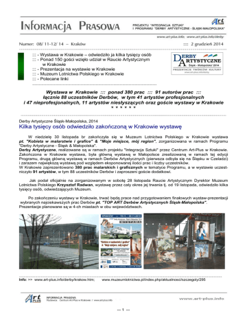 Numer: 08/ 11-12/ 14 – Kraków :::: 2 grudzień 2014 ........................................................................................................................................................................................................ ::: - Wystawa w Krakowie – odwiedziło ja kilka tysięcy osób ::: - Ponad 150 gości wzięło udział w Raucie Artystycznym w Krakowie ::: - Prezentacja na wystawie w Krakowie ::: - Muzeum Lotnictwa Polskiego w Krakowie ::: - Polecane linki .................................................................................................. Wystawa w Krakowie ::: ponad 380 prac ::: 91 autorów prac ::: łącznie 88 uczestników Derbów, w tym 41 artystów profesjonalnych i 47 nieprofesjonalnych, 11 artystów niesłyszących oraz goście wystawy w Krakowie ****** ...................................................................................................................................................................................................... Derby Artystyczne Śląsk-Małopolska, 2014 Kilka tysięcy osób odwiedziło zakończoną w Krakowie wystawę W niedzielę 30 listopada br zakończyła się w Muzeum Lotnictwa Polskiego w Krakowie wystawa pt. "Kobieta w malarstwie i grafice" & "Moje miejsce, mój region", zorganizowana w ramach Programu "Derby Artystyczne - Śląsk & Małopolska". Derby Artystyczne, realizowane są w ramach projektu "Integracja Sztuki" przez Centrum Art-Plus w Krakowie. Zakończona w Krakowie wystawa, była główną wystawą w Małopolsce zrealizowaną w ramach tej edycji Programu, drugą główną wystawą w ramach Derbów Artystycznych (pierwsza odbyła się na Śląsku w Czeladzi) i zarazem największą wystawą pod względem eksponowanej ilości prac i liczby uczestników. W Krakowie zaprezentowano 380 prac malarskich i graficznych w tematyce Programu, a w wystawie uczestniczyło 91 artystów, w tym 88 uczestników Derbów i zaproszeni goście dodatkowi. Jak podał oficjalnie na zorganizowanym w sobotę 28 listopada Raucie Artystycznym Dyrektor Muzeum Lotnictwa Polskiego Krzysztof Radwan, wystawę przez cały okres jej trwania tj. od 19 listopada, odwiedziło kilka tysięcy osób, odwiedzających Muzeum. Po zakończeniu wystawy w Krakowie, trwać będą prace nad przygotowaniem finałowych wystaw-prezentacji wybranych najciekawszych prac Derbów pt. "TOP ART Derbów Artystycznych Śląsk-Małopolska". Prezentacje planowane są w 4-ch miastach w obu województwach. ................................................................................................................................................................................ Info: >> www.art-plus.info/derby/krakow.htm; www.muzeumlotnictwa.pl/index.php/aktualnosci/szczegoly/295 --- 1 --- ****** ...................................................................................................................................................................................................... Spotkanie artystów z obu województw Ponad 150-ciu gości wzięło udział w Raucie Artystycznym w Krakowie W piątek 28 listopada o godzinie 17.00, w Muzeum Lotnictwa Polskiego w Krakowie odbył się Raut Artystyczny , będący spotkaniem artystów i twórców biorących udział w Derbach oraz zaproszonych gości z obu województw. W Raucie w Krakowie uczestniczyło ponad 150 osób. Spotkanie rozpoczęło się od krótkich wystąpień organizatorów i współorganizatorów. Dyrektor Muzeum Lotnictwa Polskiego witając wszystkich gości, podziękował za wystawę zorganizowaną w Muzeum i za tak liczne uczestnictwo autorów, podsumowując również, że było to swoistego rodzaju wydarzenie, w którym wystawę odwiedziło kilka tysięcy osób przez 11 dni jej trwania. Równocześnie zwrócił uwagę, że obrazy tak różnorodne, wkomponowały się w przestrzeń i specyfikę Muzeum, współgrając przez te kilkanaście dni z eksponatami lotniczymi. Na ręce artystów i organizatorów skierował zaproszenie, zapraszając do organizacji innych wydarzeń kolejnych Derbów w Muzeum. Po oficjalnej inauguracji Rautu, gości zaproszono na część muzyczną Rautu – gościnnie jedną z ciekawszych piosenek zaśpiewała Alisa Koshkina, która swoimi wokalnymi umiejętnościami zachwyciła publiczność, a wcześniej występowała przed publicznością w Nakle Śląskim i w Czeladzi. Następnie z krótkim koncertem standardów muzycznych wystąpił duet "Basia & Kamil", który miesiąc wcześniej zachwycił swoim występem uczestników Rautu Artystycznego w Wojniczu. Po muzycznej części, nastąpiła prezentacja kilku ciekawych i śmiesznych fraszek autorskich, które zebranej publiczności zaprezentowała ich autorka, uczestniczka Derbów Pani Longina Bujas. Po koncercie, odczytano specjalne "listy okolicznościowe" które zostały skierowane na ręce kierownictwa Centrum Art-Plus, a adresowane do organizatorów i artystów biorących udział w Derbach. Okolicznościowe listy skierowali: Marszałek Województwa Małopolskiego Marek Sowa, Burmistrz Miasta Czeladź Teresa Kosmala, Wiceprezydent Miasta Mysłowice Grzegorz Brzoska, Burmistrz Wojnicza Jacek Kurek, Dyrektor Centrum Kultury Śląskiej Pałac w Nakle Śląskim Stanisław Zając. Odczytane listy, zostały przyjęte brawami przez uczestników Rautu. Zaskoczeniem było "odczytanie" przez przedstawiciela Centrum Art-Plus "słów które nie nadeszły" od Prezydenta Krakowa Pana Jacka Majchrowskiego... Po chwili konsternacji, publiczność przyjęła to śmiechem i gromkimi brawami. Na zakończenie pierwszej części Rautu, przedstawiciele oddziału krakowskiego PZG przekazali na ręce Pani Prezes Centrum Art-Plus Lucyny Filipczyk podziękowanie i kwiaty, za olbrzymi wkład pracy włożony w przygotowanie Programu Derbów oraz zaproszenie i uwzględnienie w nim grupy "artystów niesłyszących". Następnie goście Rautu zaproszeni zostali do wykonania pamiątkowego zdjęcia i na okolicznościowy pocz