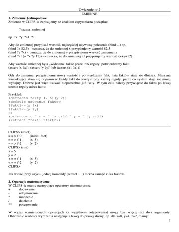 Ćwiczenie nr 2 ZMIENNE 1. Zmienne Jednopolowe Zmienne w CLIPS-ie zapisujemy ze znakiem zapytania na początku: ?nazwa_zmiennej np. ?x ?y ?a1 ?e Aby do zmiennej przypisać wartość, najczęściej używamy polecenia (bind ...) np. (bind ?x 82.5) – oznacza, że do zmiennej x przypisujemy wartość 82.5 (bind ?y ?x) - oznacza, że do zmiennej y przypisujemy wartość zmiennej x (bind ?a1 (+ ?x ?y 12)) – oznacza, że do zmiennej a1 przypisujemy wartość (x+y+12) Aby wartość zmiennej była „widziana” także przez inne reguły, potwierdzamy fakt: (assert (x ?x)), (assert (y ?y)) lub (assert (a1 ?a1)) Gdy do zmiennej przypisujemy nową wartość i potwierdzamy fakt, lista faktów staje się dłuższa. Maszyna wnioskująca stara się dopasować każdy fakt do lewej strony każdej reguły, przez co system staje się mniej wydajny. Dobrze jest więc usuwać niepotrzebne już fakty. W tym celu należy przywiązać do faktu po lewej stronie reguły adres faktu: Przykład: (deffacts fakty (x 5)(y 2)) (defrule usuwanie_faktow ?fakt1<-(x ?x) ?fakt2<-(y ?y) => (printout t " x = " ?x crlf " y = " ?y crlf) (retract ?fakt1 ?fakt2)) CLIPS> (reset) = = > f-0 (initial-fact) = = > f-1 (x 5) = = > f-2 (y 2) CLIPS> (run) x=5 y=2 < = = f-1 (x 5) < = = f-2 (y 2) CLIPS> Jak widać, przy użyciu jednej komendy (retract ….) można usunąć kilka faktów. 2. Operacje matematyczne W CLIPS-ie mamy następujące operatory matematyczne: + dodawanie odejmowanie * mnożenie / dzielenie ** potęgowanie W wyżej wymienionych operacjach (z wyjątkiem potęgowania) mogą być więcej niż dwa argumenty. Obliczanie wartości wyrażenia następuje z lewej do prawej strony, np. dla x=8, y=4, z=2, mamy: 1 (+ ?x ?y ?z) (- ?x ?y ?z) (* ?x ?y ?z) (/ ?x ?y ?z) daje 14 daje 2 daje 64 daje 1 Wykładnik w operacji potęgowania może być ułamkowy np. CLIPS> (** 8 (/ 1 3)) ;osiem do jednej-trzeciej Wyrażenia w CLIPS-ie zapisujemy w następujący sposób, np. (x + y * z) – x/z jako: (- (+ x (* y z)) (/ x z)) w CLIPS zostanie zapisane CLIPS operując na wyrażeniach liczbowych próbuje zachować typ wyniku taki sam jak typ argumentów, tzn. działanie na dwóch argumentach zmiennoprzecinkowych daje rezultat zmiennoprzecinkowy, na dwóch argumentach całkowitych – rezultat całkowity (z wyjątkiem dzielenia), argument zmiennoprzecinkowy i całkowity dają rezultat zmiennoprzecinkowy. Możemy jawnie zmienić jeden typ na inny, przez użycie funkcji (float ...) oraz (integer ...) CLIPS> (float (+ 2 3)) CLIPS> (integer (+ 2.0 3.0)) 3. Funkcje matematyczne (min ?x ?y ?z) ;zwraca najmniejszą liczbę z podanych (max ?x ?y ?z) ;zwraca największą liczbę z podanych (mod ?x ?y) ;zwraca resztę z dzielenia pierwszej liczby przez drugą (log ?x) ;zwraca logarytm naturalny z ?x (log10 ?x) ;zwraca logarytm dziesiętny z ?x (exp ?x) ;zwraca e podniesione do potegi ?x (sqrt ?x) ;zwraca pierwiastek kwadratowy z ?x (trunc ?x) ;zwraca całkowitą część liczby ?x (abs ?x) ;zwraca wartość bezwzględną z ?x (length $?x) ;zwraca liczbę pól w zmiennej wielopolowej $?x (nth n $?x) ;zwraca n-te pole zmiennej wielopolowej $?x (round ?x) ;zaokrągla ?x do najbliższej liczby całkowitej 4. Funkcje trygonometryczne (cos ?x) (sin ?x) (tan ?x) (cot ?x) Uwaga: Wszystkie argumenty muszą być podawane w radianach ! Funkcja (deg-rad ?beta) zamienia stopnie na radiany Funkcja (rad-deg ?beta) zamienia radiany na stopnie Liczba (pi) musi być podawana w nawiasach 5. Funkcja if ..... then ..... else Struktury tej używa się po prawej stronie reguły i może ona być zagnieżdżona. Składnia: (if (warunek) then (akcja1) else (akcja2)) 2 W warunkach można używać funkcji porównujących =, <>, <=, >=, >, eq, neq oraz funkcji logicznych and, or, not (jak w funkcji (test ....)). Przykład: (defrule start (initial-fact) => (printout t "Podaj a : (bind ?a (read)) (printout t "Podaj b : (bind ?b (read)) (printout t "Podaj c : (bind ?c (read)) (assert (a ?a)(b ?b)(c ") ") ") ?c))) (defrule dzialanie-if (a ?a)(b ?b)(c ?c) => (if (= ?a 0) then (printout t "a jest zero" crlf)) (if (and (= ?a 0)(= ?b 0)) then (printout t "a i b rowne zero" crlf)) (if (and (= ?a 0)(or (> ?b 1)(< ?c 3))) then (printout t "a =0 i (b >1 lub c<3)" crlf)) (if (= ?a 1) then (printout t "a jest jeden" crlf) else (printout t "a nie jest jeden" crlf))) 6. Przykład – część programu obliczającego pierwiastki równania kwadratowego (defrule naglowek (initial-fact) => (printout t "Program oblicza pierwiastki rownania kwadratowego : " crlf) (printout t "a*x^2 + b*x + c = 0" crlf crlf) (printout t "Podaj a : ") (bind ?a (read)) (printout t "Podaj b : ") (bind ?b (read)) (printout t "Podaj c : ") (bind ?c (read)) (assert (a ?a)(b ?b)(c ?c))) (defrule licz-delte (a ?a) (b ?b) (c ?c) => (bind ?delta (- (* ?b ?b)(* 4 ?a ?c))) (assert (delta ?delta))) (defrule delta-rowna-zero (delta ?delta) (a ?a) (b ?b) (test (= ?delta 0)) => (bind ?x1 (/ (- 0 ?b)(* 2 ?a))) 3 (bind ?x2 ?x1) (assert (x1 ?x1)(x2 ?x2))) (defrule pisz-wynik (x1 ?x1) (x2 ?x2) => (printout t "Rozwiazanie : x1 = " ?x1 " x2 = " ?x2 crlf)) 7. Zadanie a) do powyższego przykładu dopisać regułę obliczająca pierwiastki, gdy delta > 0, −b + ∆ −b − ∆ ∆>0 istnieją dwa rozwiązania x1 = oraz x2 = , 2a 2a b) do powyższego przykładu dopisać regułę obliczająca pierwiastki, gdy delta < 0, ∆ ∆ −b gdy ∆<0 istnieją dwa rozwiązania zespolone postaci x1 = −b − j oraz x2 = j + 2a 2a 2a 2a c) do powyższego przykładu dopisać regułę wypisująca wynik zespolony d) napisać program rozwiązujący układ równań postaci: a1 x + b1 y = c1 a2 x + b2 y = c2 wiedząc, że: W = a1b2-b1a2; W1 = c1b2-c2b1; W2 = a1c2-a2c1; Jeżeli W ≠ 0, to układ ma dokładnie jedno rozwiązanie: W W x= 1; y= 2 W W Jeżeli W = 0 i W1 ≠ 0 lub W2 ≠ 0, to układ jest sprzeczny Jeżeli W = 0 i W1 = W2 = 0, to układ jest nieoznaczony Pomocne funkcje: test oraz if. 4
