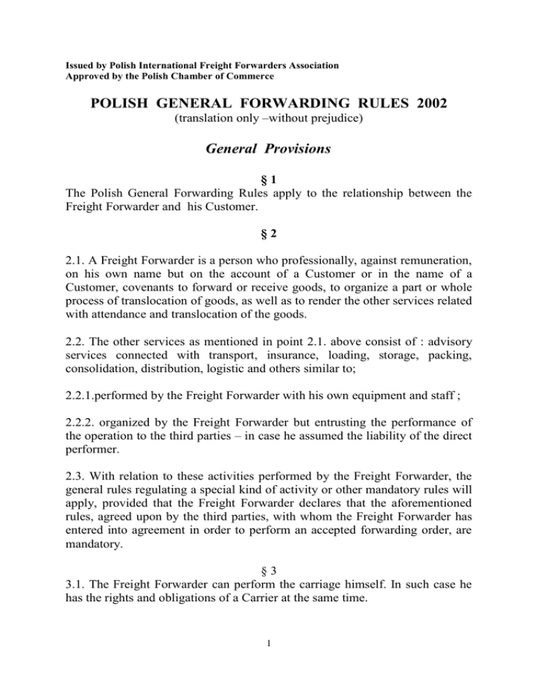 Issued by Polish International Freight Forwarders Association Approved by the Polish Chamber of Commerce POLISH GENERAL FORWARDING RULES 2002 (translation only –without prejudice) General Provisions §1 The Polish General Forwarding Rules apply to the relationship between the Freight Forwarder and his Customer. §2 2.1. A Freight Forwarder is a person who professionally, against remuneration, on his own name but on the account of a Customer or in the name of a Customer, covenants to forward or receive goods, to organize a part or whole process of translocation of goods, as well as to render the other services related with attendance and translocation of the goods. 2.2. The other services as mentioned in point 2.1. above consist of : advisory services connected with transport, insurance, loading, storage, packing, consolidation, distribution, logistic and others similar to; 2.2.1.performed by the Freight Forwarder with his own equipment and staff ; 2.2.2. organized by the Freight Forwarder but entrusting the performance of the operation to the third parties – in case he assumed the liability of the direct performer. 2.3. With relation to these activities performed by the Freight Forwarder, the general rules regulating a special kind of activity or other mandatory rules will apply, provided that the Freight Forwarder declares that the aforementioned rules, agreed upon by the third parties, with whom the Freight Forwarder has entered into agreement in order to perform an accepted forwarding order, are mandatory. §3 3.1. The Freight Forwarder can perform the carriage himself. In such case he has the rights and obligations of a Carrier at the same time. 1 3.2. The Freight Forwarder has the rights and duties of the carrier provided that: 3.2.1. he performs carriage by his own means of transportation and issues his own transport document; 3.2.2. he acts as sea carrier or multimodal transport operator issuing his own bill of lading or FIATA bill of lading called the Negotiable FIATA Multimodal Transport Bill of Lading ; 3.2.3. he performs a carriage by means of transportation owned by the third party, but issues his own transport document (contracting carrier) ; 3.2.4. he accepts transport order. §4 Within the meaning of this Rules a Customer is a person / party concluding a contract with the Freight Forwarder, ordering to the Freight Forwarder the performance of services or activities, or a person entering into the rights of that party. §5 The provisions of these Rules do not apply to the forwarding of money, securities, documents, jewelry and other valuables. OFFERS §6 The Freight Forwarder’s offer covers only that services which are explicitly listed therein and is valid only to the date specified for its acceptance. 6.1. The Freight Forwarder’s offer and agreements concerning the rates and services (his own, or third parties) cover only the goods specified in the order and assume typical conditions of the performance of such offer or agreement. 6.2. Unless otherwise stipulated each offer or quotation remains valid subject to immediate acceptance by the Customer and if the order refers to that offer. 6.3. In case either component of the offer changes, due to the external circumstances and beyond the control of the Freight Forwarder, the prices quoted or agreed upon will be corrected accordingly up to the moment the change occurred. The correction made due to the circumstances the Freight 2 Forwarder is liable for should be accepted by the other party Customer. – i.e. the 6.4. In case the Freight Forwarder, depending on the situation, applied “all inclusive” rates, it is understood that unless otherwise agreed upon, the said rates contained all costs born by the Forwarder during performance of the forwarding process. The Forwarding Contract §7 7.1. By a Contract of Forwarding the Freight Forwarder is obliged -against remuneration - within the frameworks of his commercial activity, to forward or receive the goods, or to organize other services related with transport. 7.2. The Forwarding Contract is considered to be concluded upon receipt of the order by the Freight Forwarder unless he informs the Customer without delay about the refusal of its acceptance. Forwarding Order §8 8.1. The Freight Forwarder performs the activities on the basis of the Customer’s order. 8.2. The order does not require for its validity to be in a written form, however, in order to avoid any misunderstandings and misrepresentation it is recommended the order to be issued or confirmed in writing or by fax, e-mail. 8.2.1. The Freight Forwarder is not liable for the consequences of errors and misunderstanding resulting from orders received verbally or by telephone. 8.2.2. The Freight forwarder is not liable for the consequences of supplementary instructions provided by the Customer directly to the third parties engaged in the performance of the forwarding process. 8.3. The order should indicate the scope of services ordered, the kind and properties of goods, marks and numbers of the collies (packages), number of pieces, weight, cubic measurements and any others particulars and documents necessary for its proper executions. 3 8.4. The Customer is obliged to ensure that the order is correct and complete. The Customer is liable to the Freight Forwarder and third parties for any consequences resulting from inaccurate, incomplete or incorrect data, also with regard to the particulars contained in documents, correspondence or indicated on the goods /e.g. weight, dimensions and properties/ as well as from defective packing of the goods etc., even if the inaccuracy, incompleteness or incorrectness occurred without his fault. 8.5. The Freight Forwarder is not obliged but is entitled to verify whether information given in the order are complete and correct. 8.6. The Freight Forwarder is entitled but not obliged to verify the genuineness of the signatures and power of attorney of the signatories to sign the order